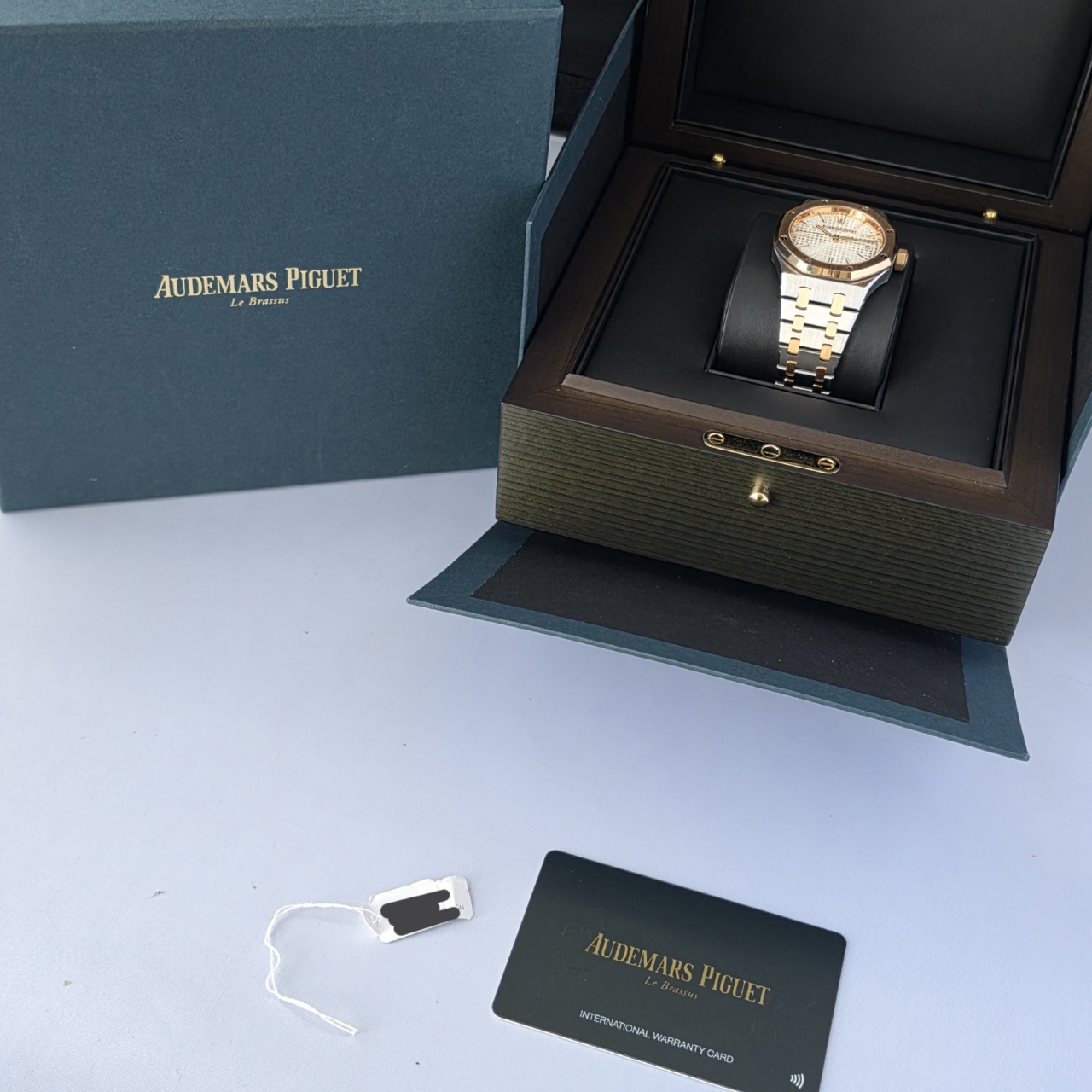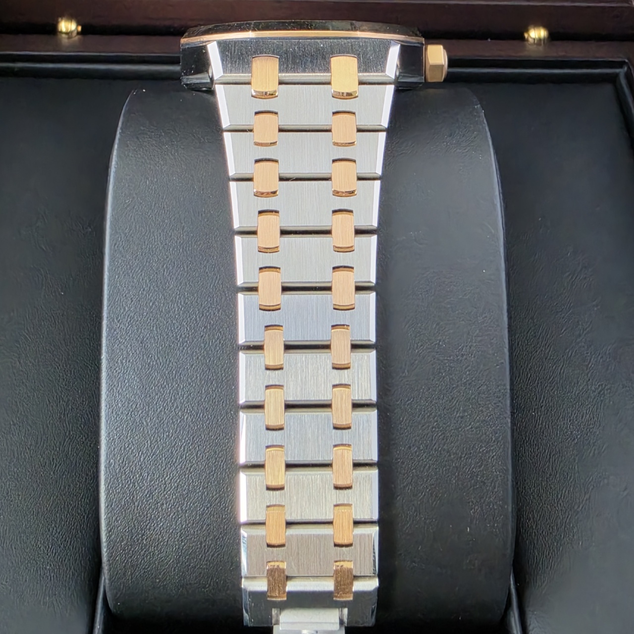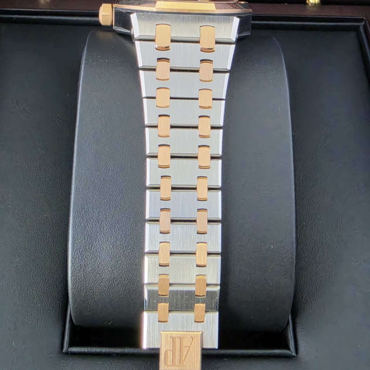 Dial: Silver-toned dial with “Grande Tapisserie” pattern, pink gold applied hour-markers and Royal Oak hands with luminescent coating.