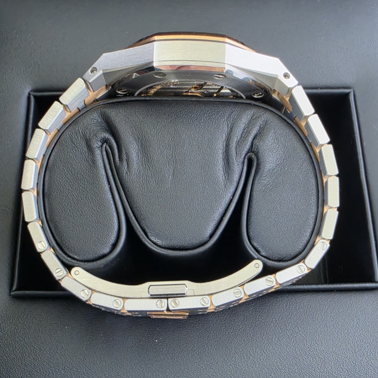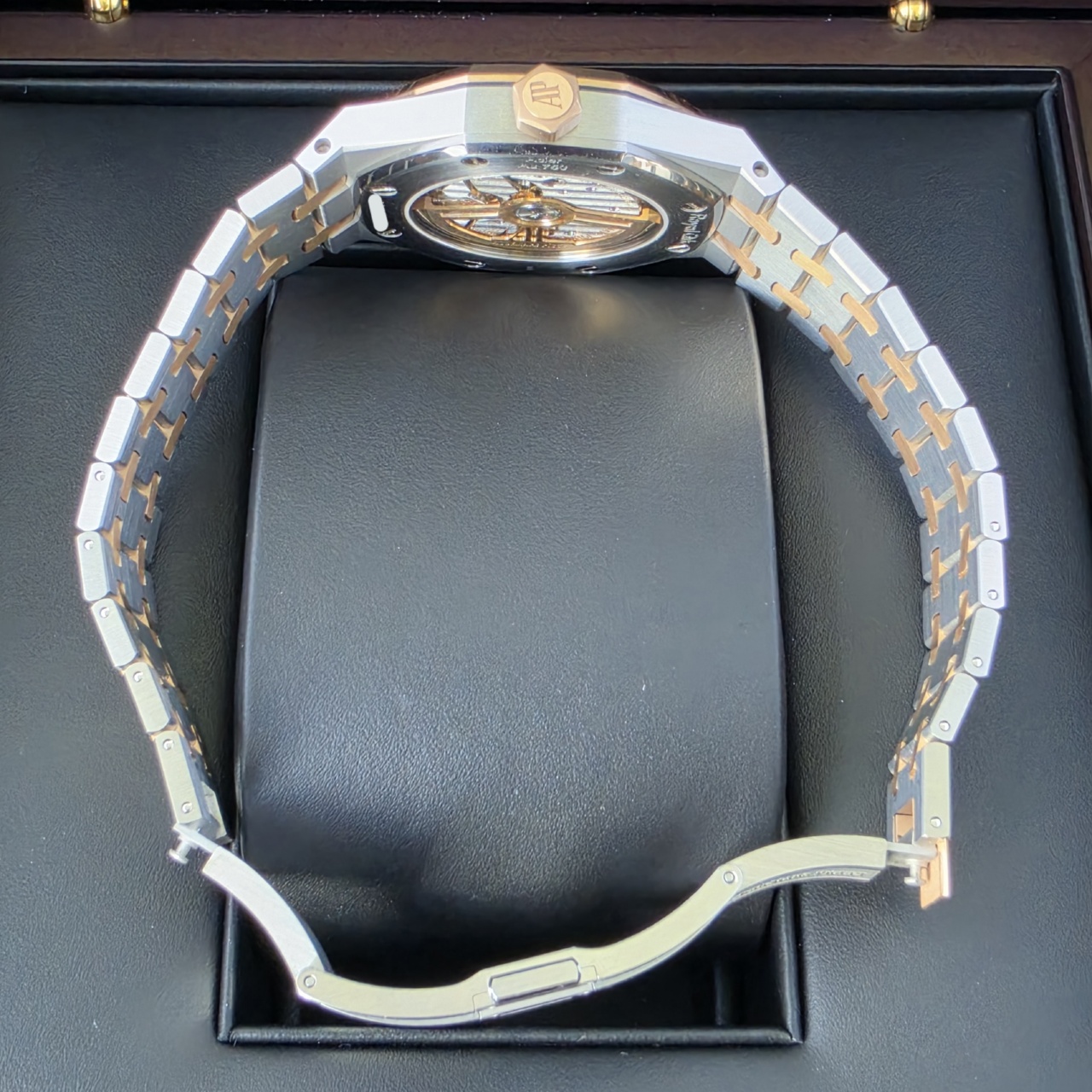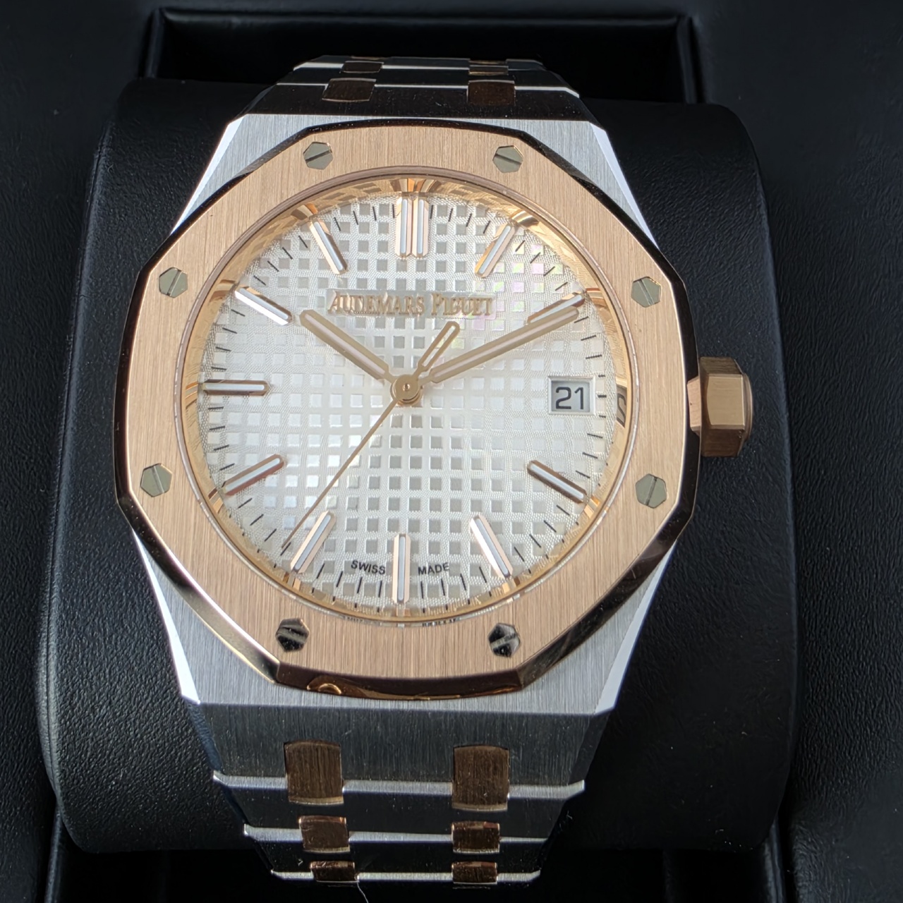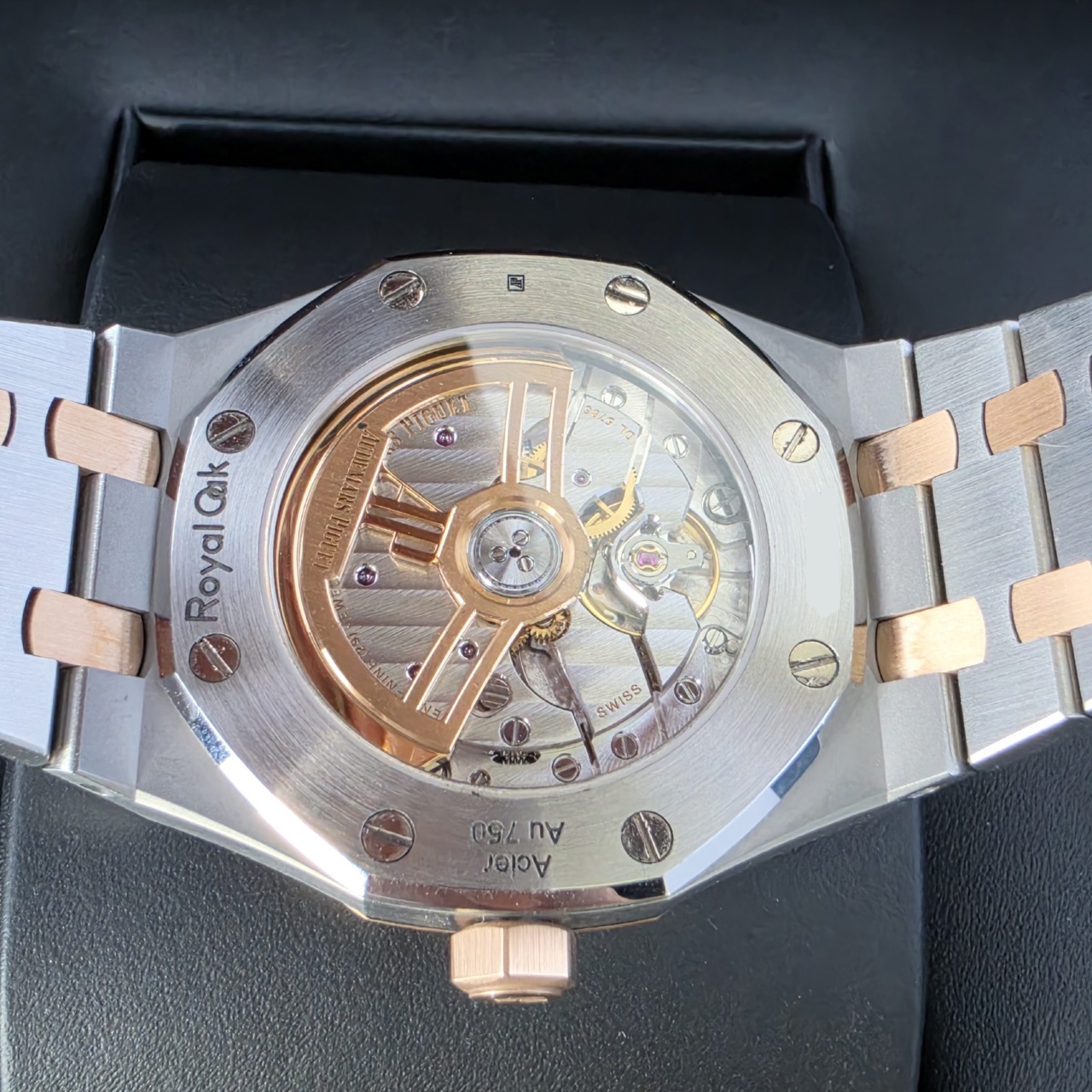 Dial: Silver-toned dial with “Grande Tapisserie” pattern, pink gold applied hour-markers and Royal Oak hands with luminescent coating.