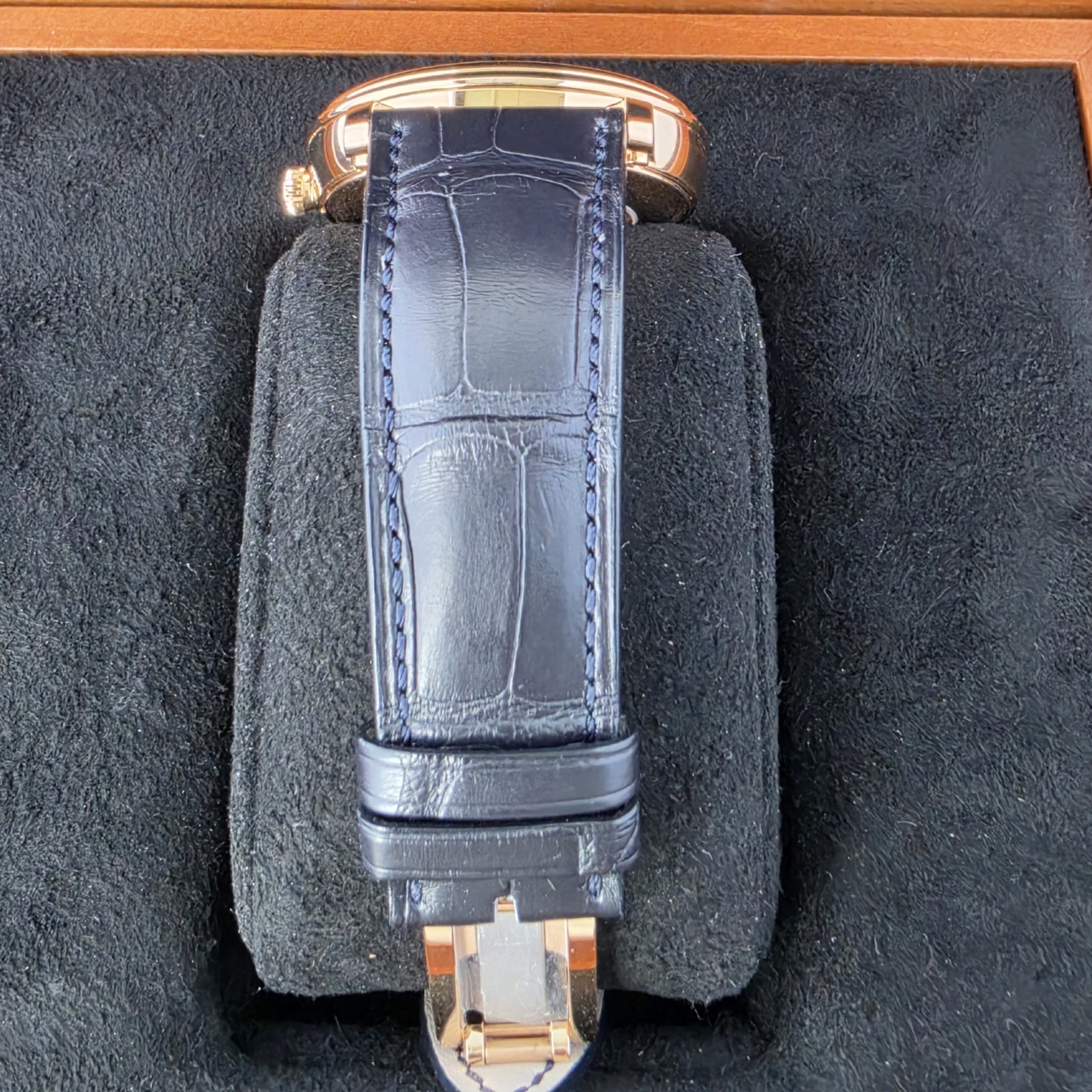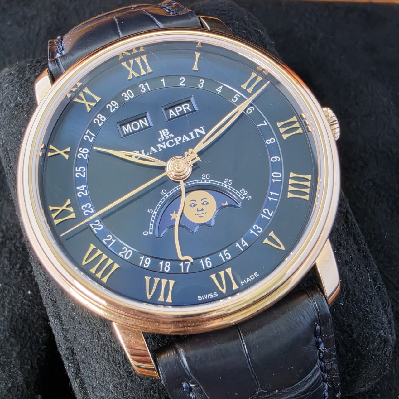 Dial: Blue dial with a fine sun-ray finish, Polished rose gold hands w/Applied polished rose gold stylized Roman numeral hour markers and Complete calendar function