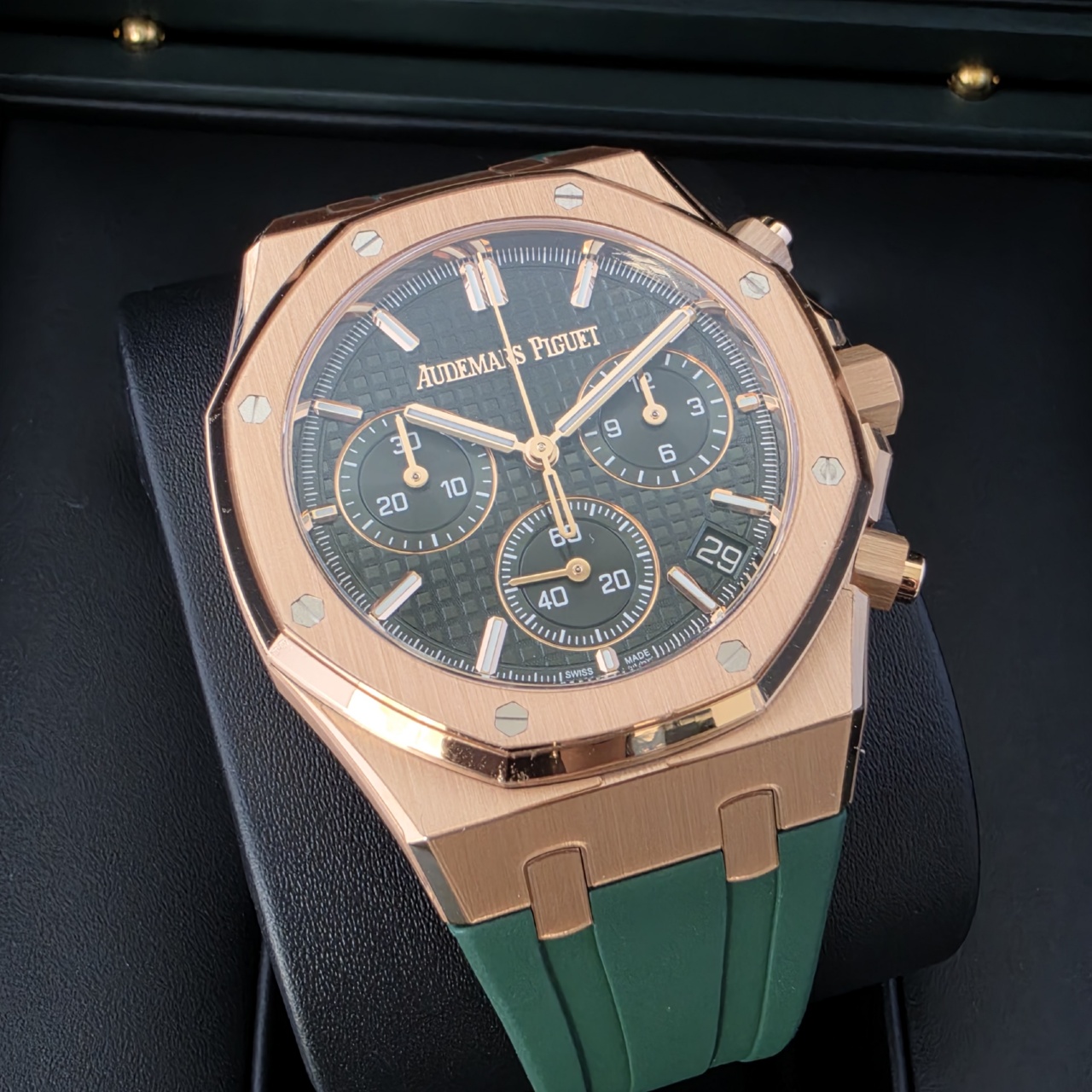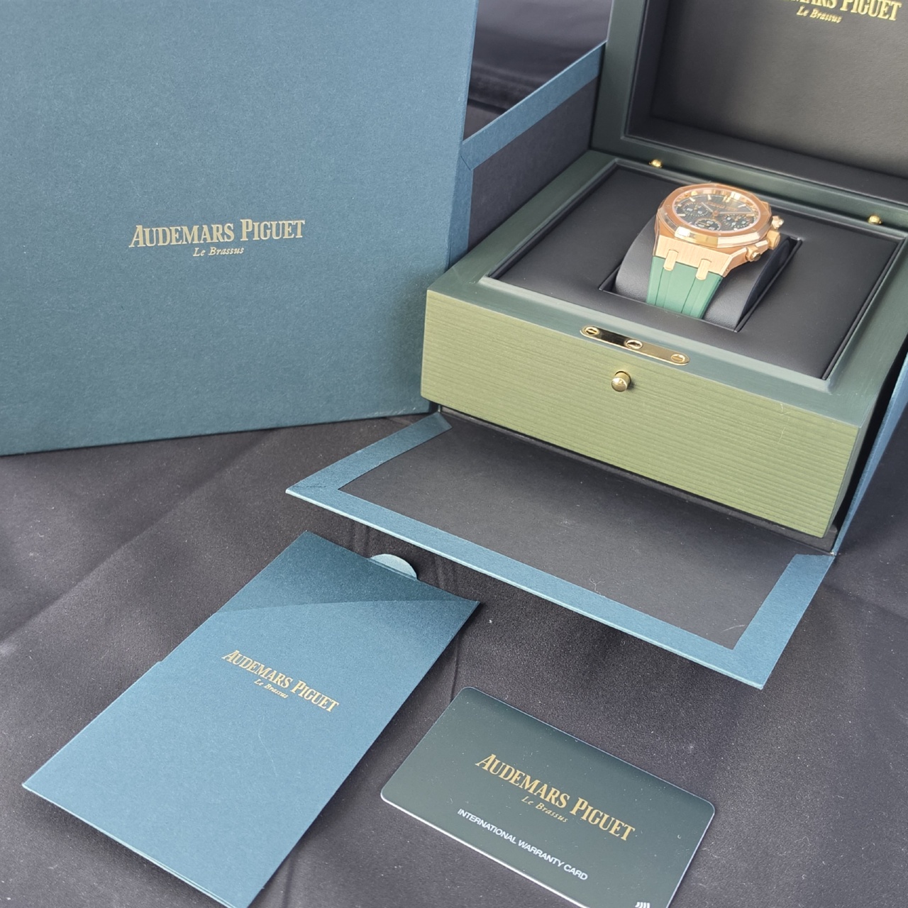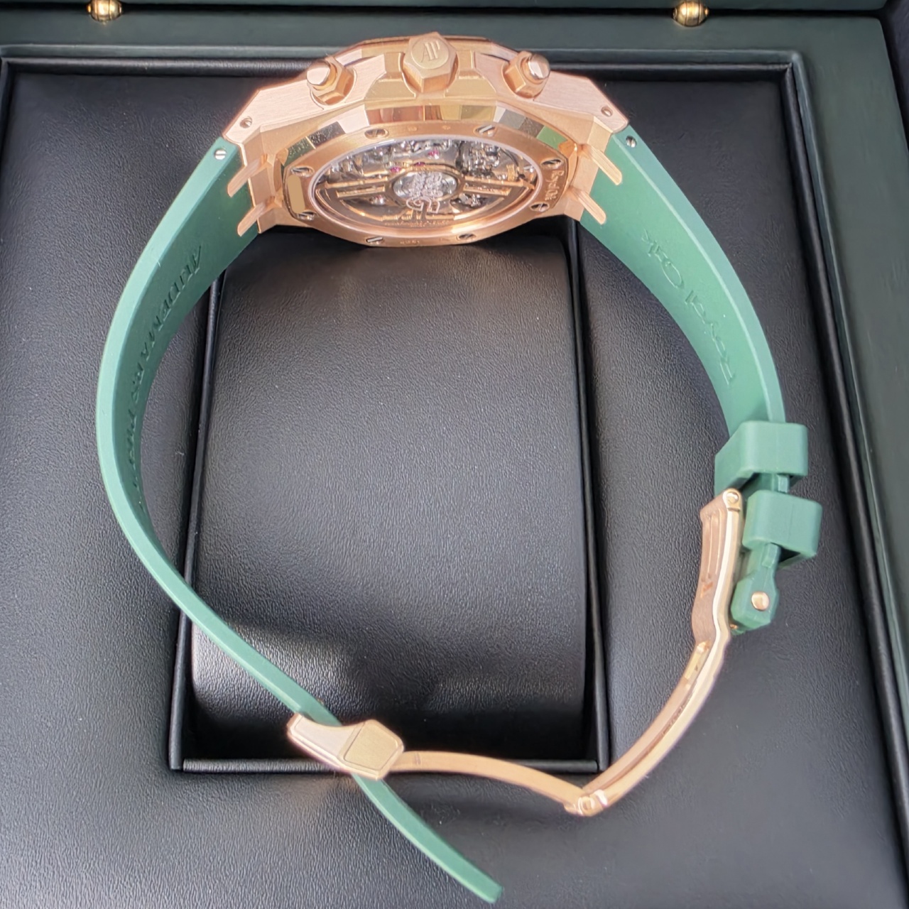 Dial: Khaki green dial with “Grande Tapisserie” pattern, green counters, pink gold applied hour-markers and Royal Oak hands with luminescent coating