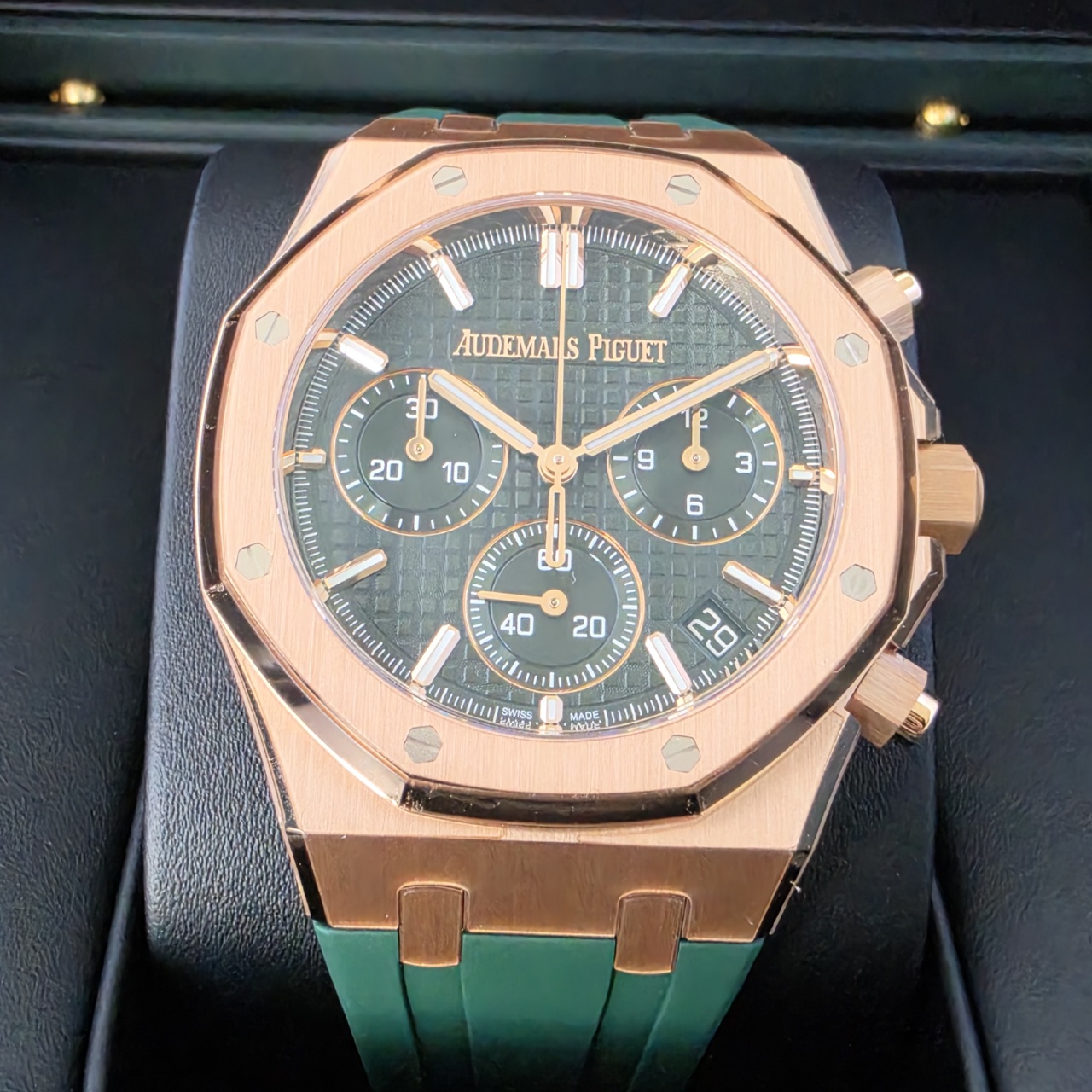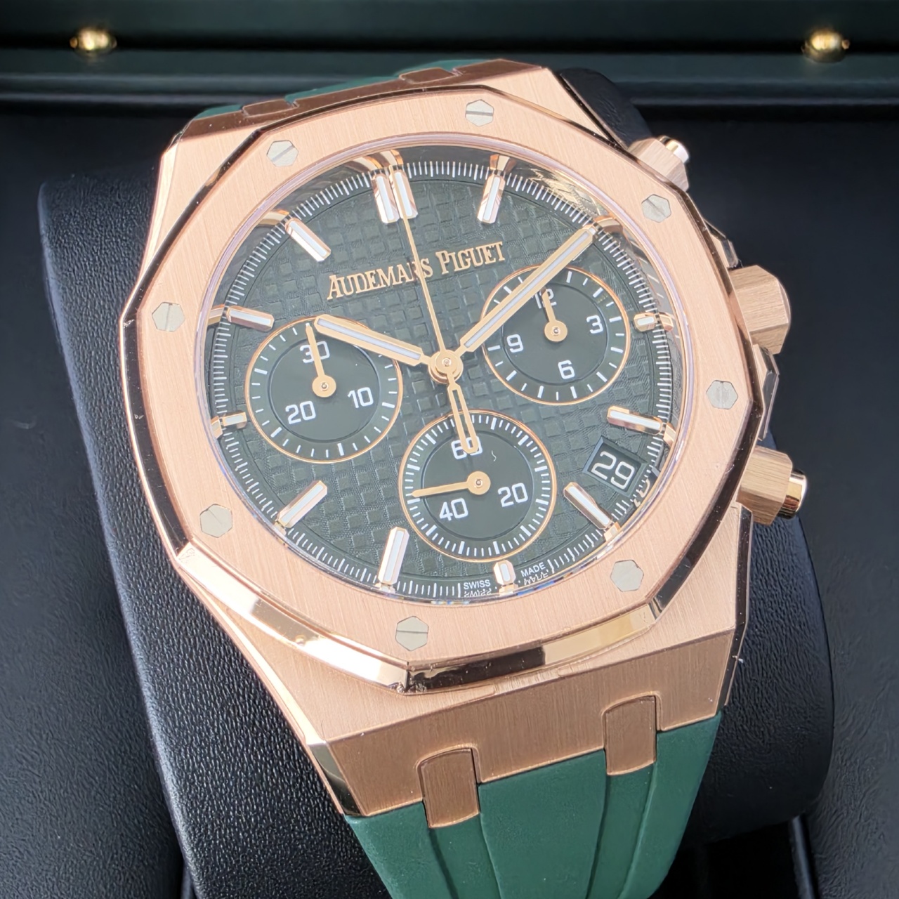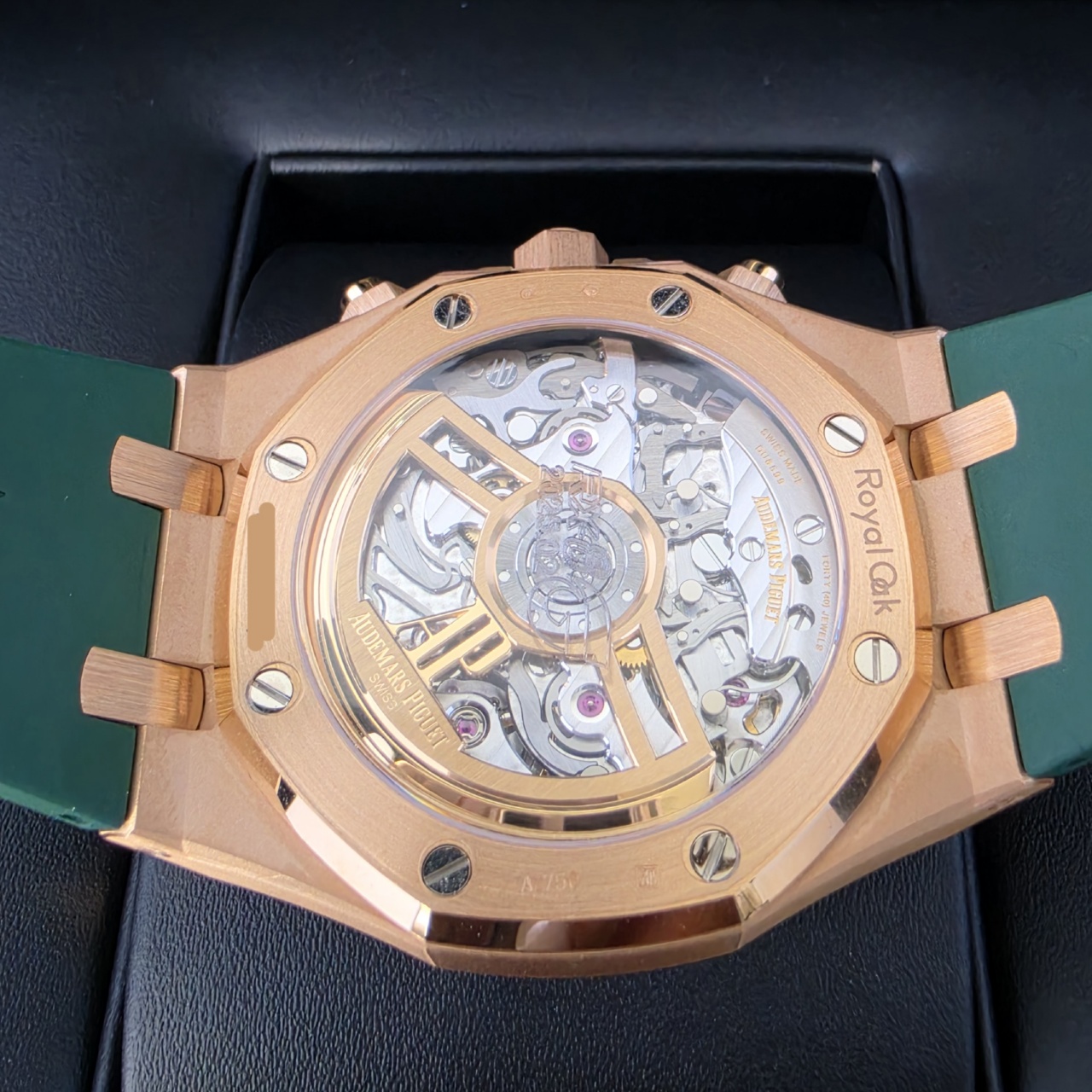 Dial: Khaki green dial with “Grande Tapisserie” pattern, green counters, pink gold applied hour-markers and Royal Oak hands with luminescent coating