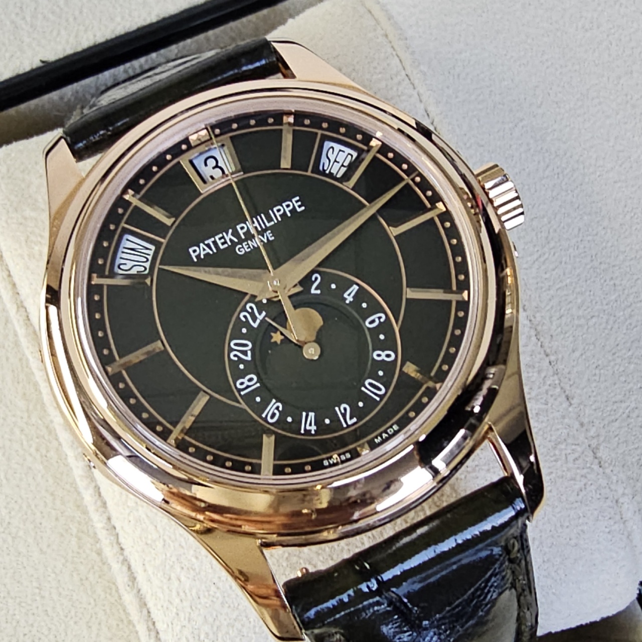 Dial: Olive green sunburst dial with black-gradient rim. Faceted rose gold dauphine hands and applied hour markers. Rose gold frame underlining the date aperture