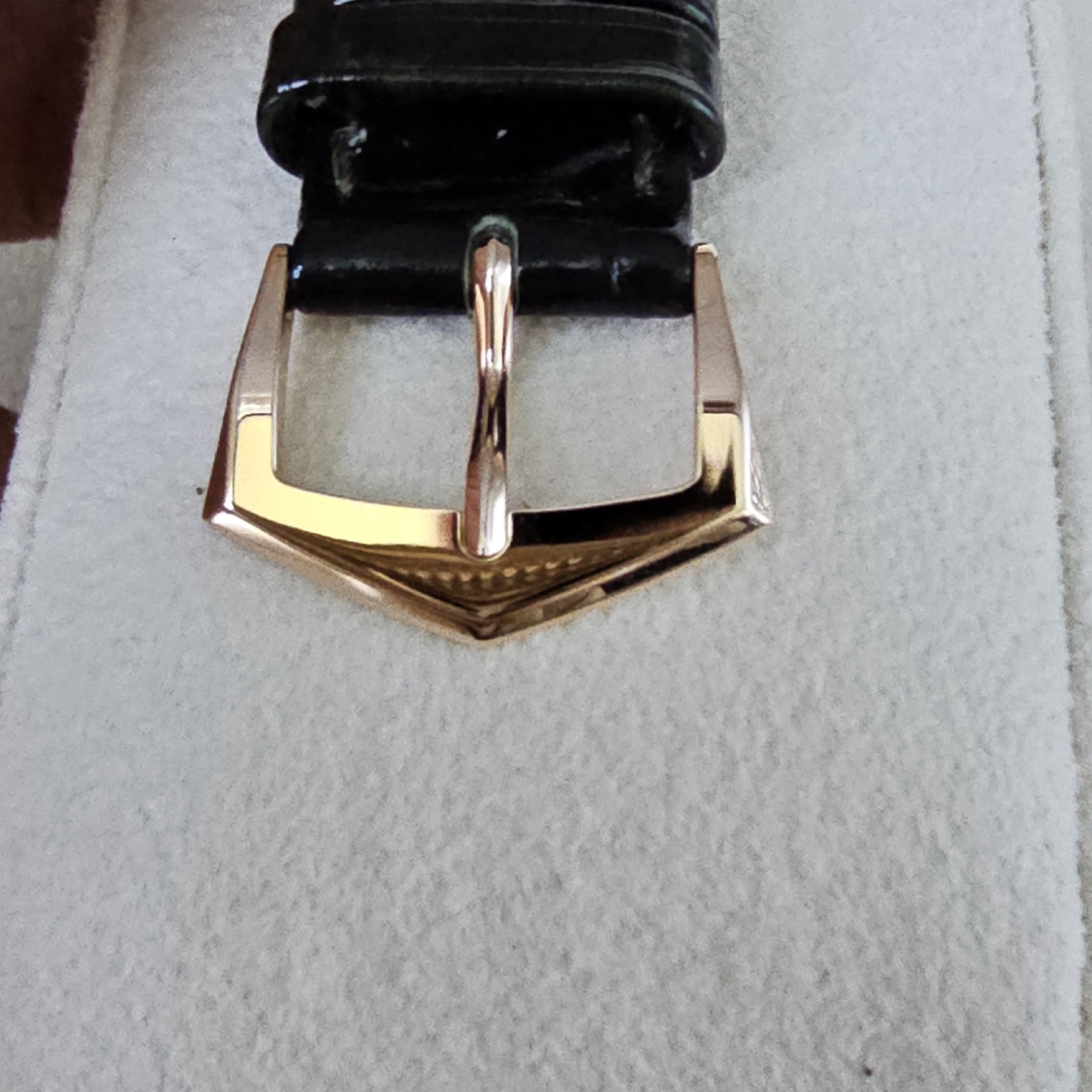 Bracelet: Alligator leather with square scales, hand-stitched, patinated two-tone green. Rose gold prong buckle.