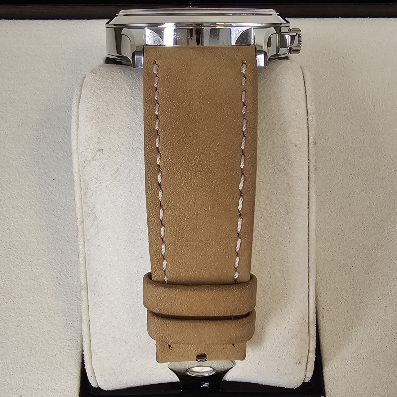 Bracelet: Calfskin, hand-stitched, grained taupe (originally fitted). Calfskin, nubuck finish, hand-stitched, beige (additional strap). Steel fold-over clasp.