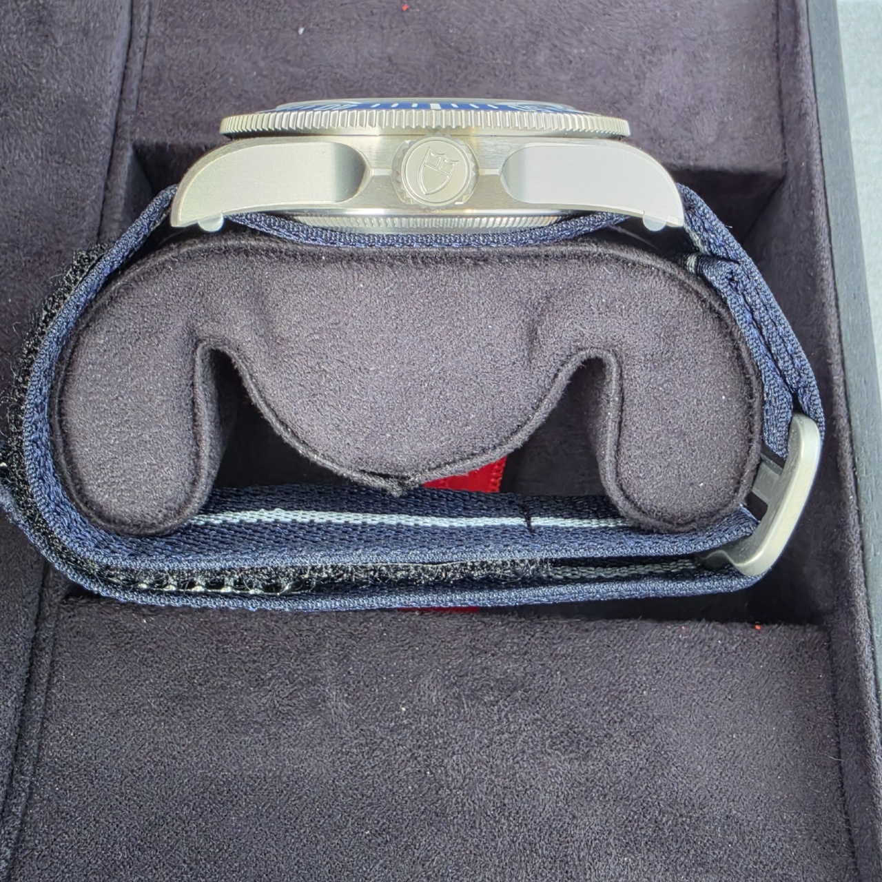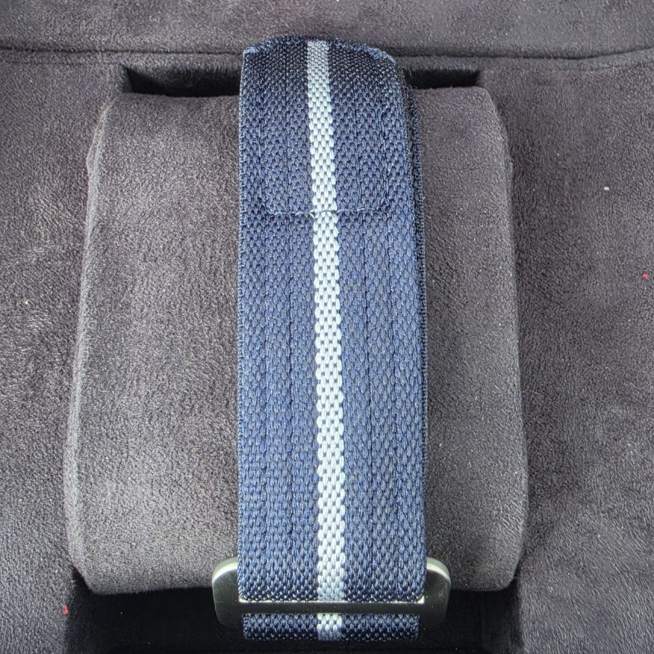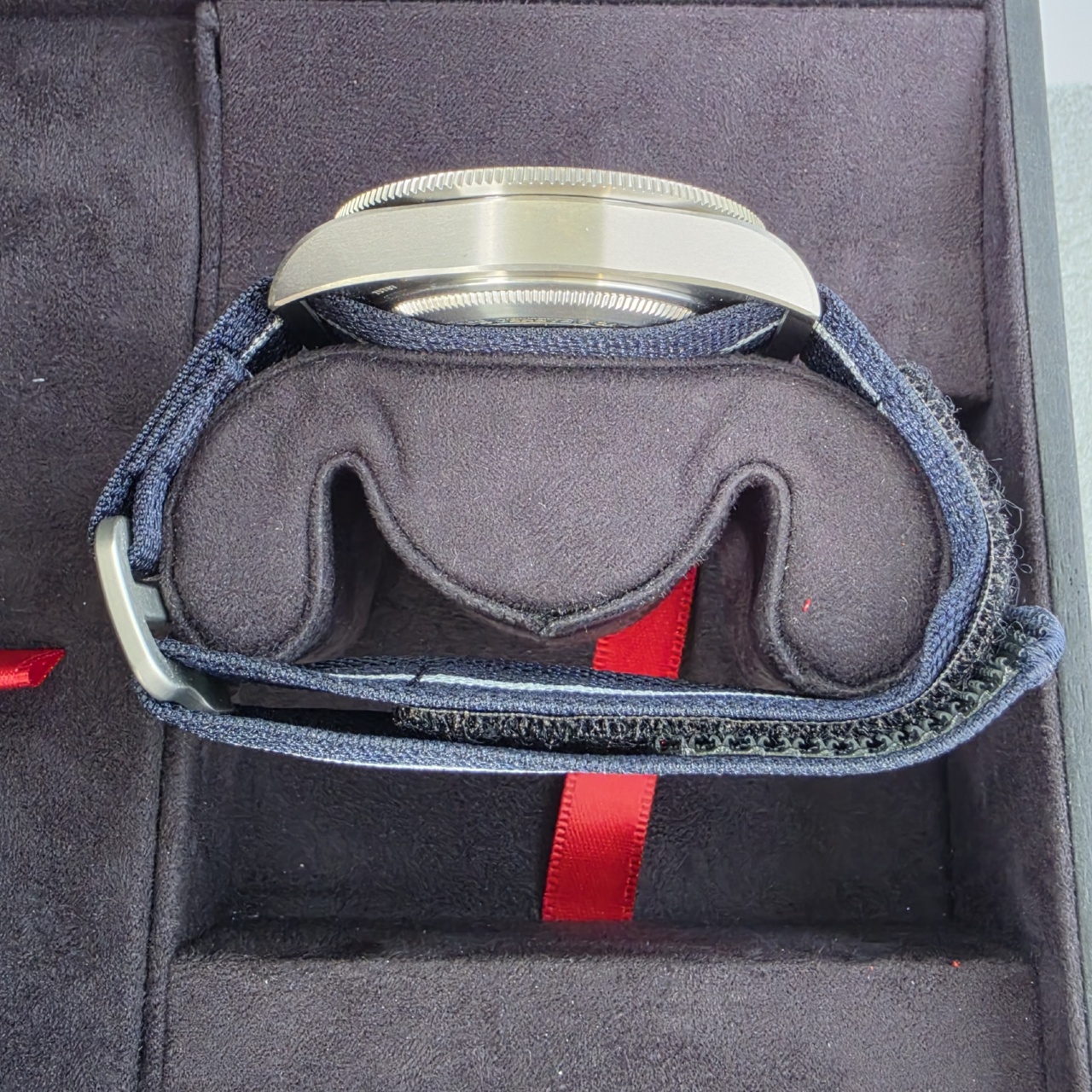 Bracelet: Navy blue fabric strap with grey central thread. Also comes w/ navy blue rubber strap with woven motif and titanium buckle