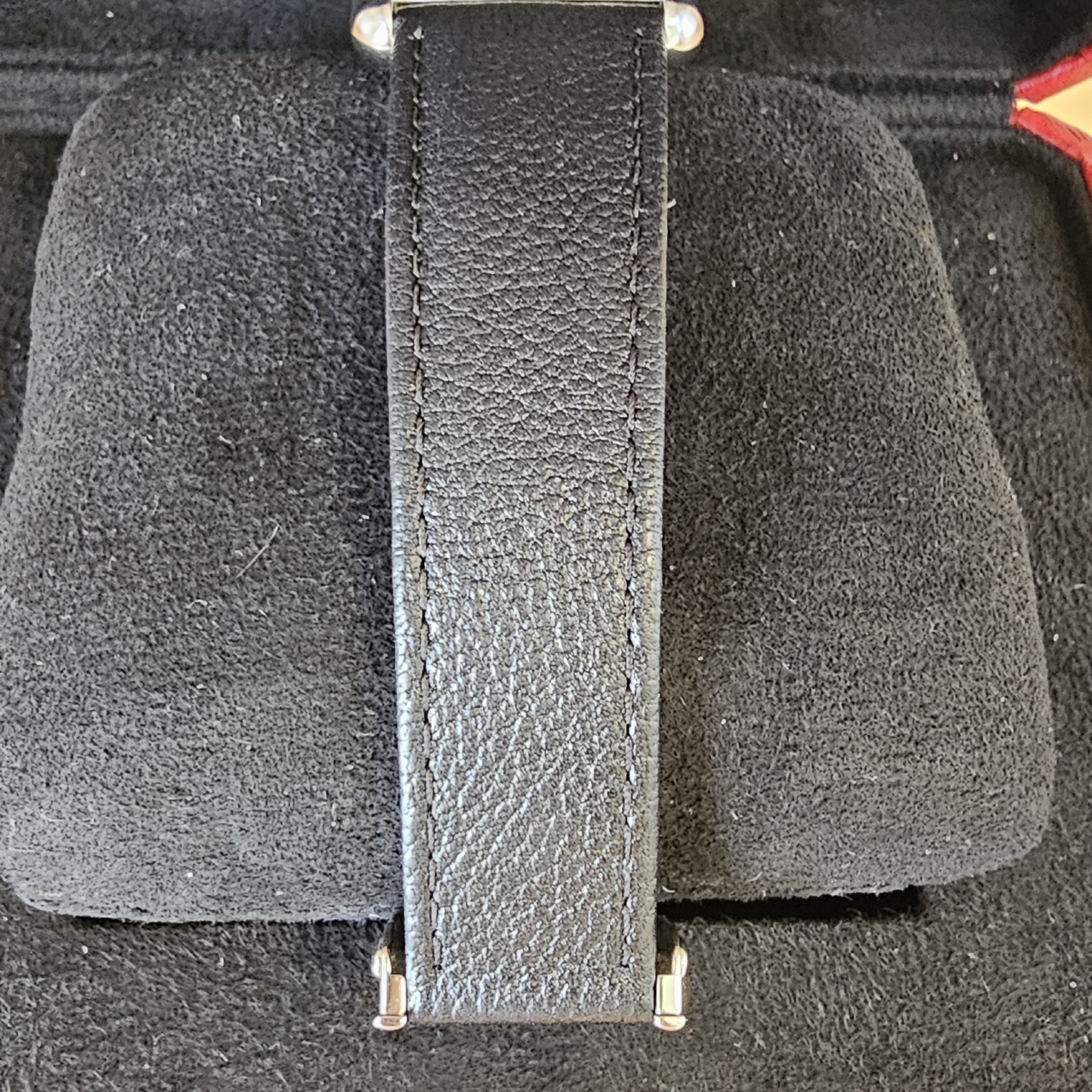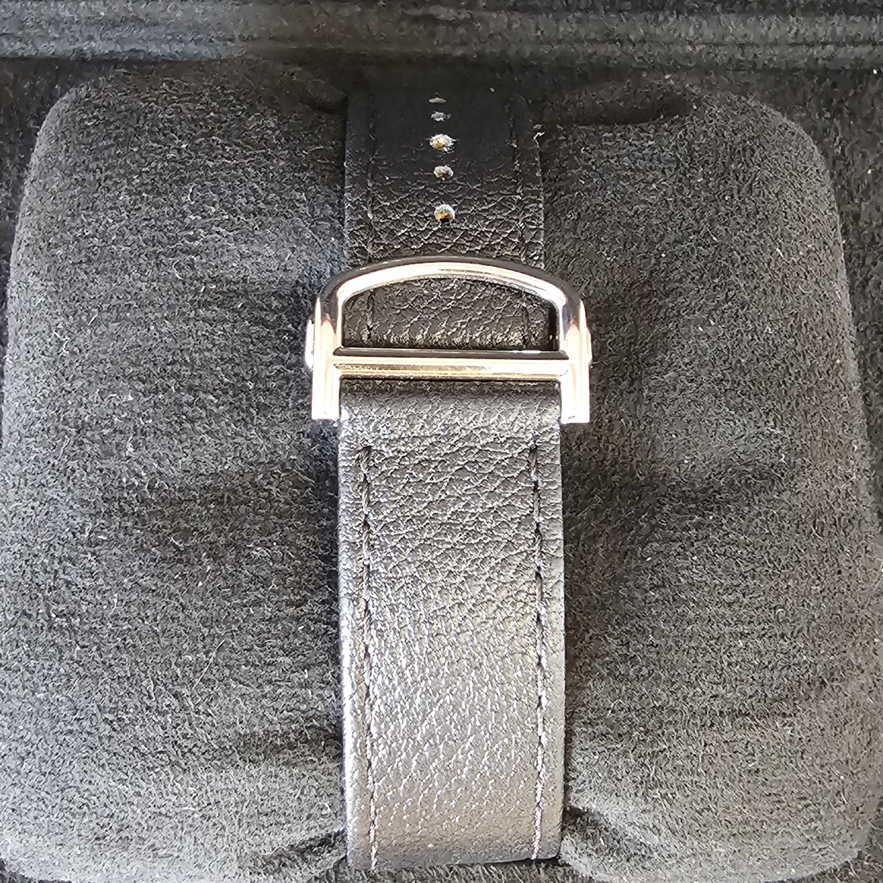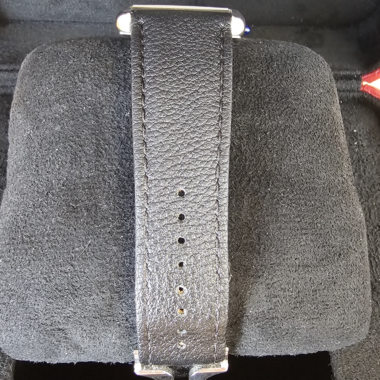 Bracelet: Black grained calfskin strap, interchangeable steel deployant buckle