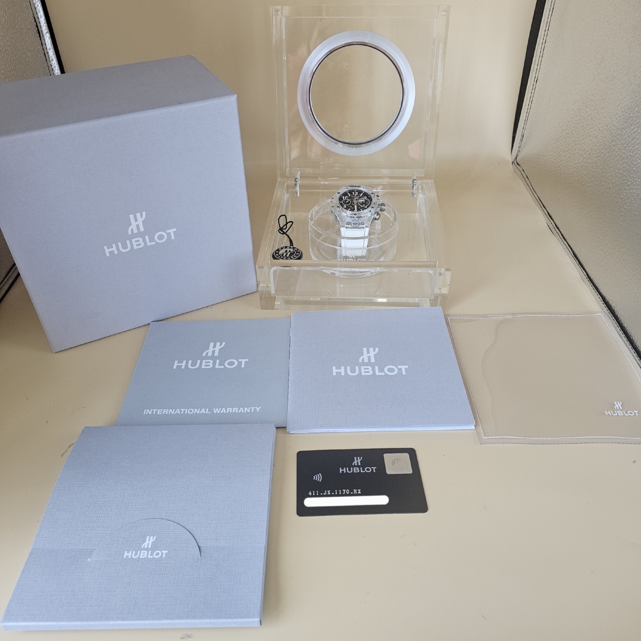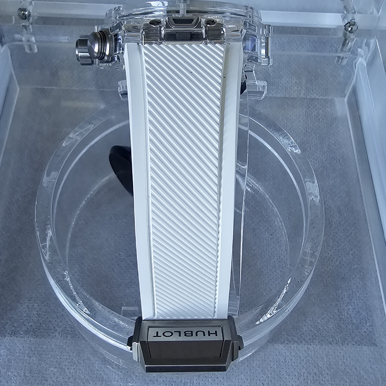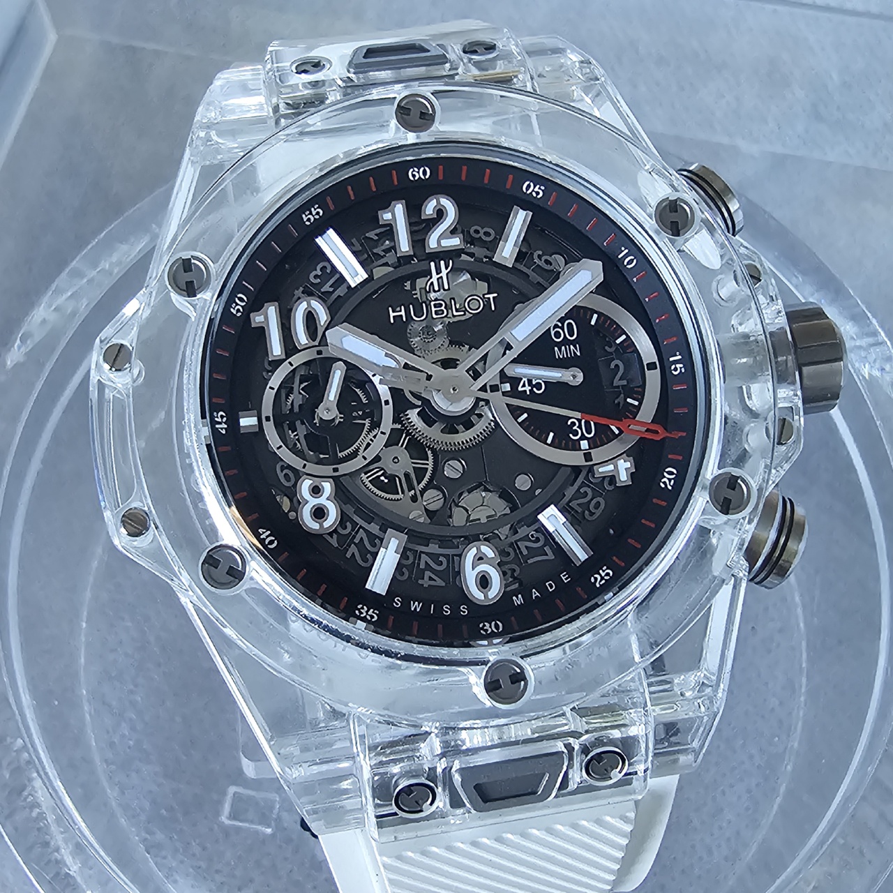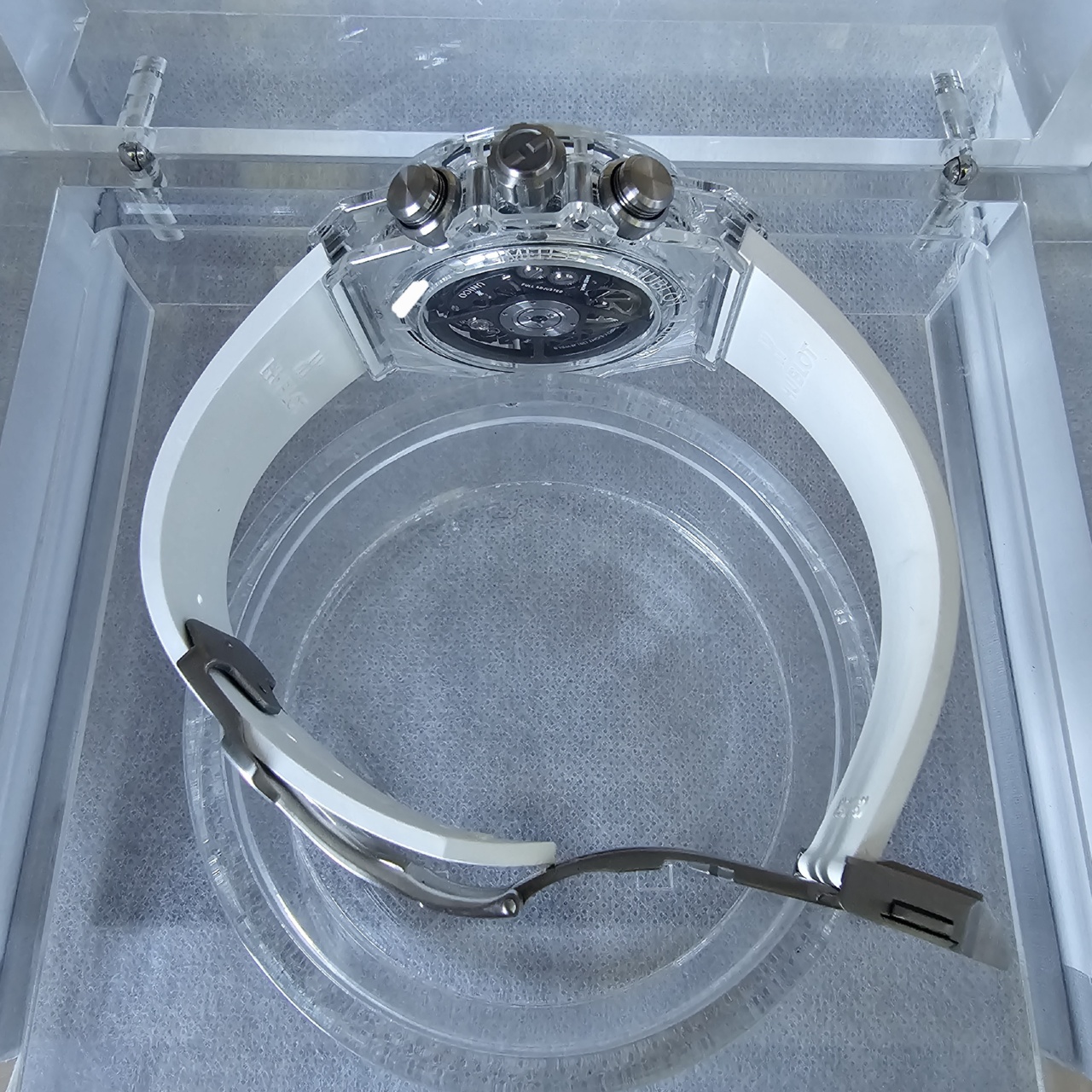 Case Material: Polished sapphire crystal case, sapphire crystal bezel, secured by 6 “H” style titanium screws.