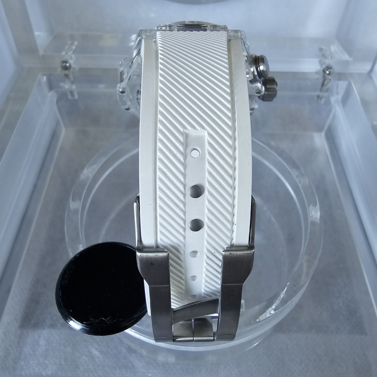 Dial: Sapphire crystal transparent dial showing the blackened movement.