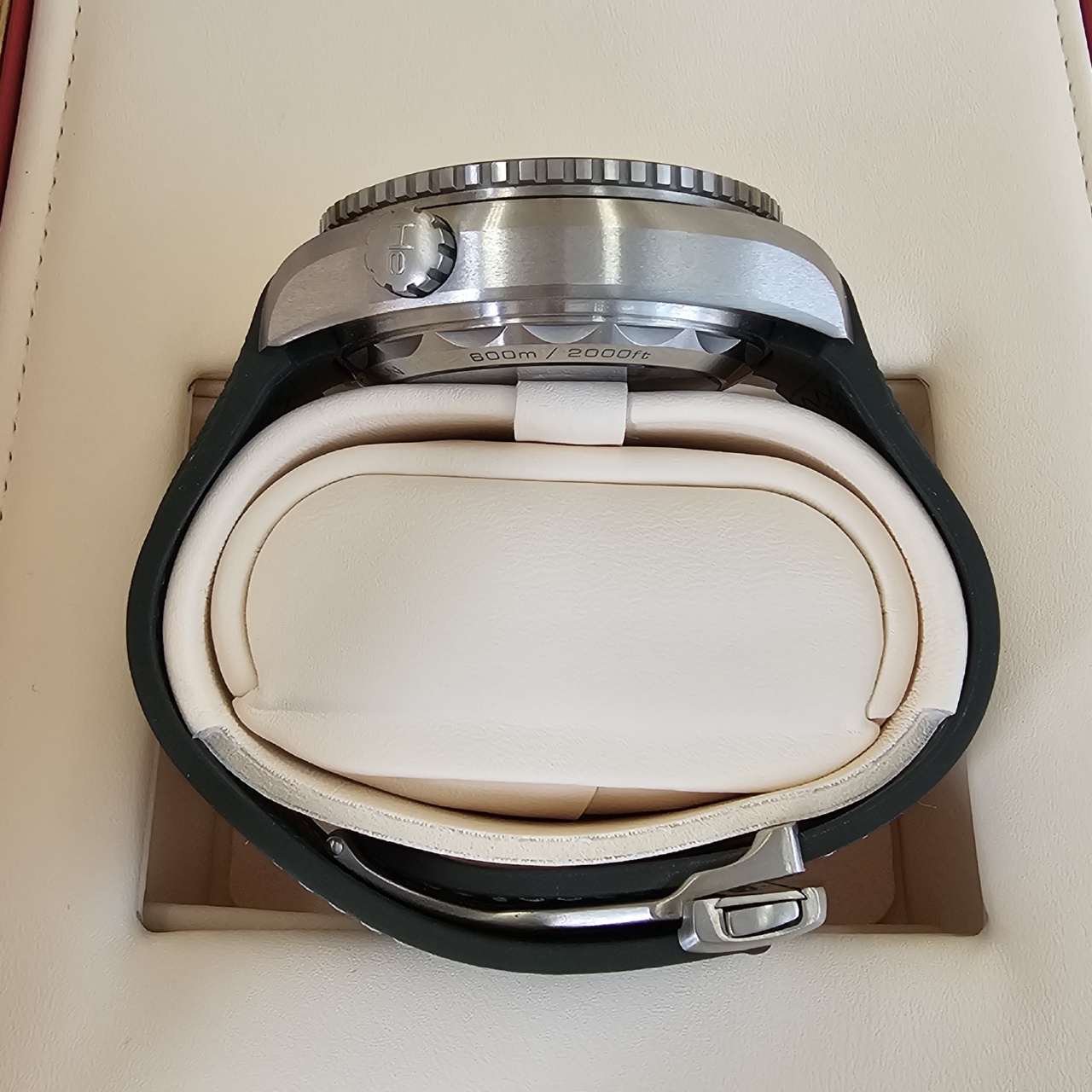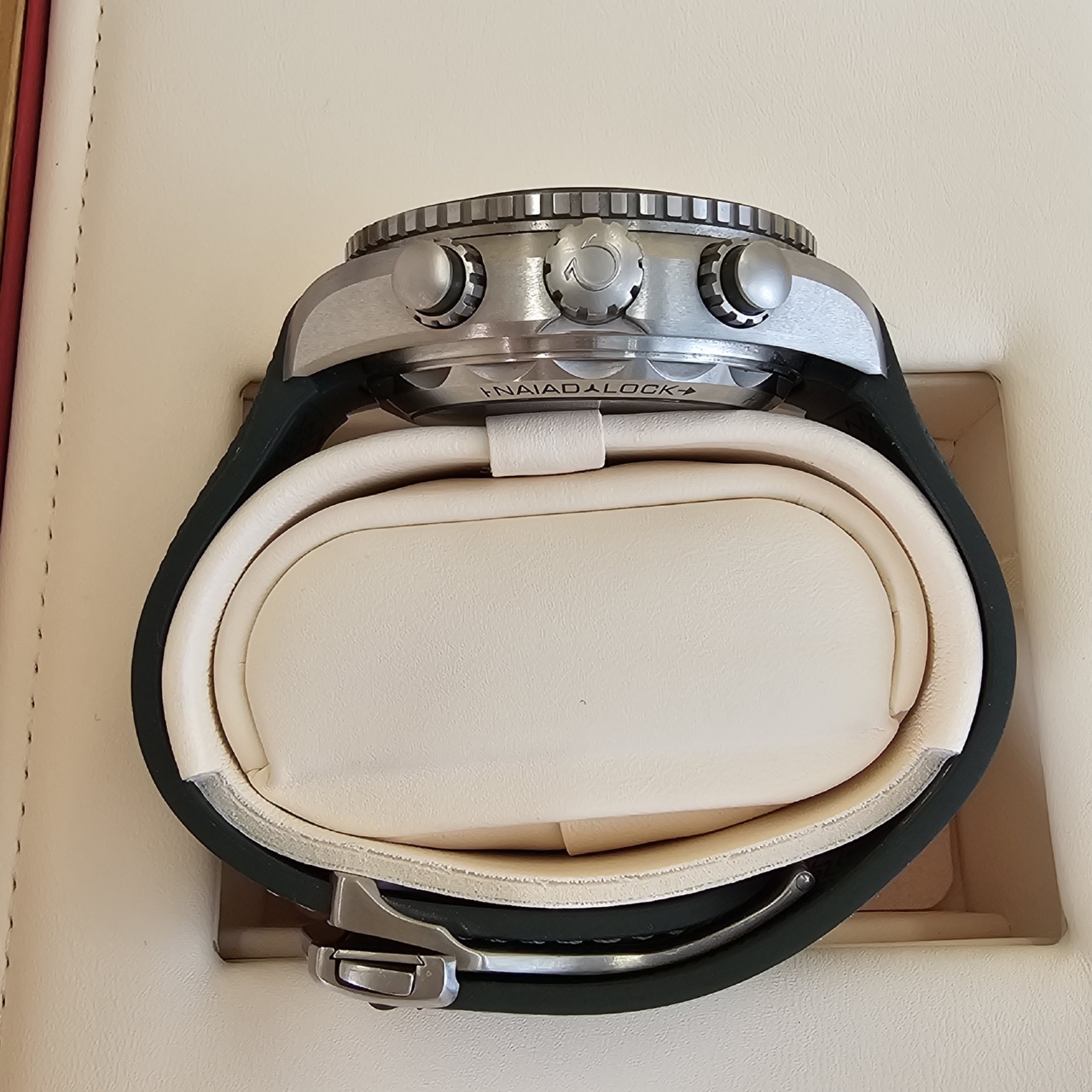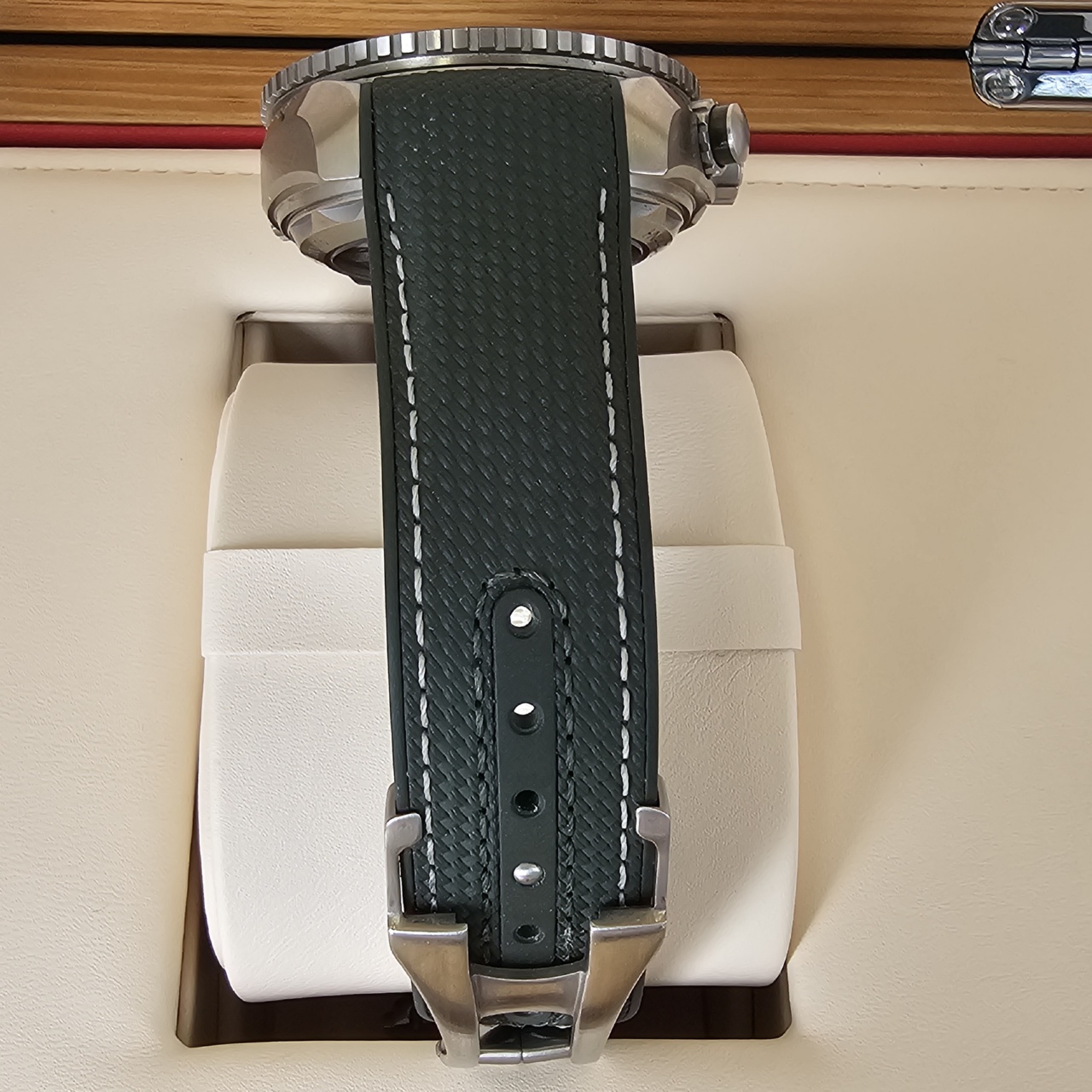 Dial: Brushed stainless steel w/ brushed green ceramic subdials, a green varnished number 12, along with transferred words in green and black