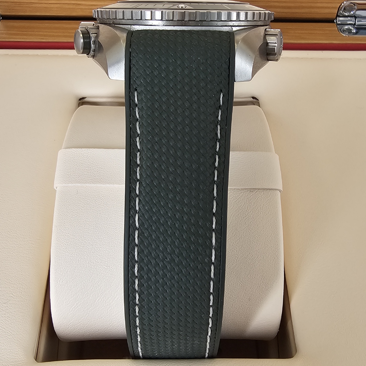 Bracelet: Integrated green rubber strap with a structured pattern and light grey and green stitching on Foldover clasp