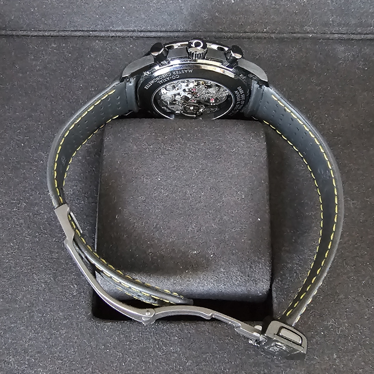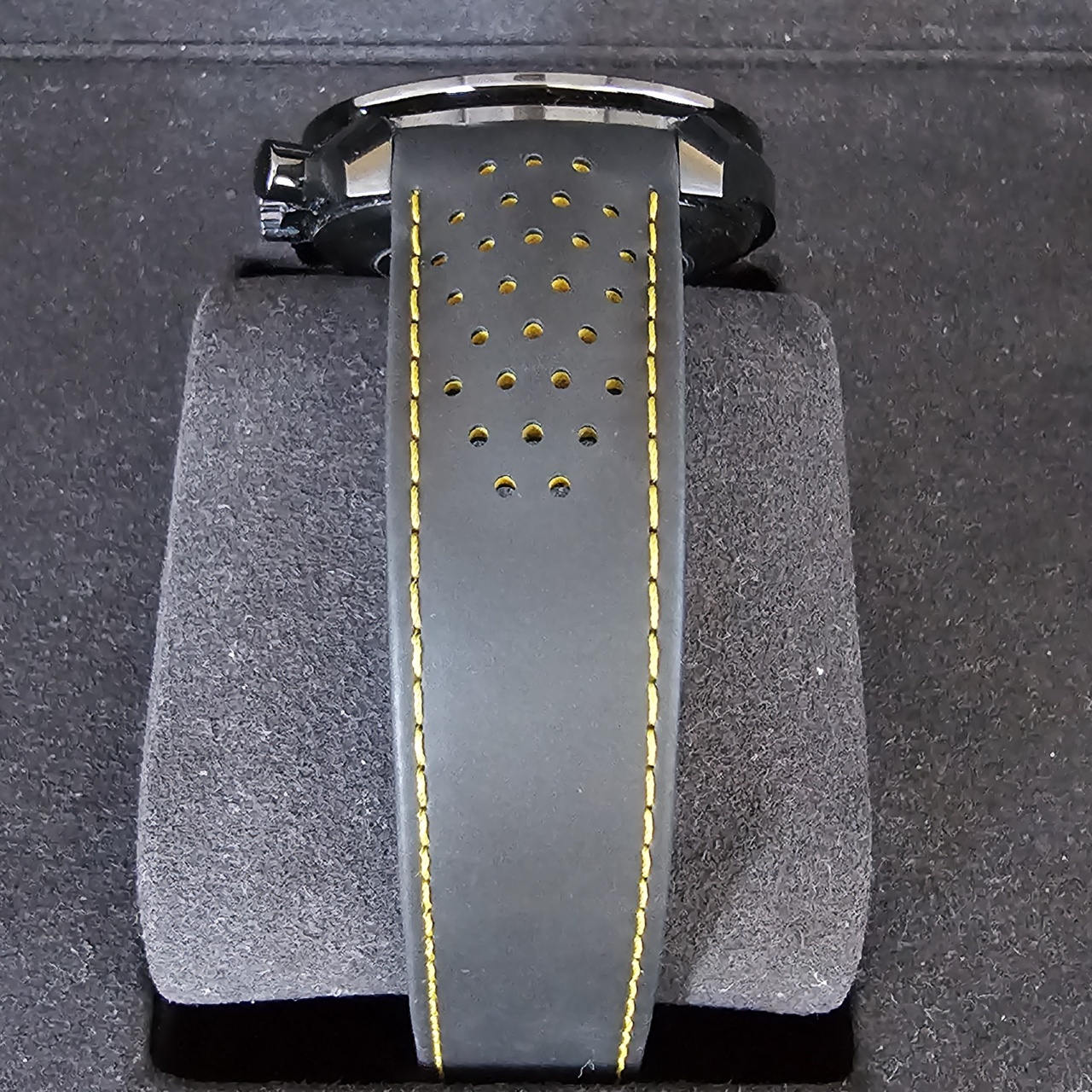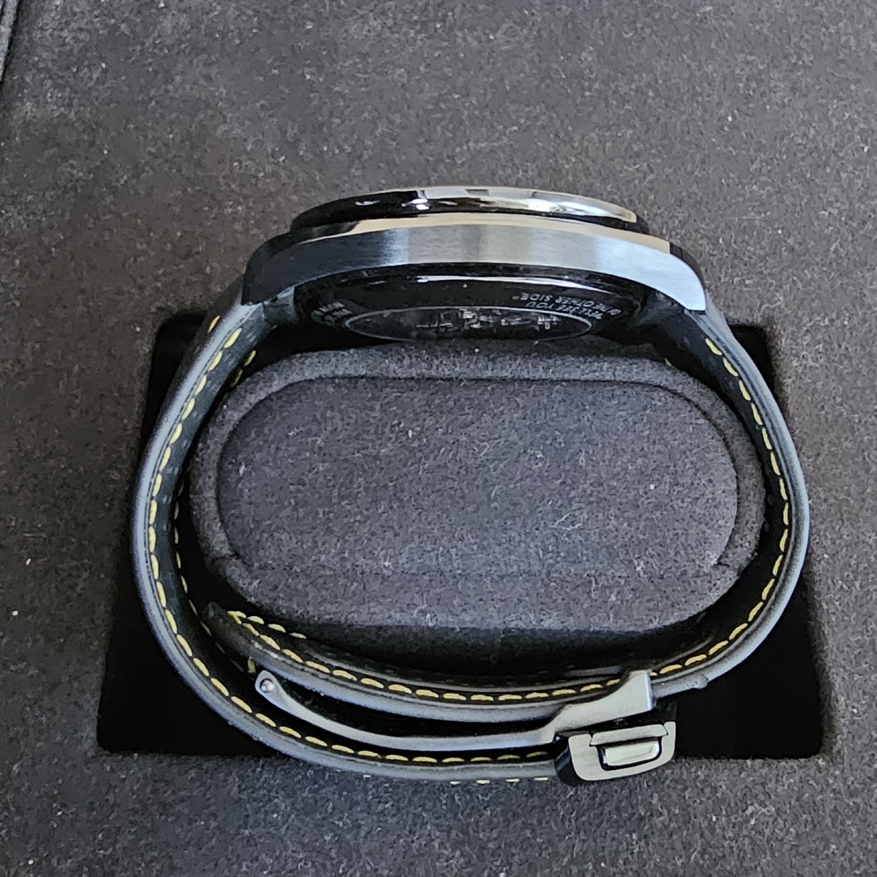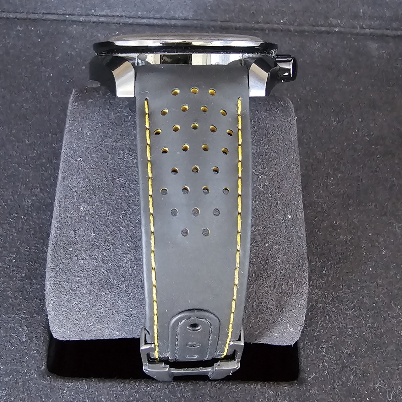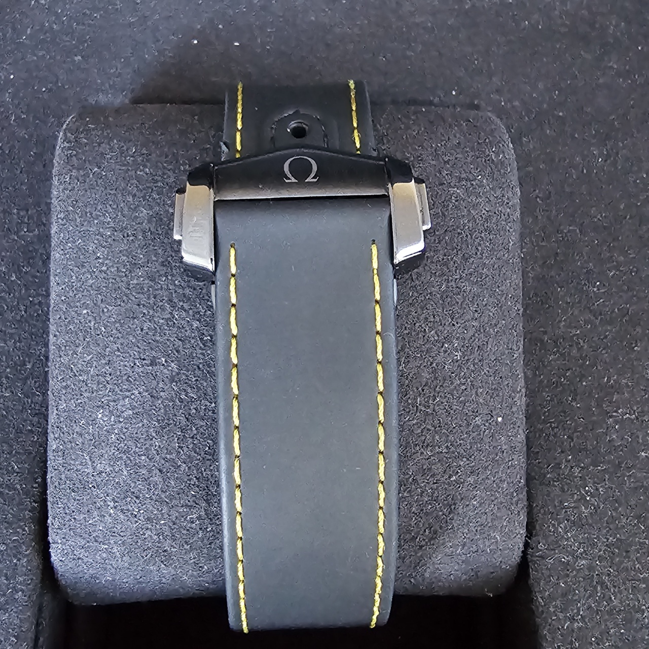 Bracelet: Perforated black leather strap with a yellow rubber interior with ceramic pin buckle and oem omega nato strap