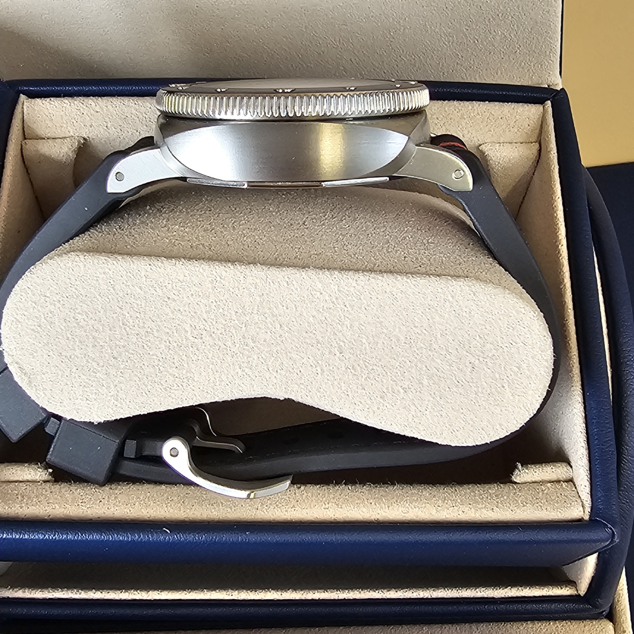 Dial: Blue sun-brushed with luminous hour markers and dots. Date at 3 o’clock, small seconds at 9 o’clock