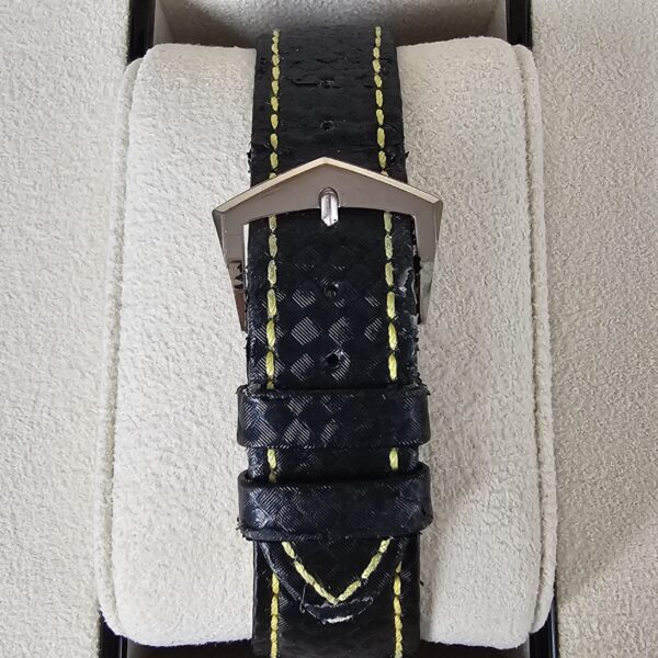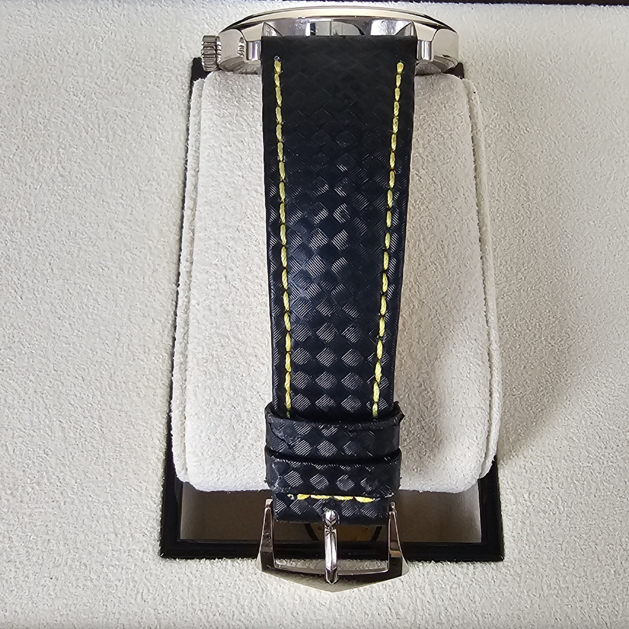 Dial: Ebony black, center embossed with “carbon” motif, gold applied numerals with white luminescent coating.