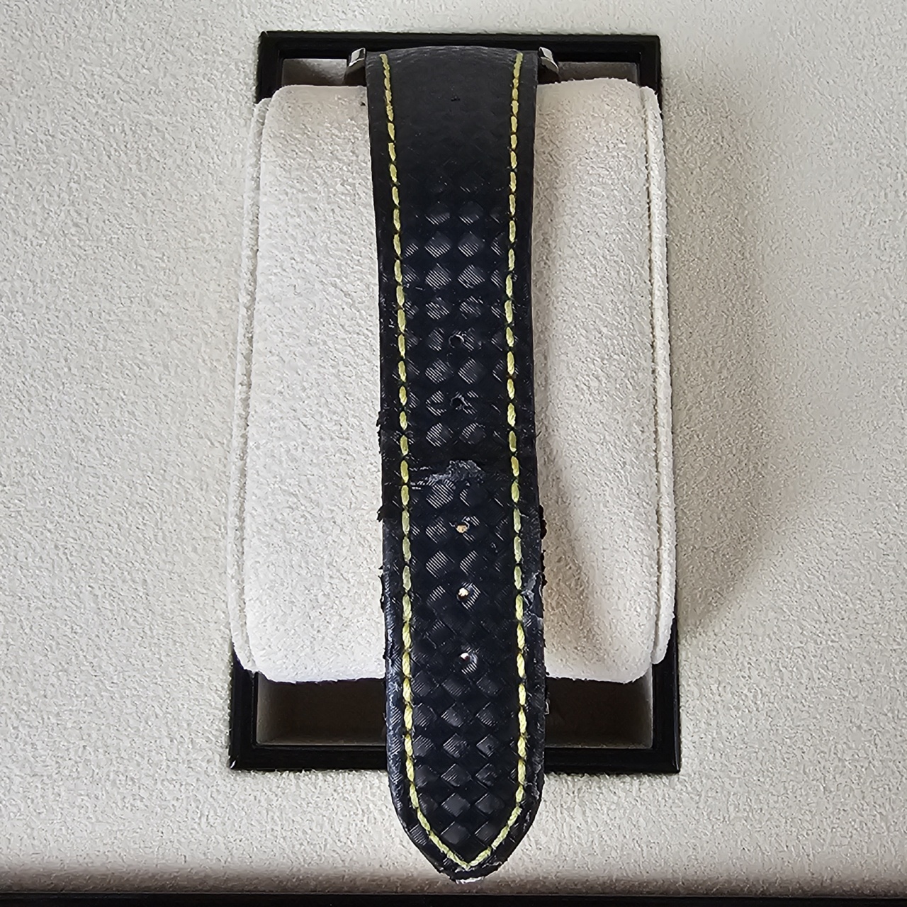 Bracelet: Calfskin, embossed with “carbon” motif, black. Prong buckle.