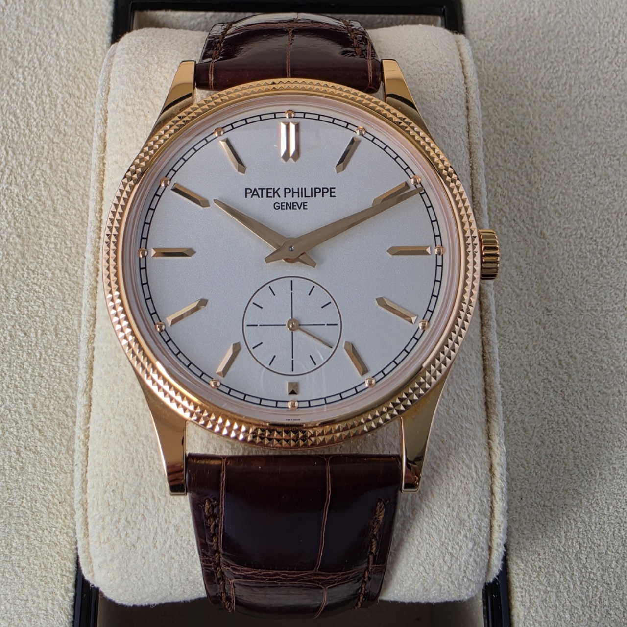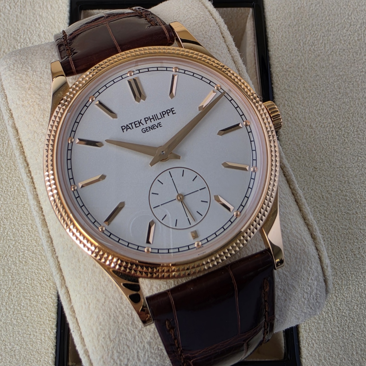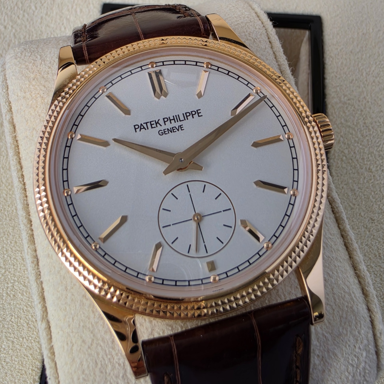 Simply Stunning! This is the latest Calatrava in 18k Rose gold with silvery graibed dial with applied hour markers, it has to be one of the most desirable dress pieces on the market.