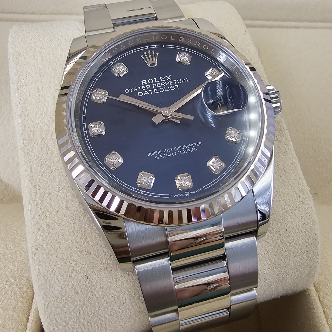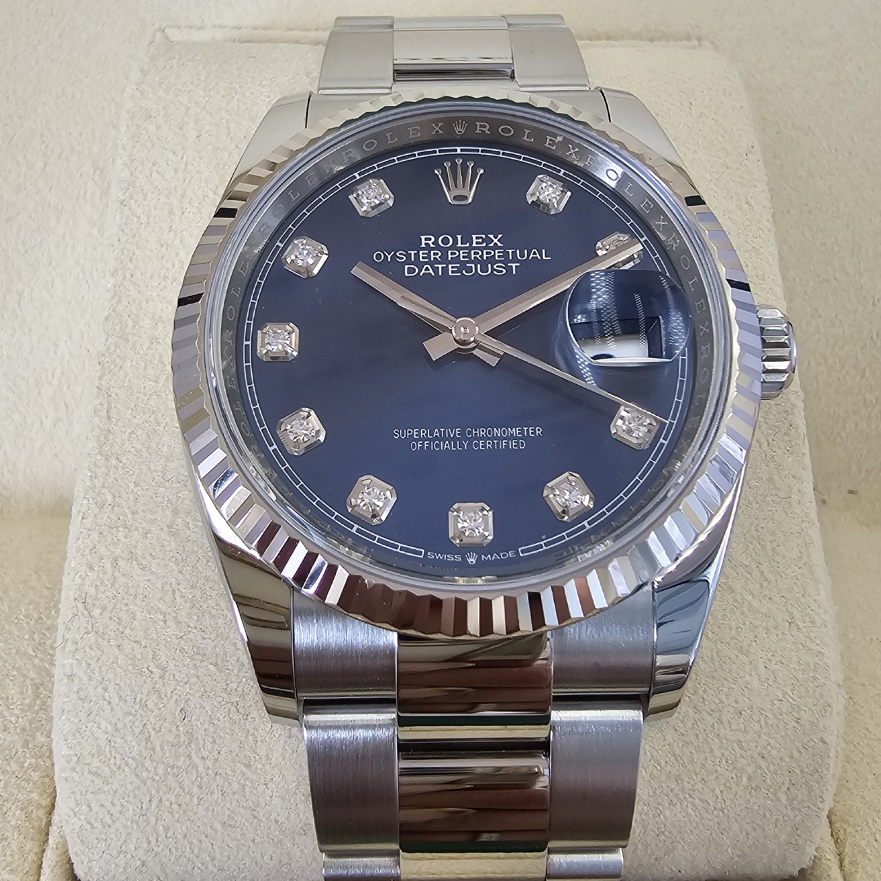 Dial: Blue dial w/ 10 diamond hour markers surrounded in 18k white gold