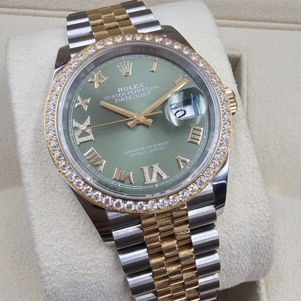 Dial: Olive green set with diamonds w/Roman VI and IX in 18 ct gold, set with 24 diamonds
