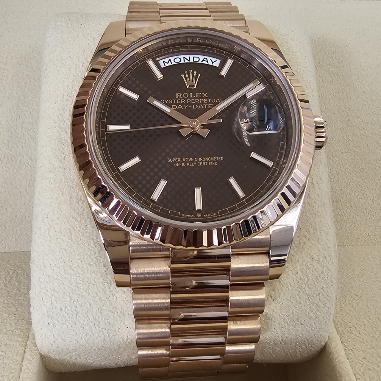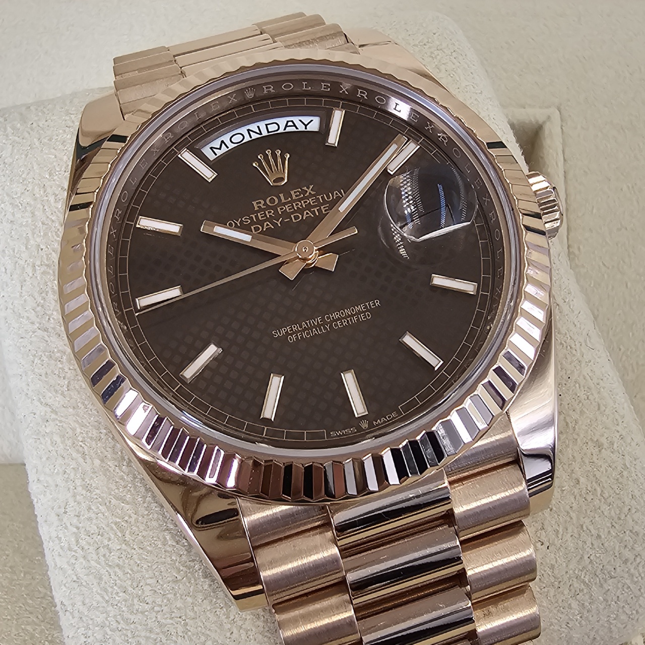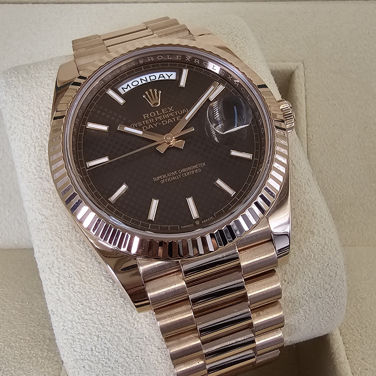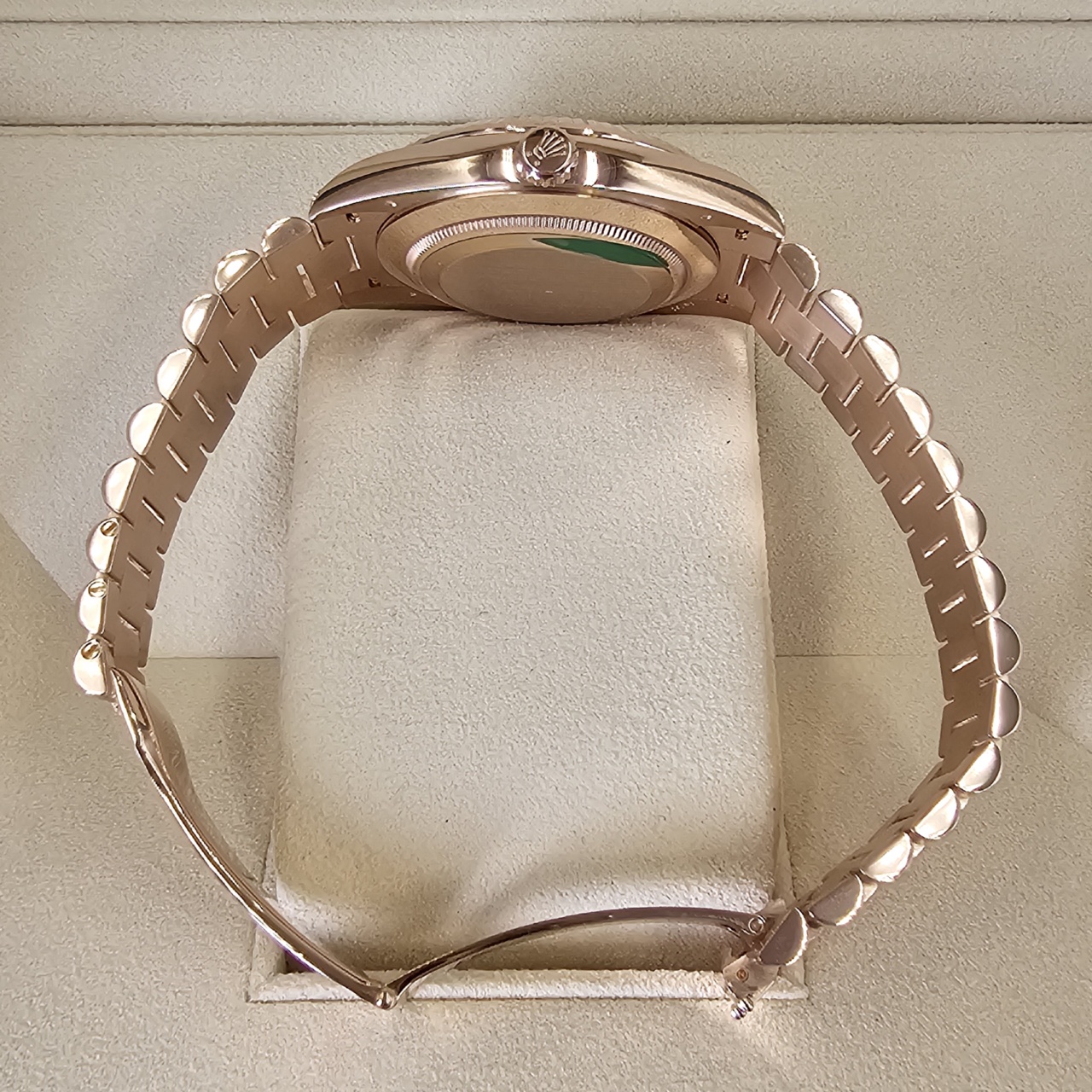 While the collection is also available in yellow gold, white gold, and platinum, the Everose edition is, by far, one of the most exceptional versions of the collection. Everose, aka 18 karat pink gold, is produced entirely by Rolex. It is of the highest quality and will hold its value well while maintaining a stunning luster.