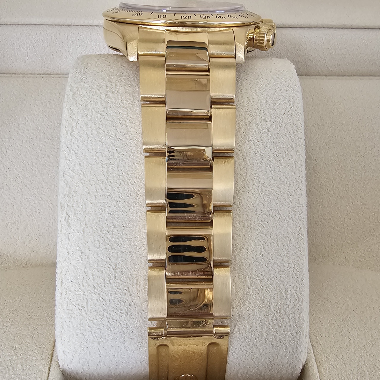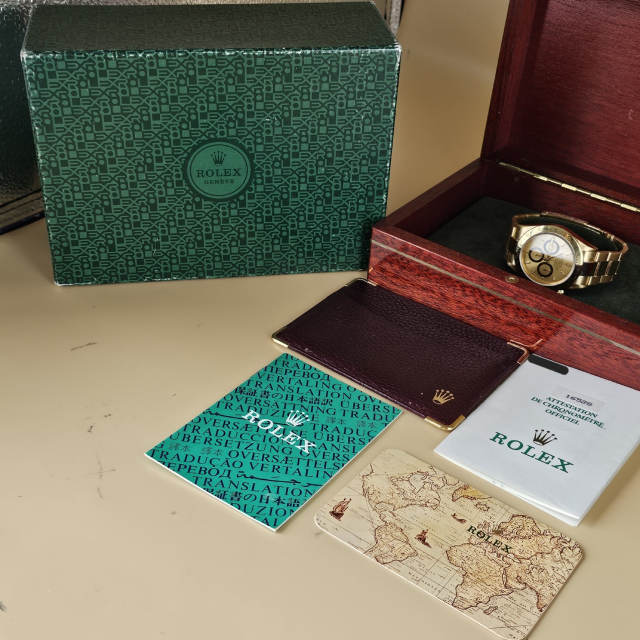 This Rolex Daytona ref. 16528 offered here has a Mark III dial, which is consistent with the watch’s 1991 year of production. The sub-dial at six o’clock features an ‘inverted 6’ variation, where the number six is inverted and appears as a nine, a detail which appeared on watches produced as late as 1994-5. The dial also features text on 5 lines, with the words “OFFICIALLY CERTIFIED” reappearing after having disappeared on the earlier Mark II dial. This dial configuration is among the rarer ones, with most watches in this reference featuring a Mark IV dial which does not feature the ‘inverted 6’.