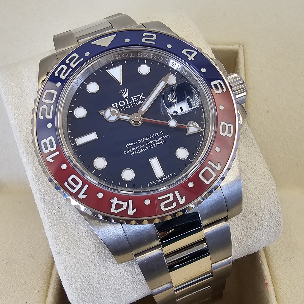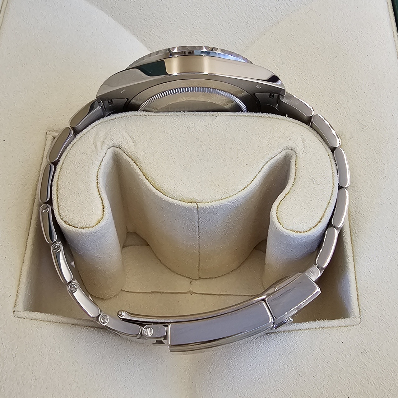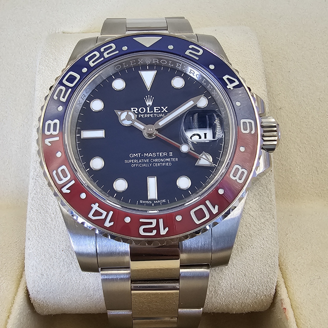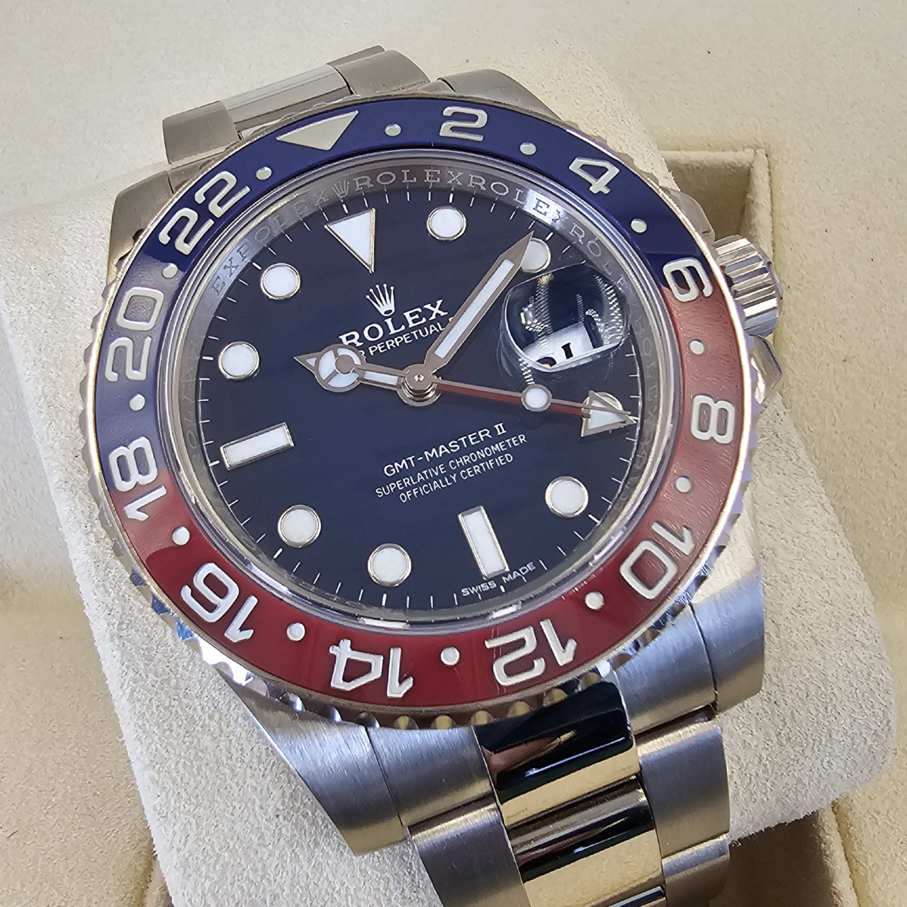 Case: 18k White Gold w/ rotatable 24 hour ceramic blue &red Pepsi Cerachrom bezel, inner reflector ring engraved with serial number.