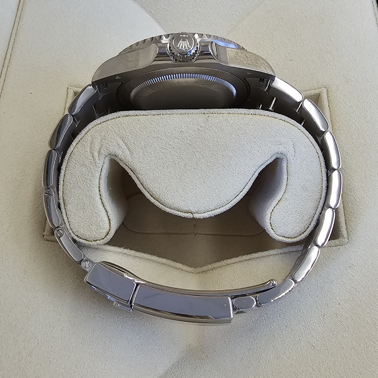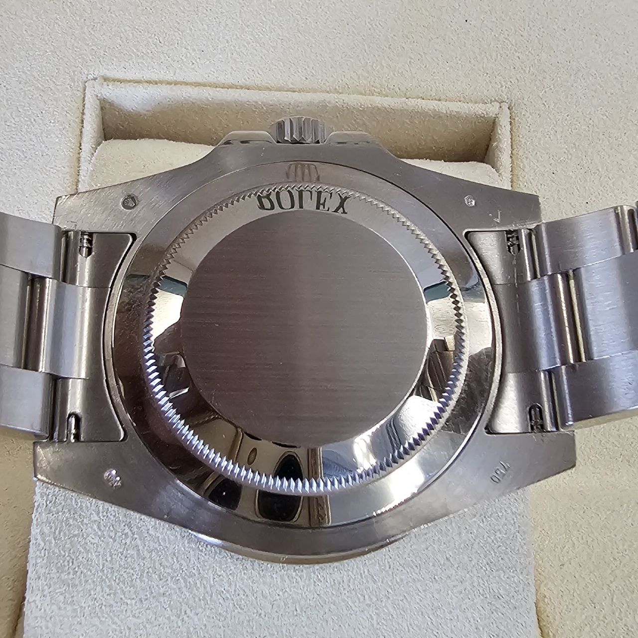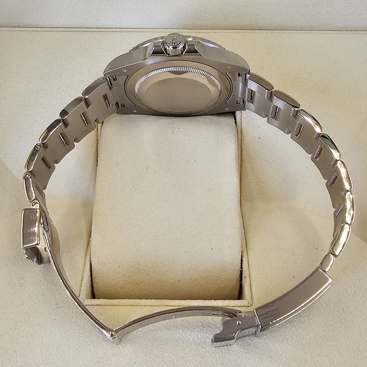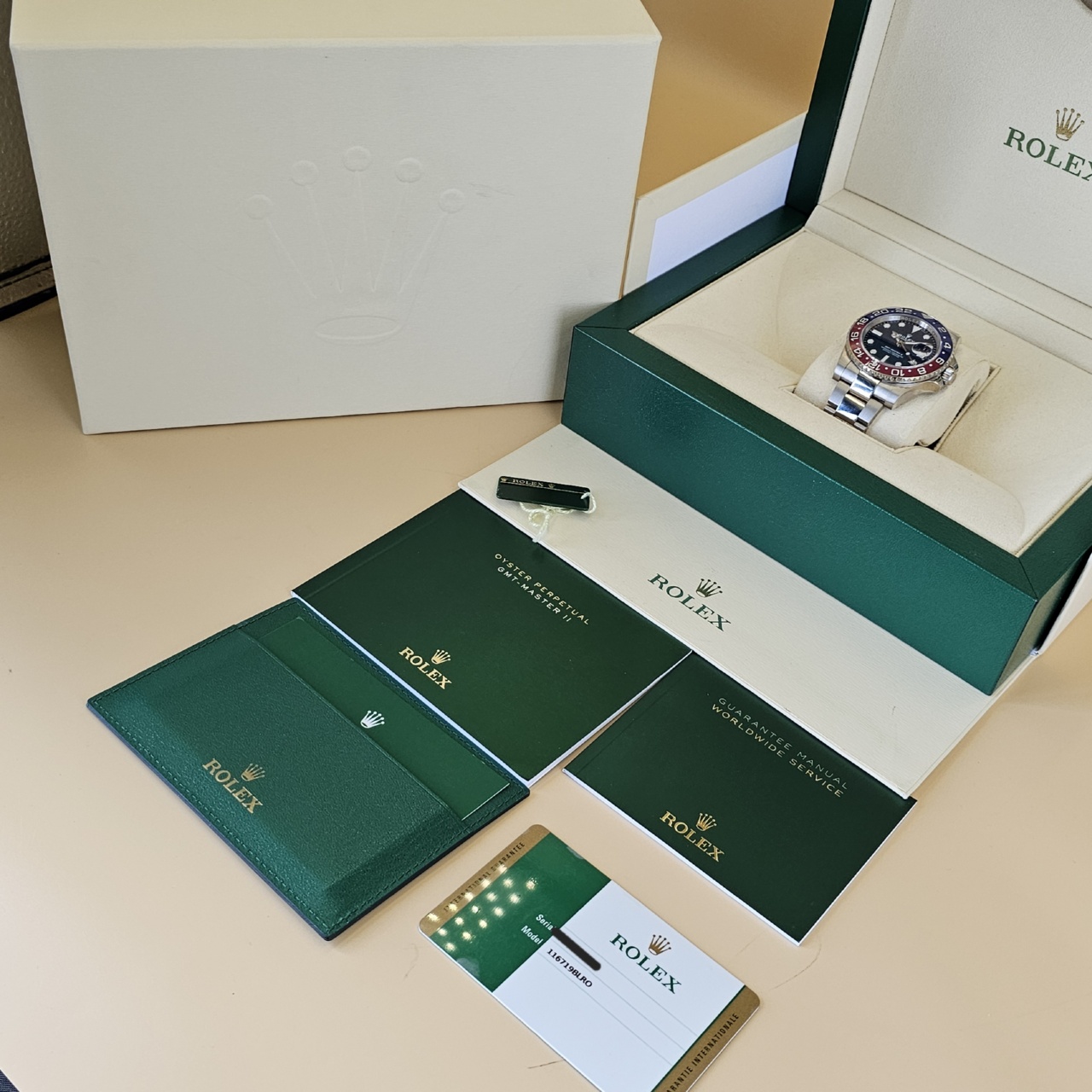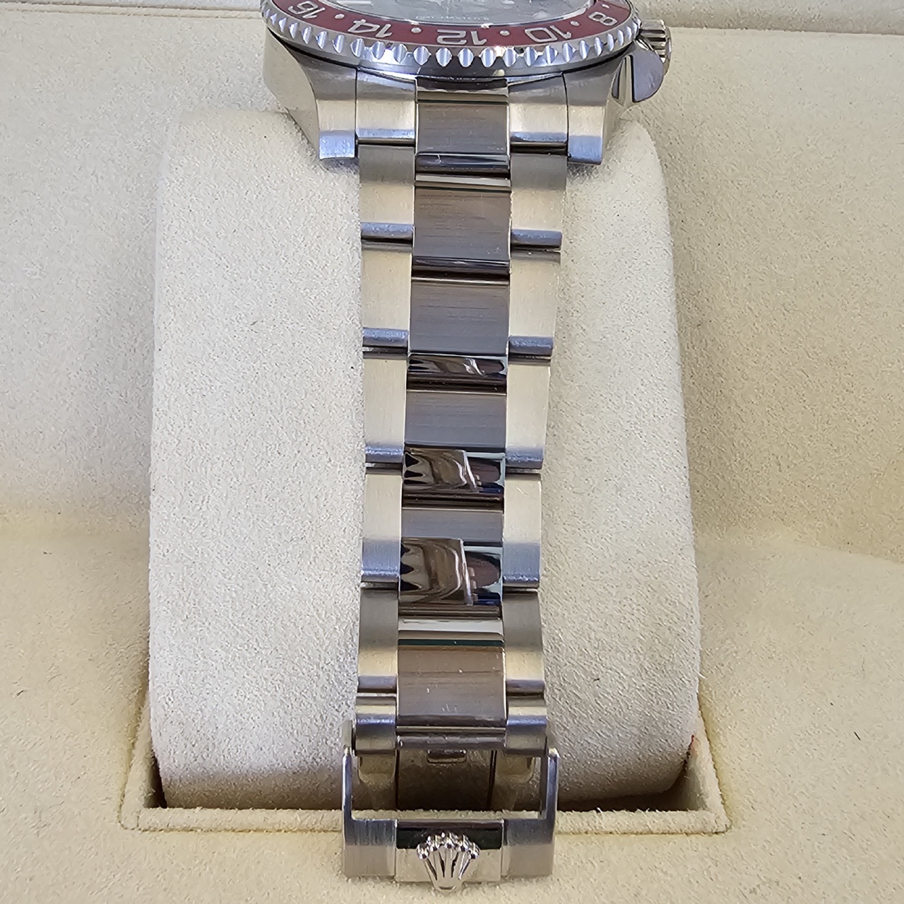 Case: 18k White Gold w/ rotatable 24 hour ceramic blue &red Pepsi Cerachrom bezel, inner reflector ring engraved with serial number.