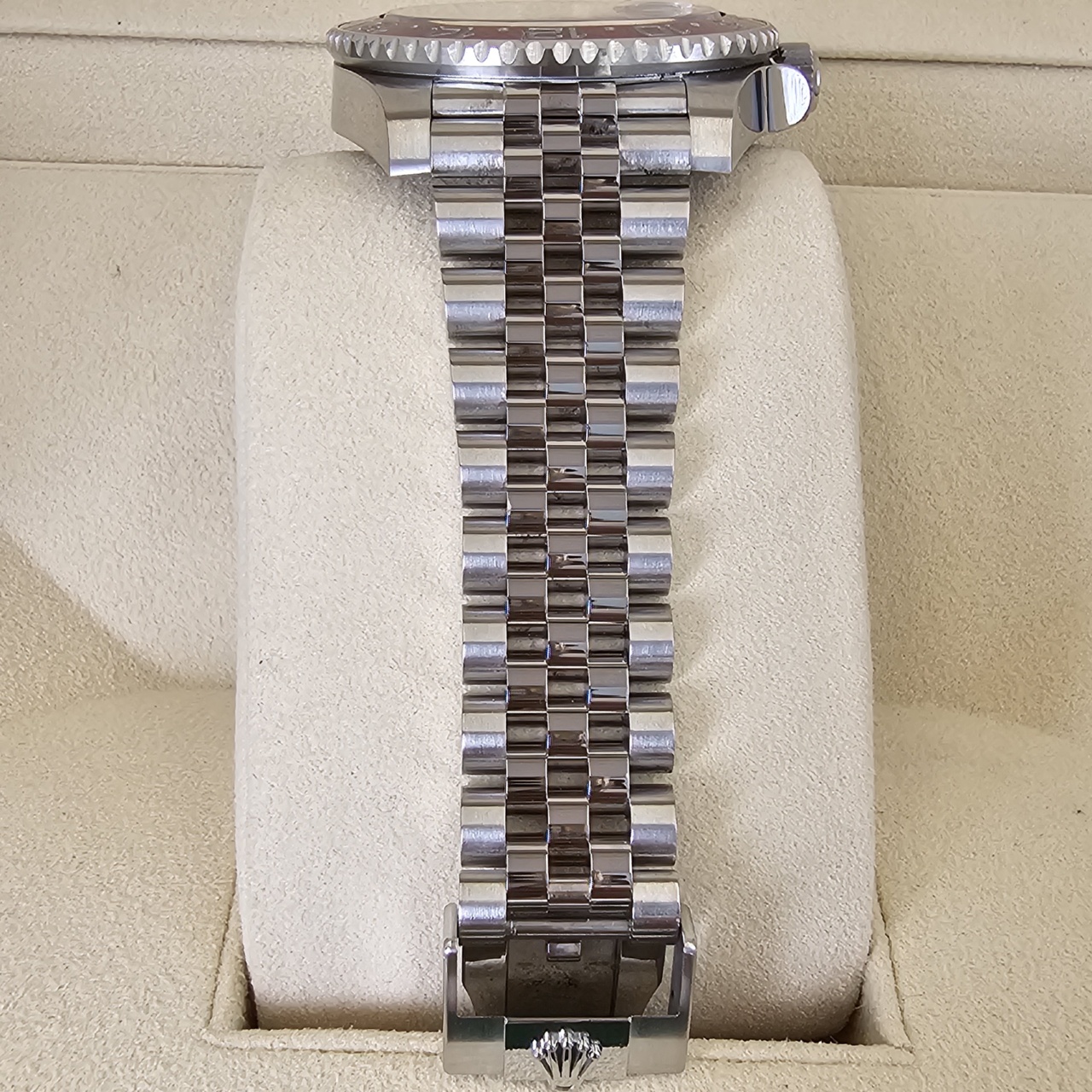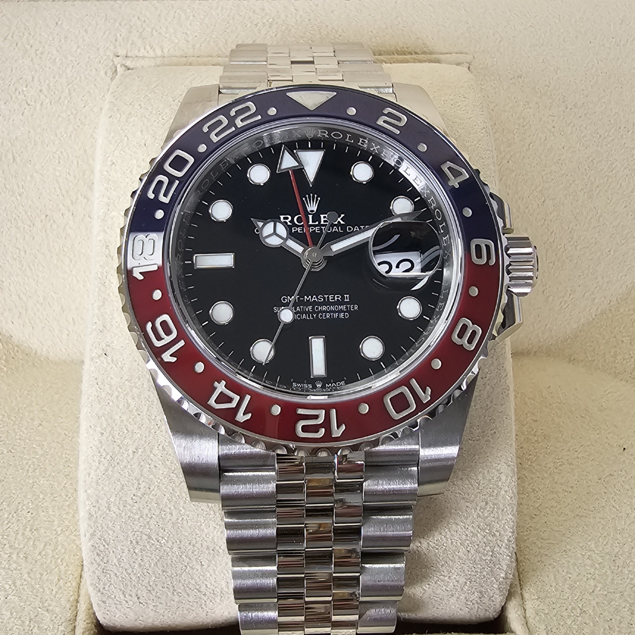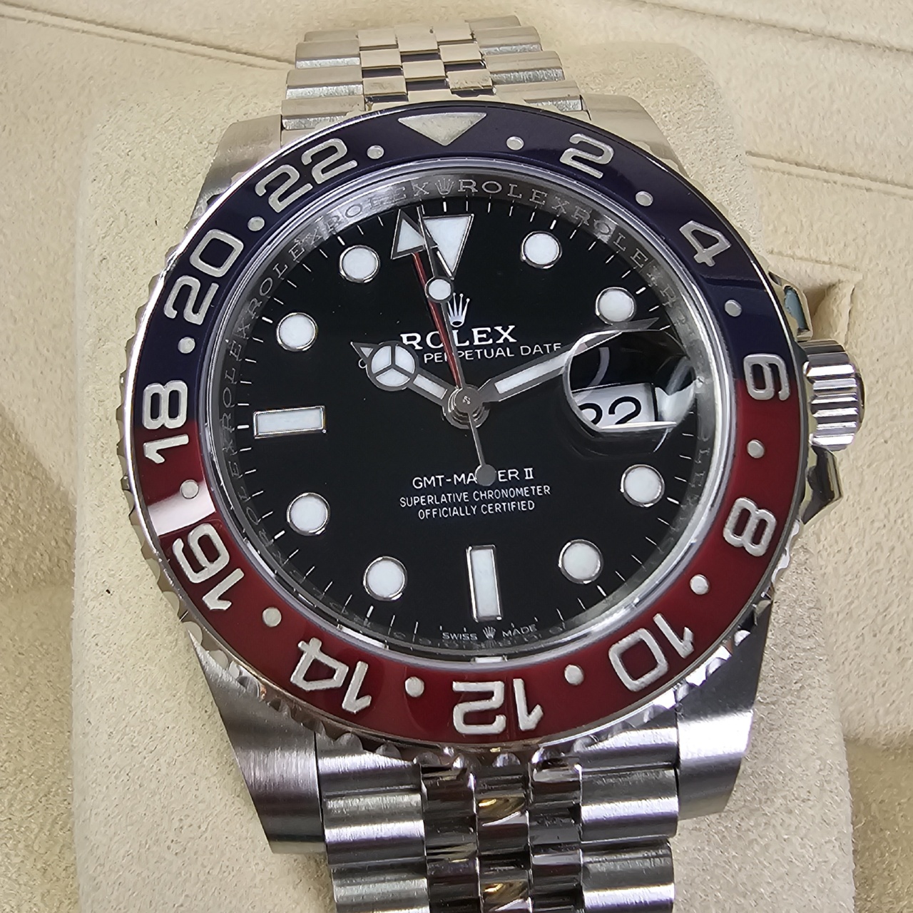 Case: Oystersteel w/ rotatable 24 hour ceramic blue & red Pepsi Cerachrom bezel, inner reflector ring engraved with serial number.