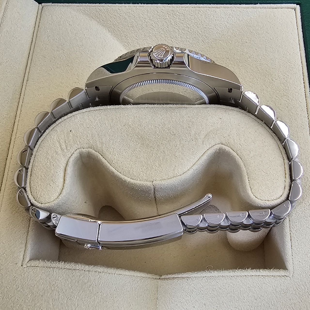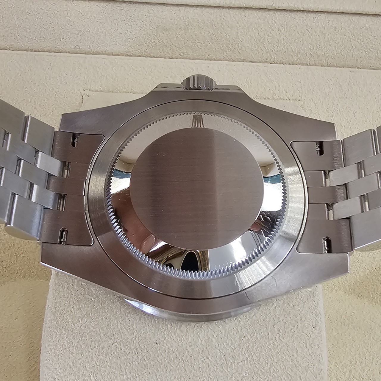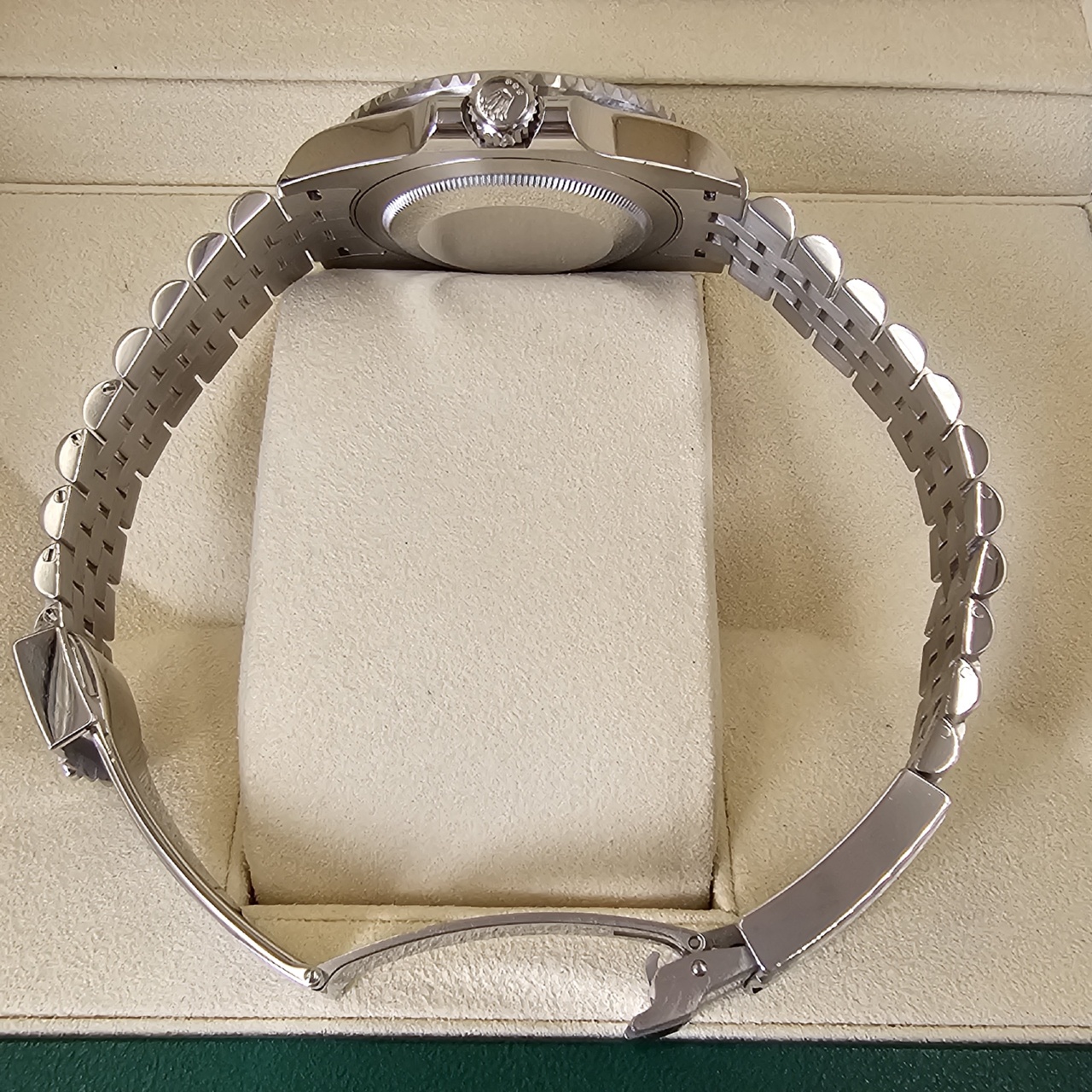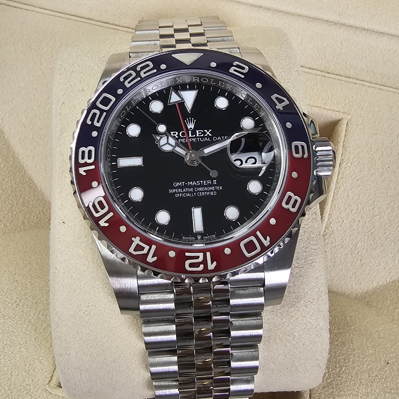 Case: Oystersteel w/ rotatable 24 hour ceramic blue & red Pepsi Cerachrom bezel, inner reflector ring engraved with serial number.