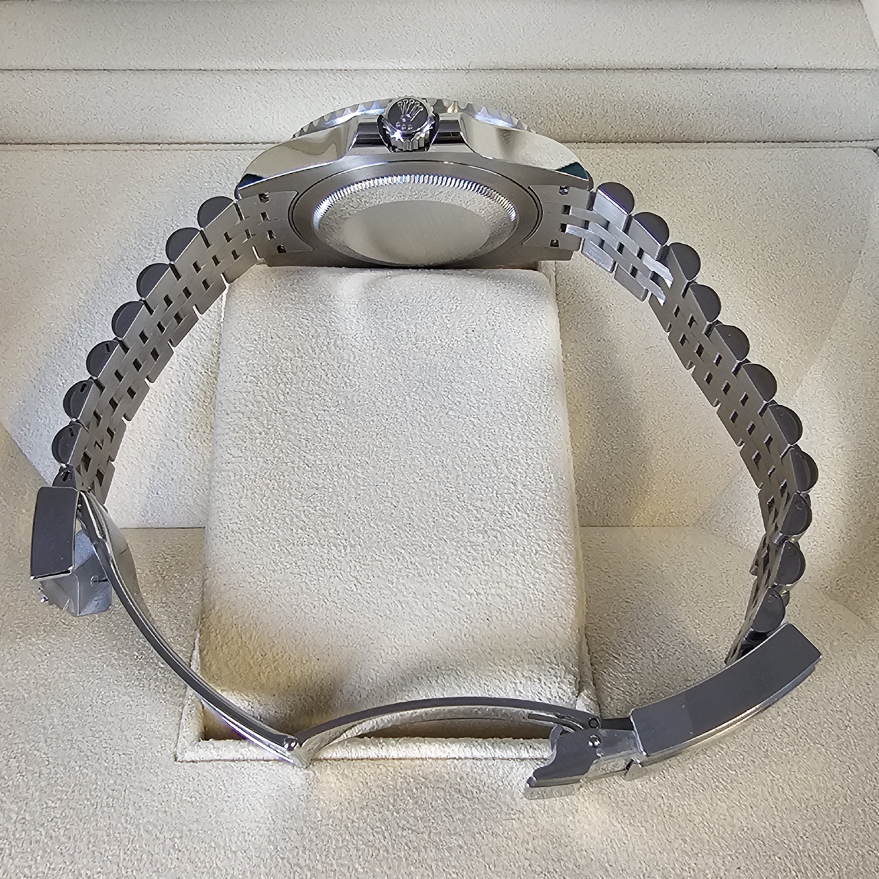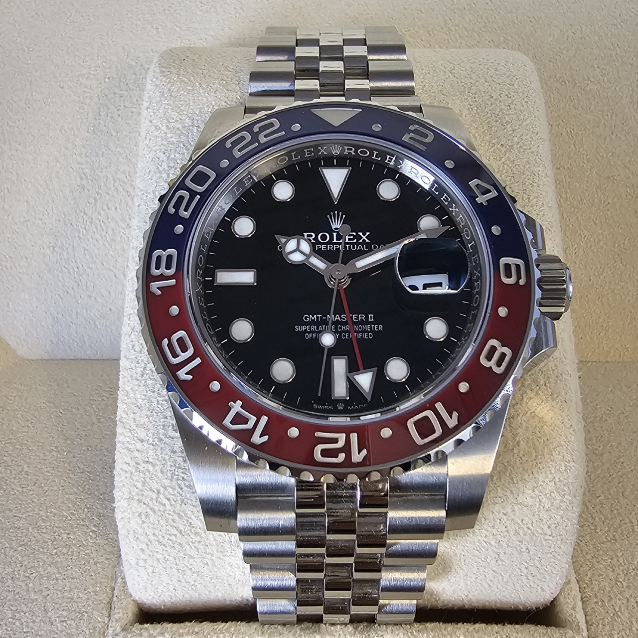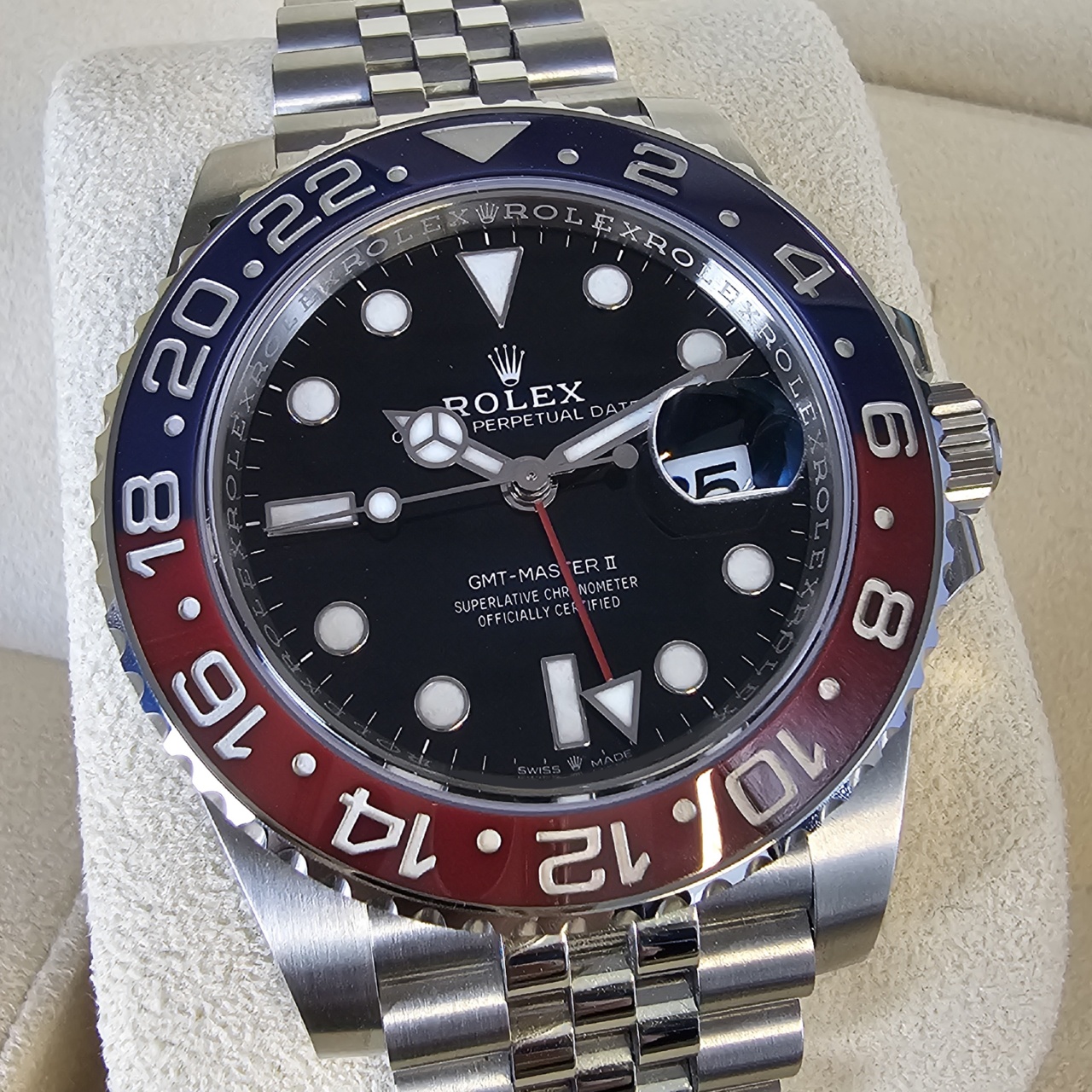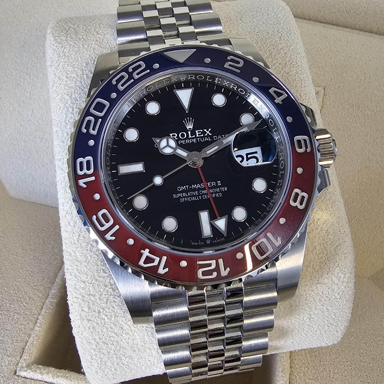 Case: Oystersteel w/ rotatable 24 hour ceramic blue & red Pepsi Cerachrom bezel, inner reflector ring engraved with serial number.