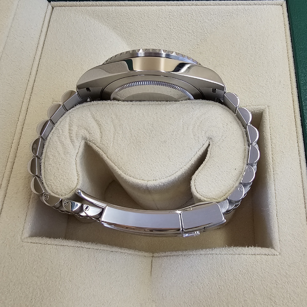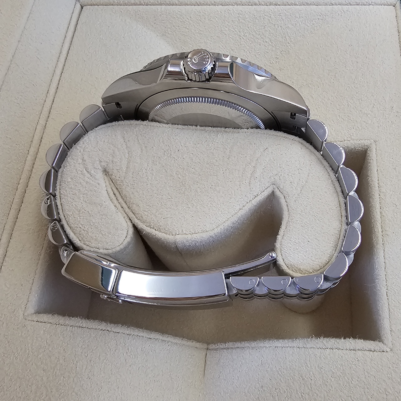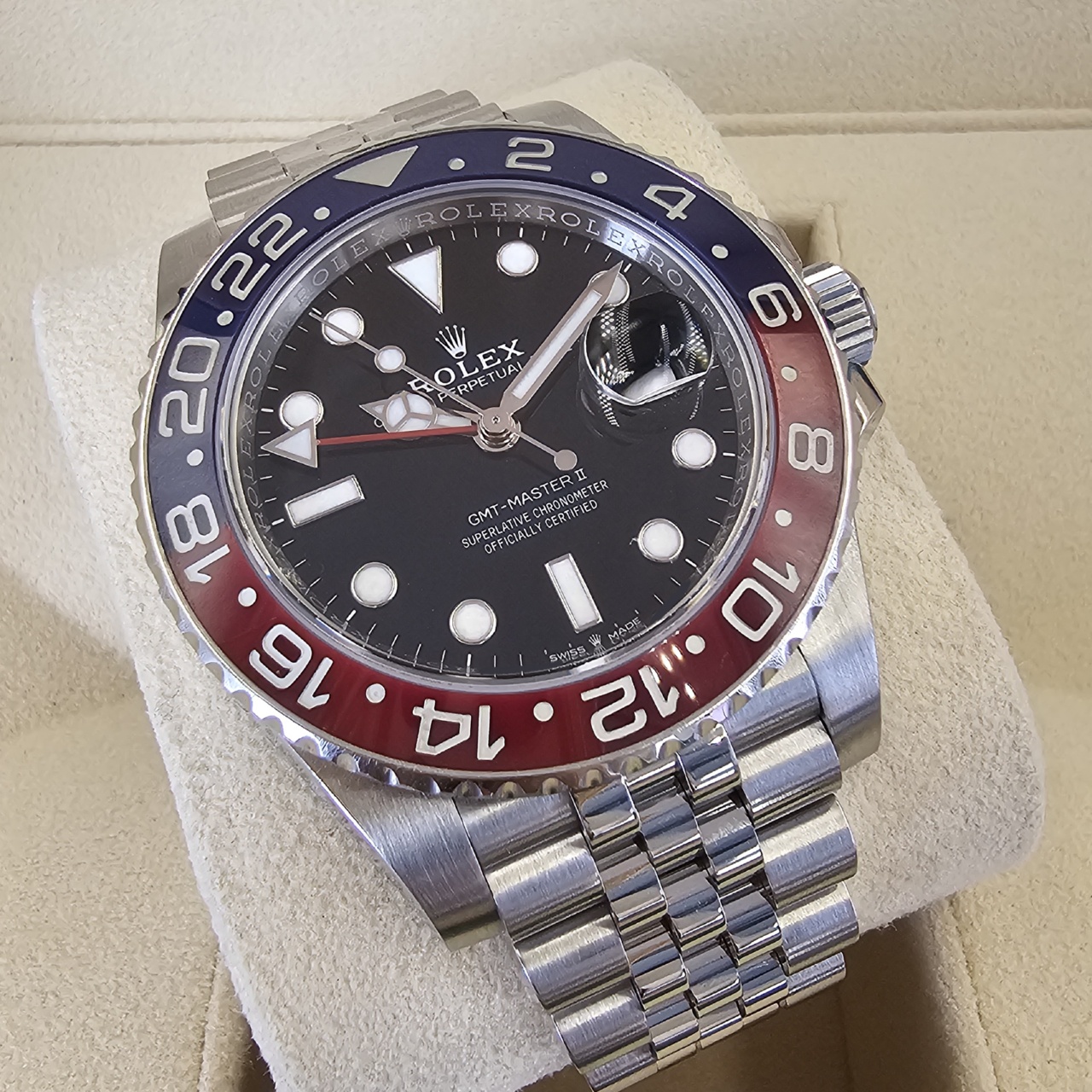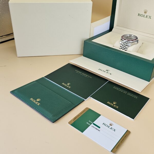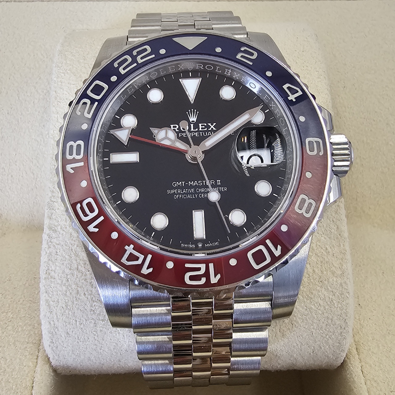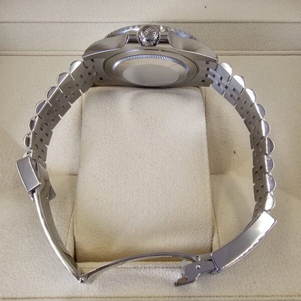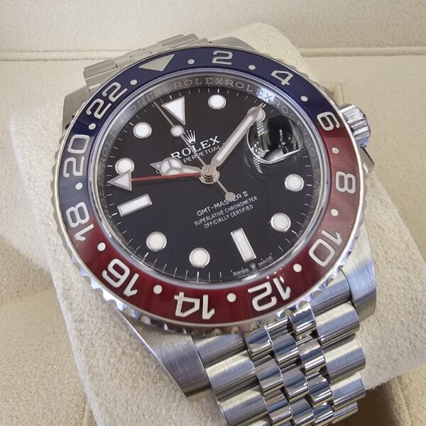 Case: Oystersteel w/ rotatable 24 hour ceramic blue &red Pepsi Cerachrom bezel (MARK 3, Replaced by Rolex service center) , inner reflector ring engraved with serial number.