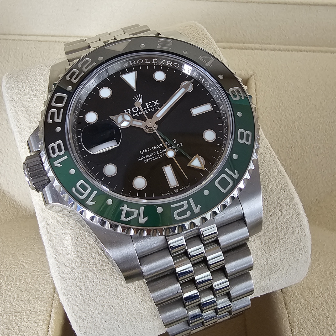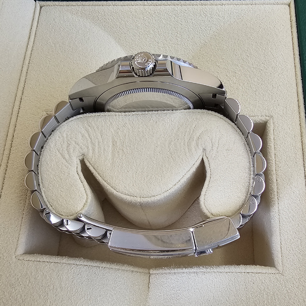 Case: Left handed stainless steel (40mm) w/ bidirectional rotatable bezel, green and black “Sprite” Cerachrom insert in ceramic, inner reflector ring engraved w/ serial number