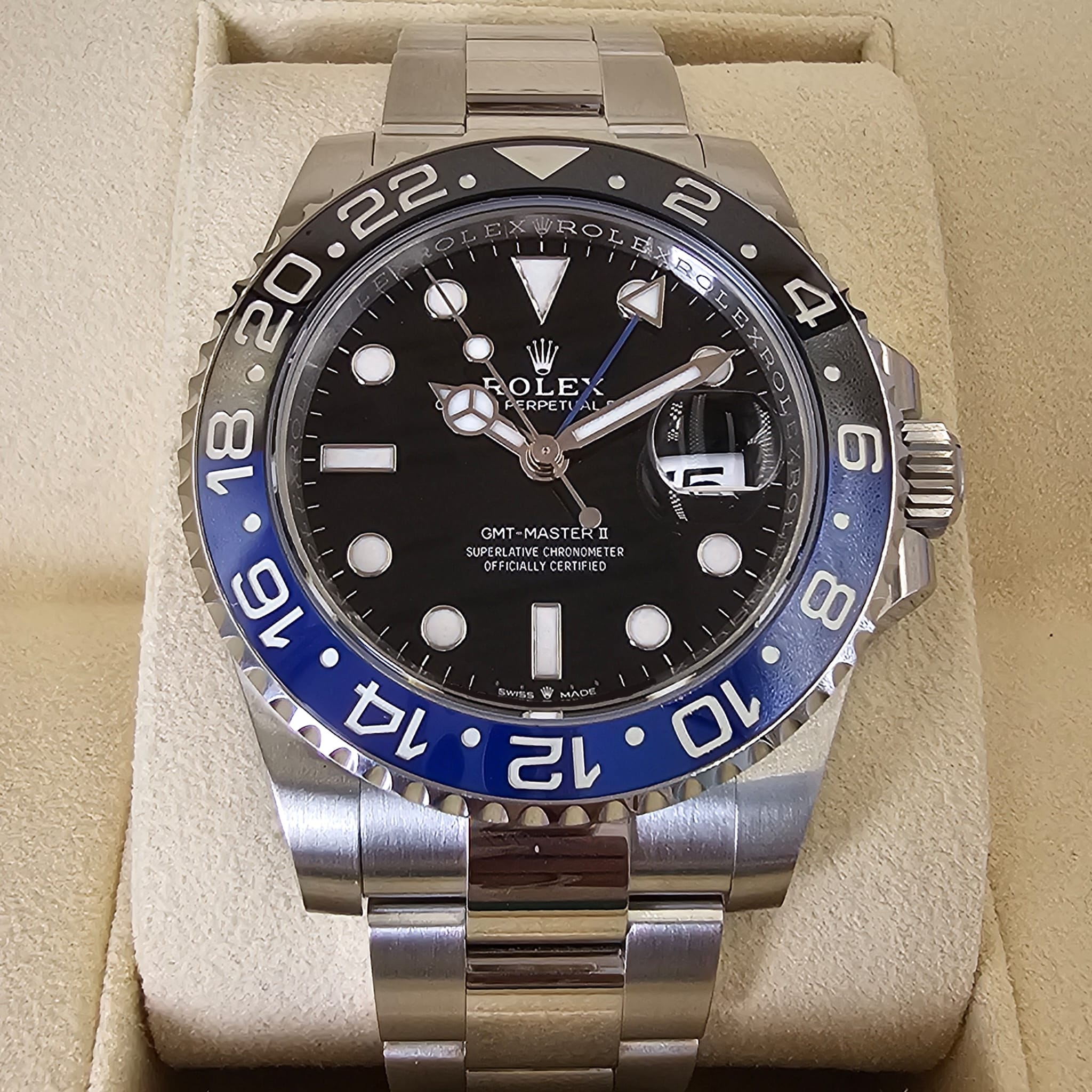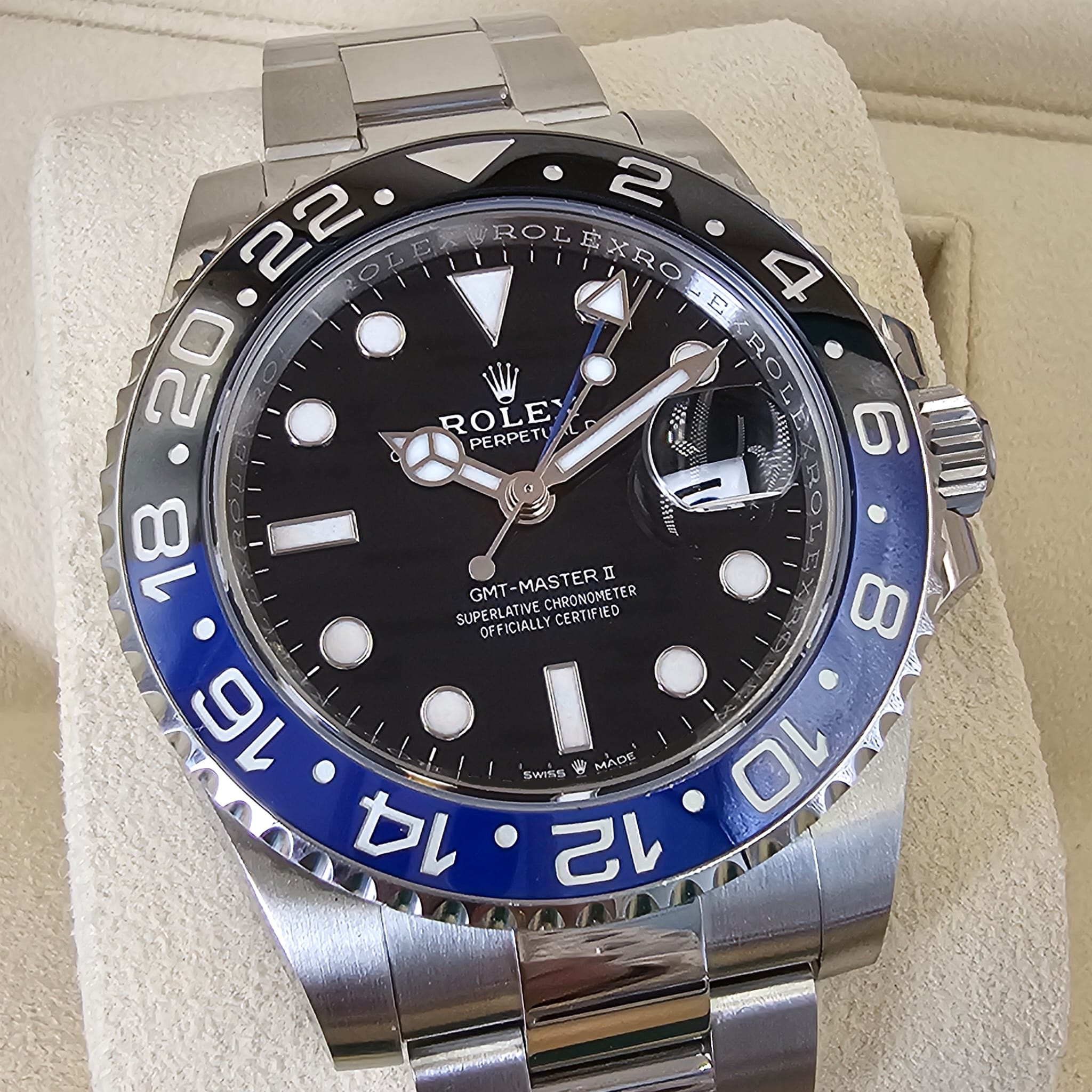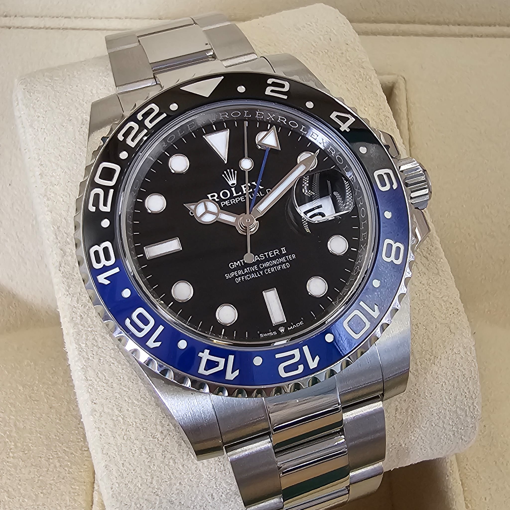 Case: Oystersteel (40mm) w/ rotatable 24 hour ceramic black and blue Batman Cerachrom bezel, inner reflector ring engraved with serial number.