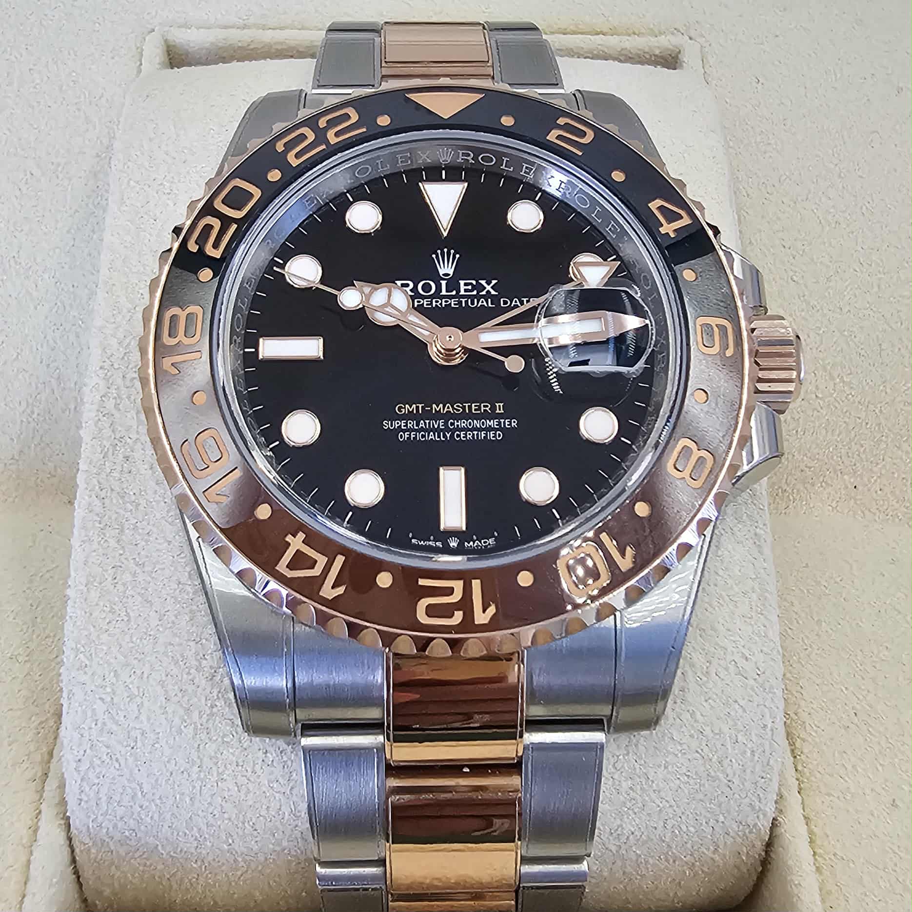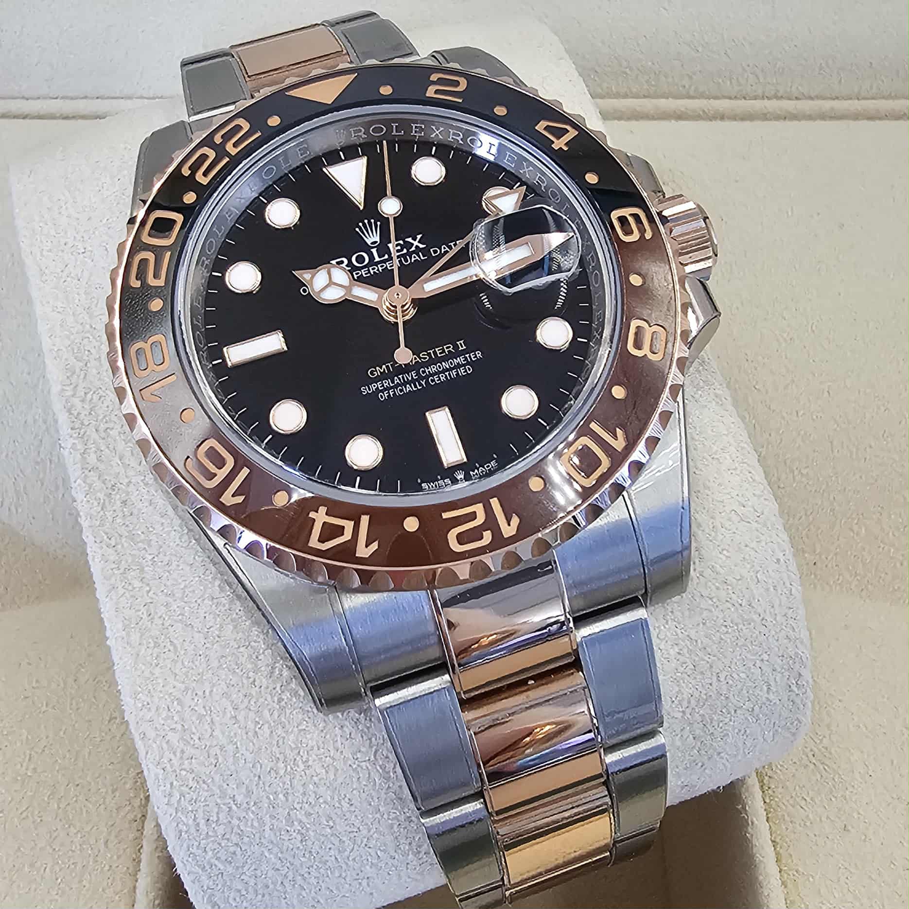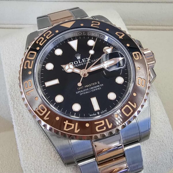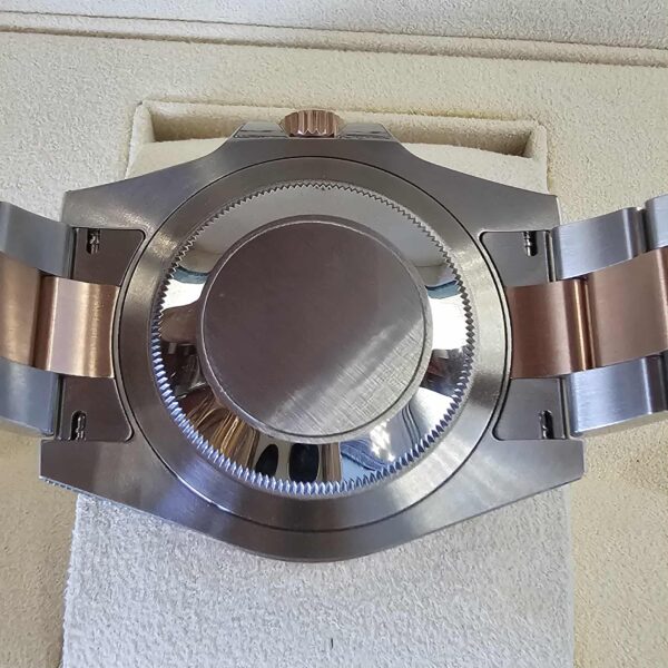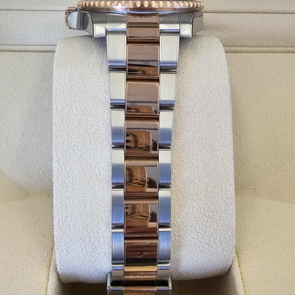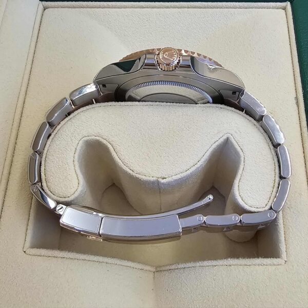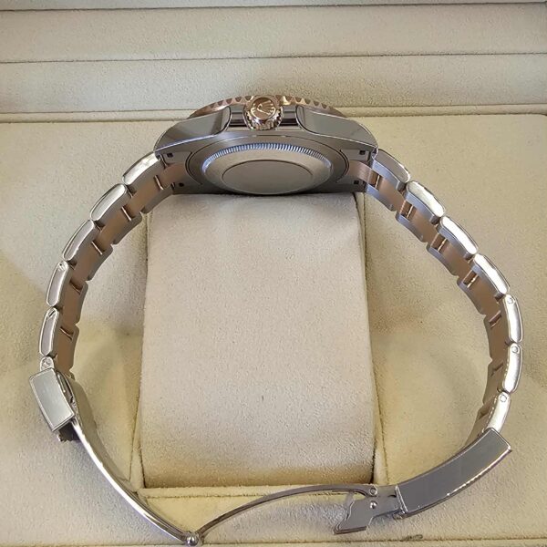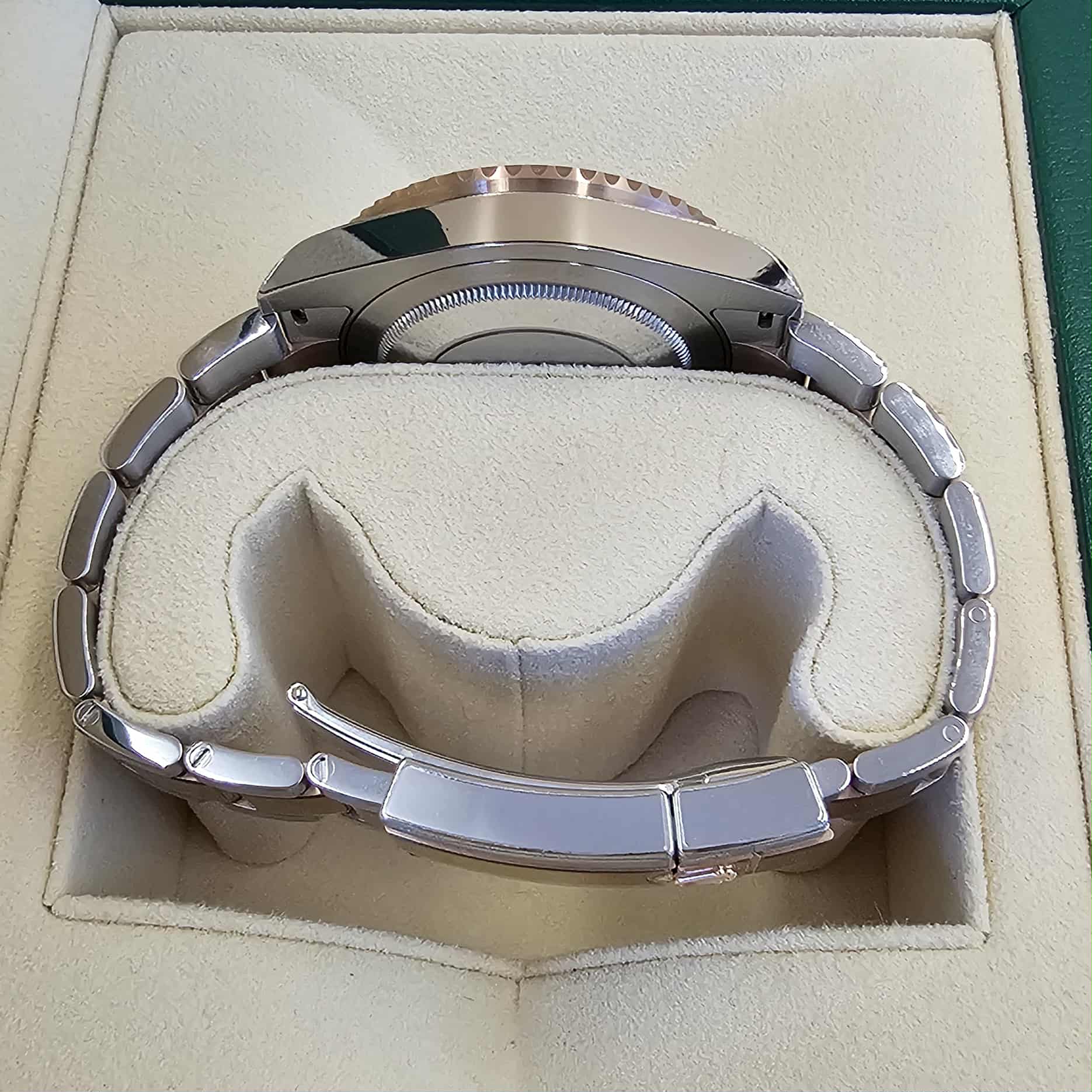 Case: Oystersteel (40mm) w/ 18k Everose rotatable 24 hour ceramic black and brown Root Beer Cerachrom bezel, inner reflector ring engraved with serial number