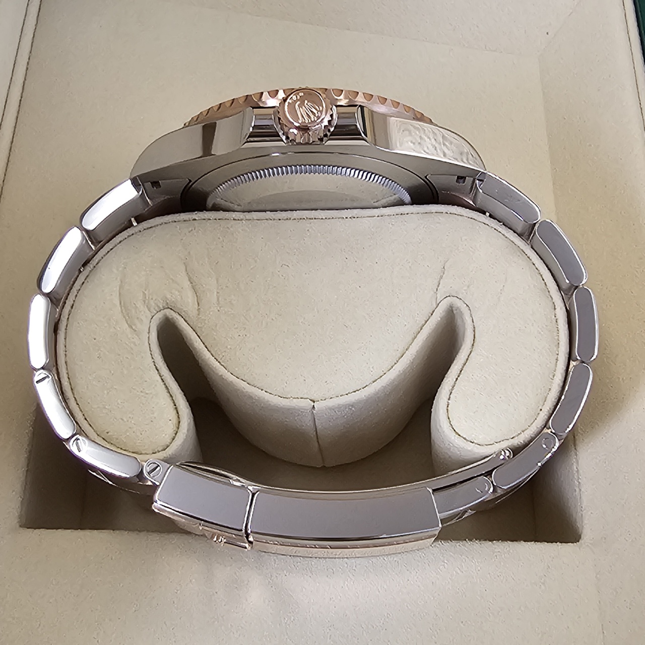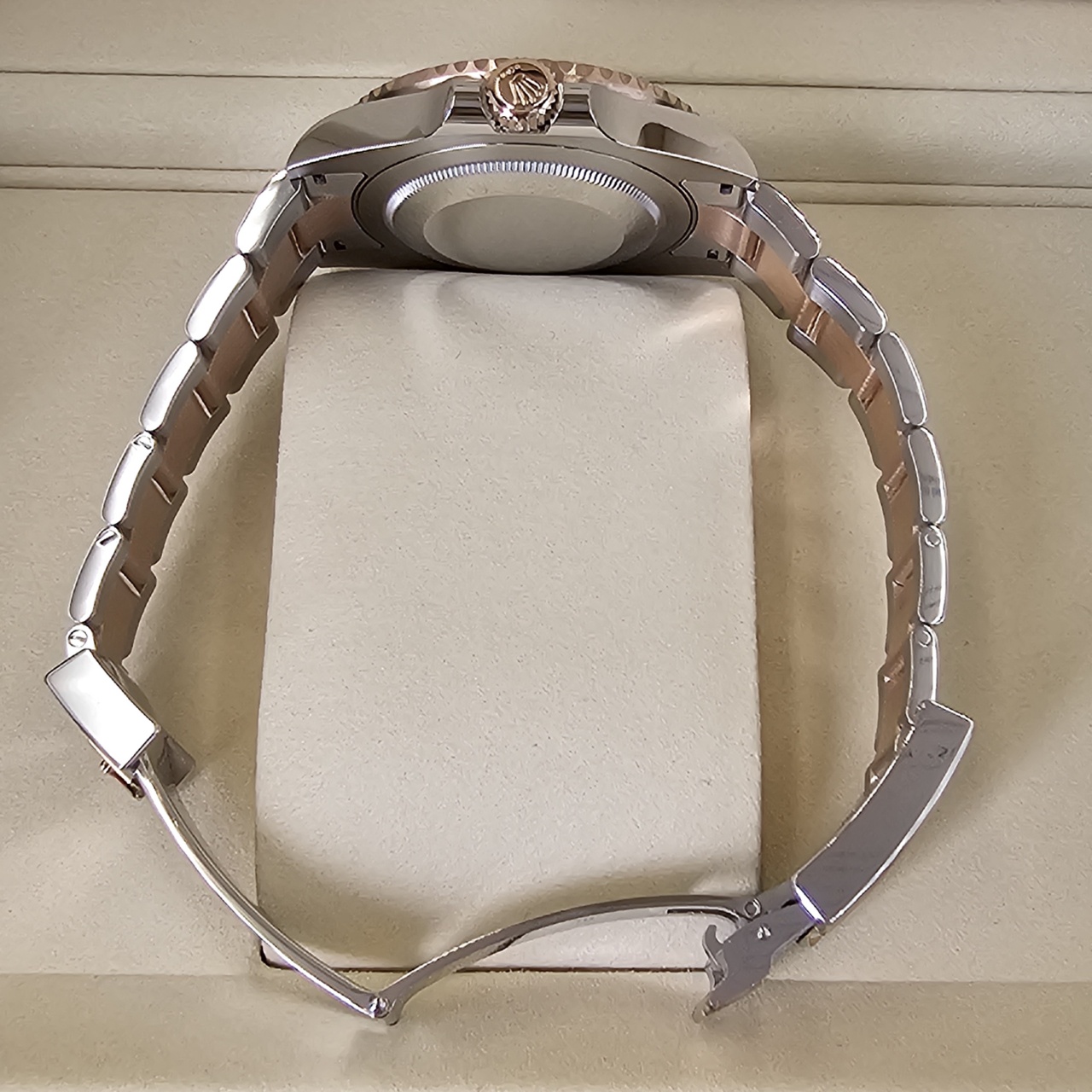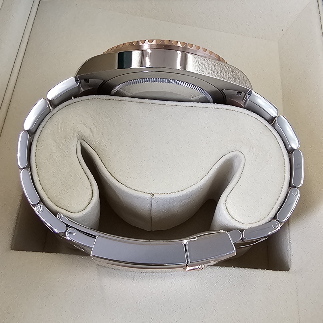 Case: Oystersteel (40mm) w/ 18k Everose rotatable 24 hour ceramic black and brown Root Beer Cerachrom bezel, inner reflector ring engraved with serial number