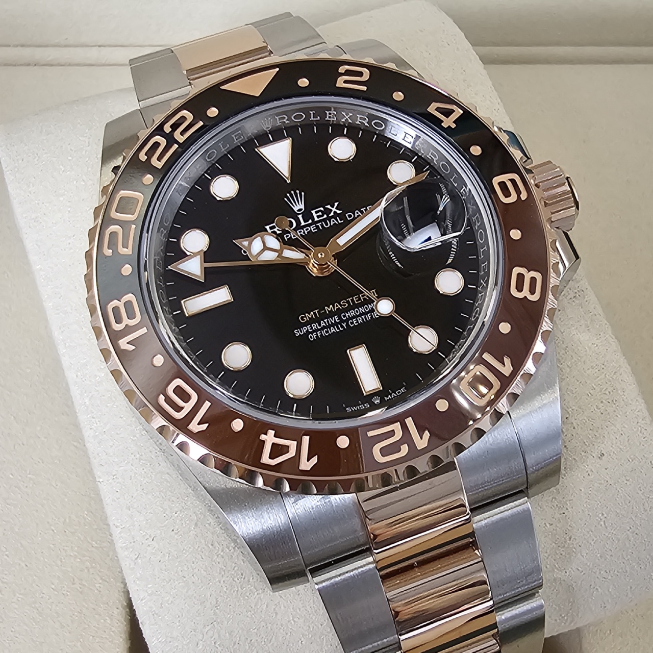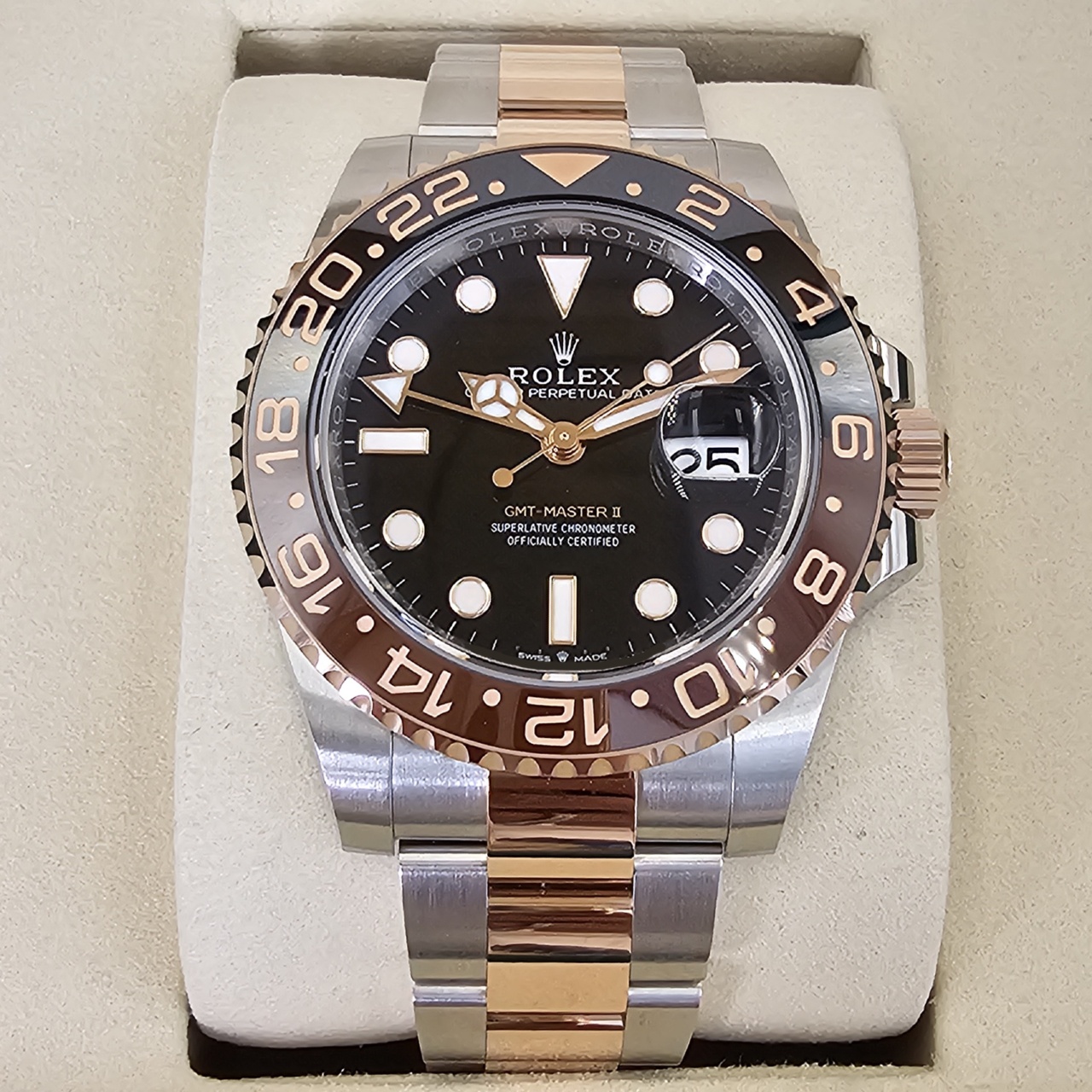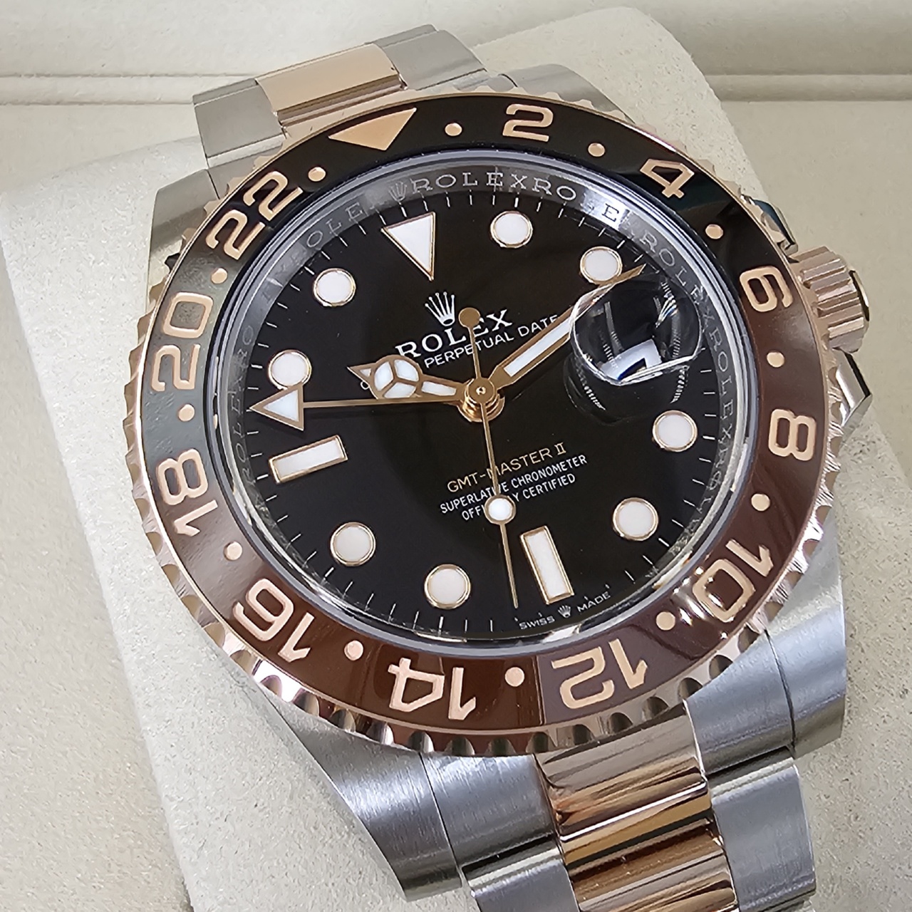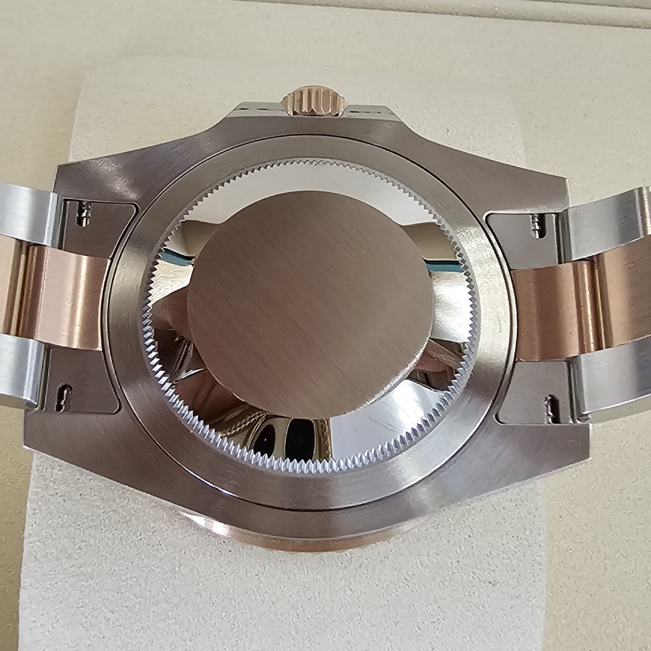 Case: Oystersteel (40mm) w/ 18k Everose rotatable 24 hour ceramic black and brown Root Beer Cerachrom bezel, inner reflector ring engraved with serial number