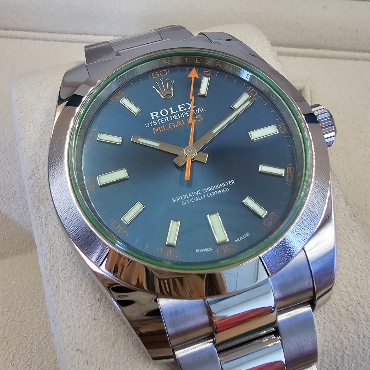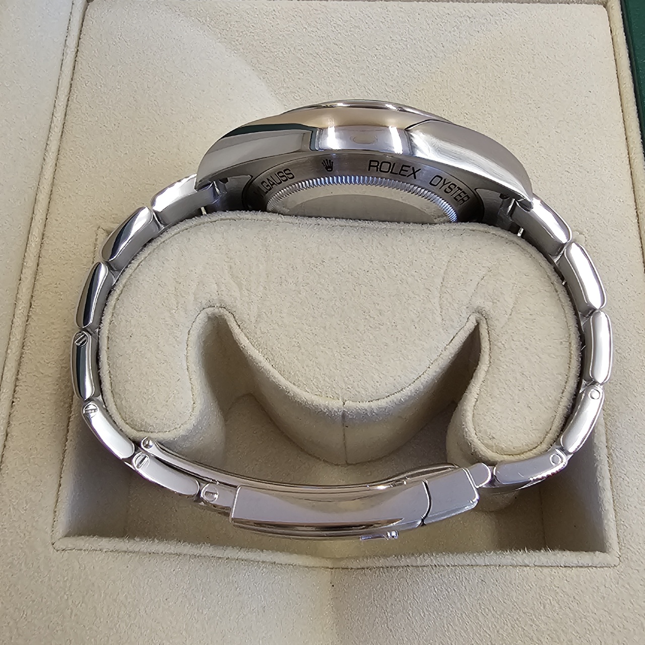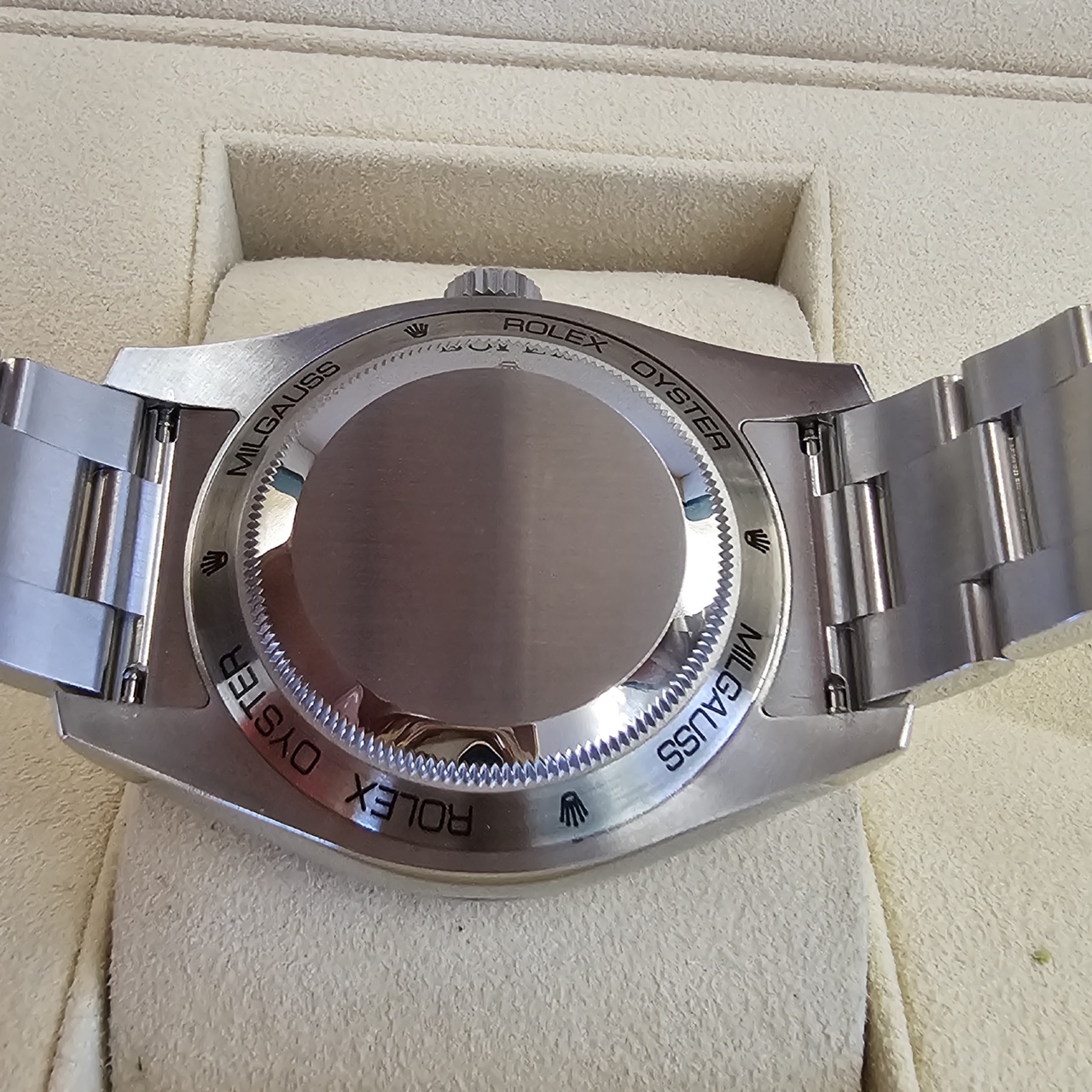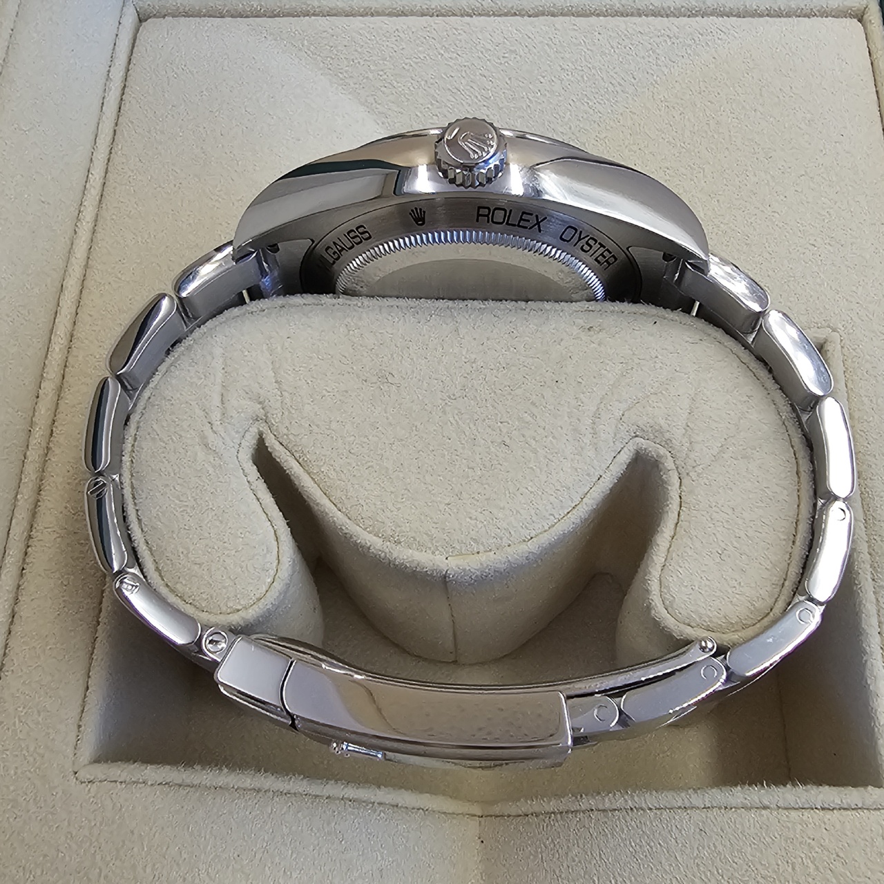 The green sapphire crystal on this edition of the anti-magnetic Rolex Milgauss gives the watch a mesmerizing glow. Green is Rolex’s signature color, so it seems only fitting that the crystal on this anniversary model would also be green. No other timepiece in the Rolex catalog boasts a Glace Verte crystal, making this piece a true collector’s item