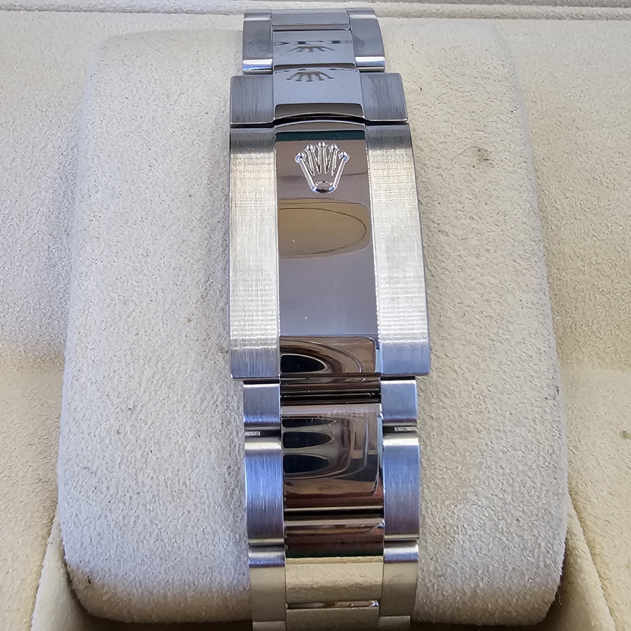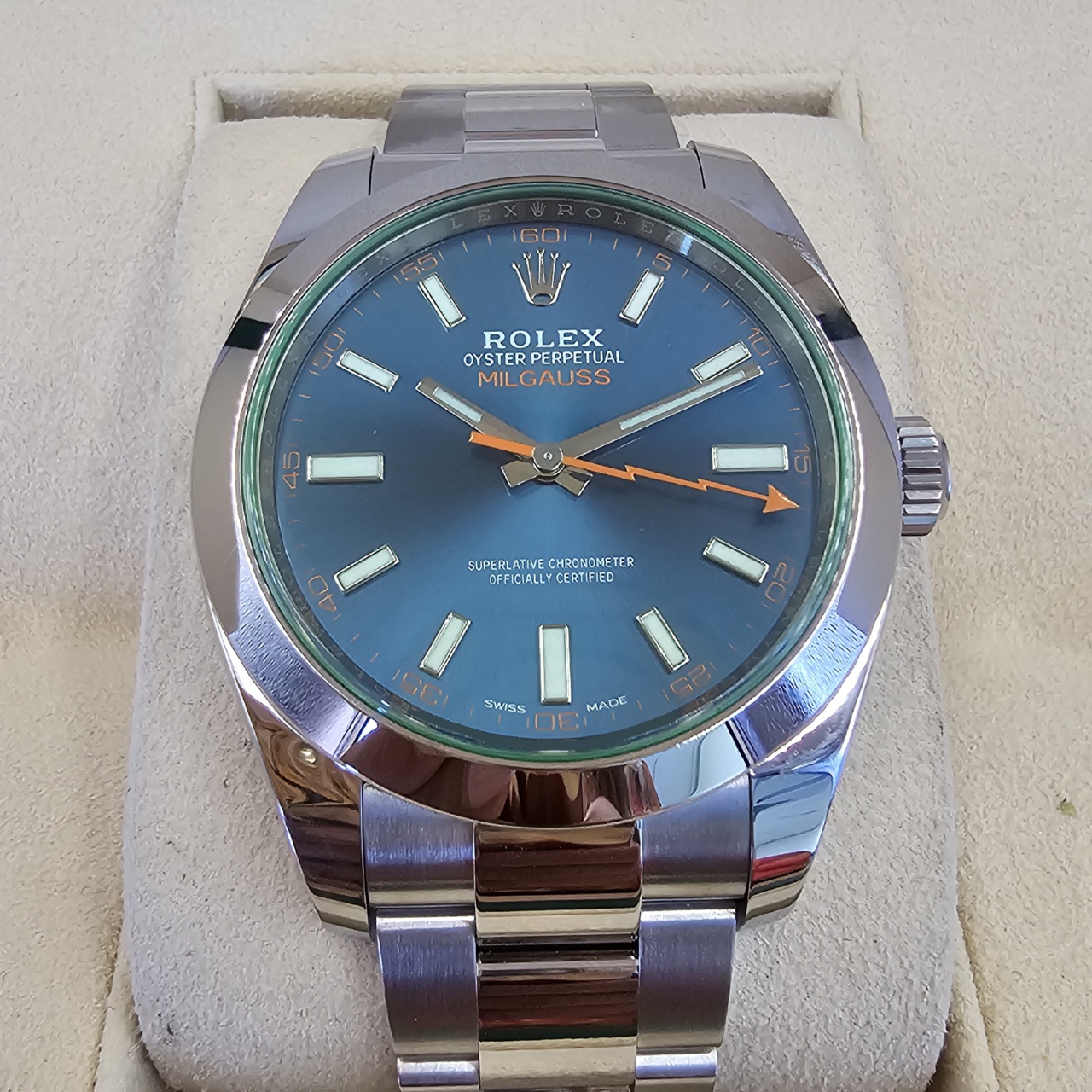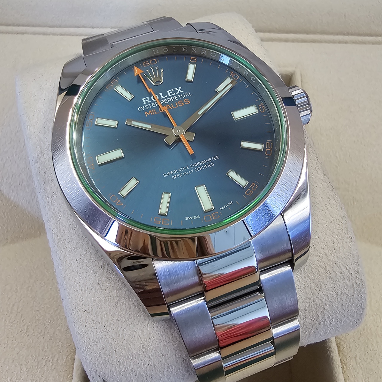 The green sapphire crystal on this edition of the anti-magnetic Rolex Milgauss gives the watch a mesmerizing glow. Green is Rolex’s signature color, so it seems only fitting that the crystal on this anniversary model would also be green. No other timepiece in the Rolex catalog boasts a Glace Verte crystal, making this piece a true collector’s item