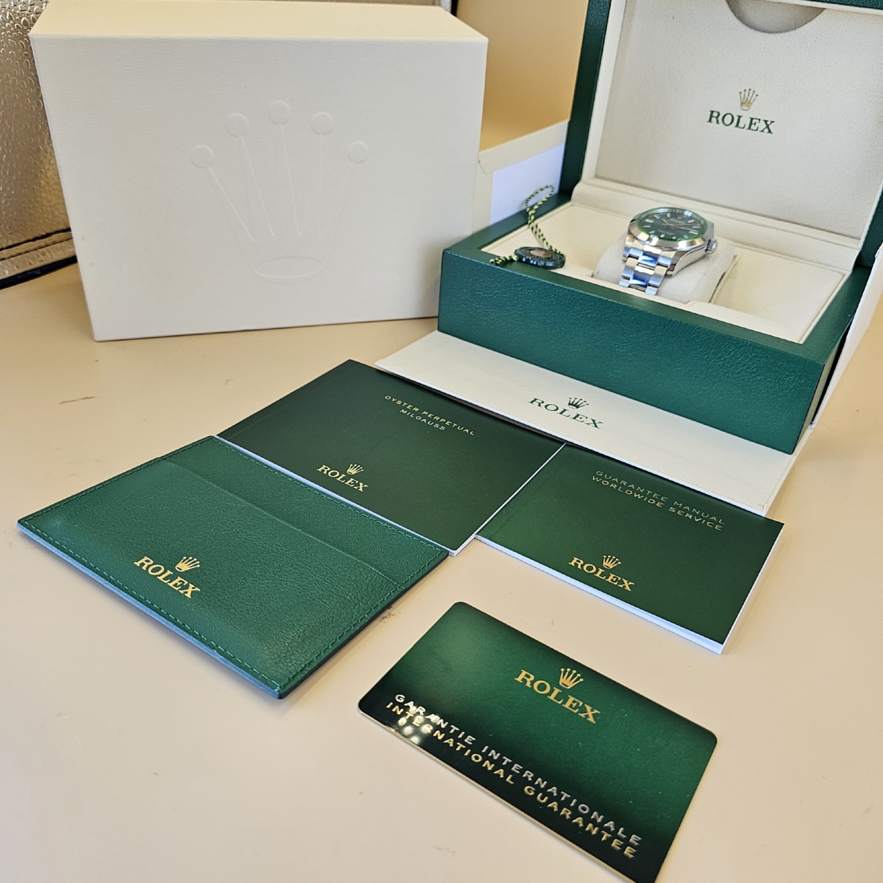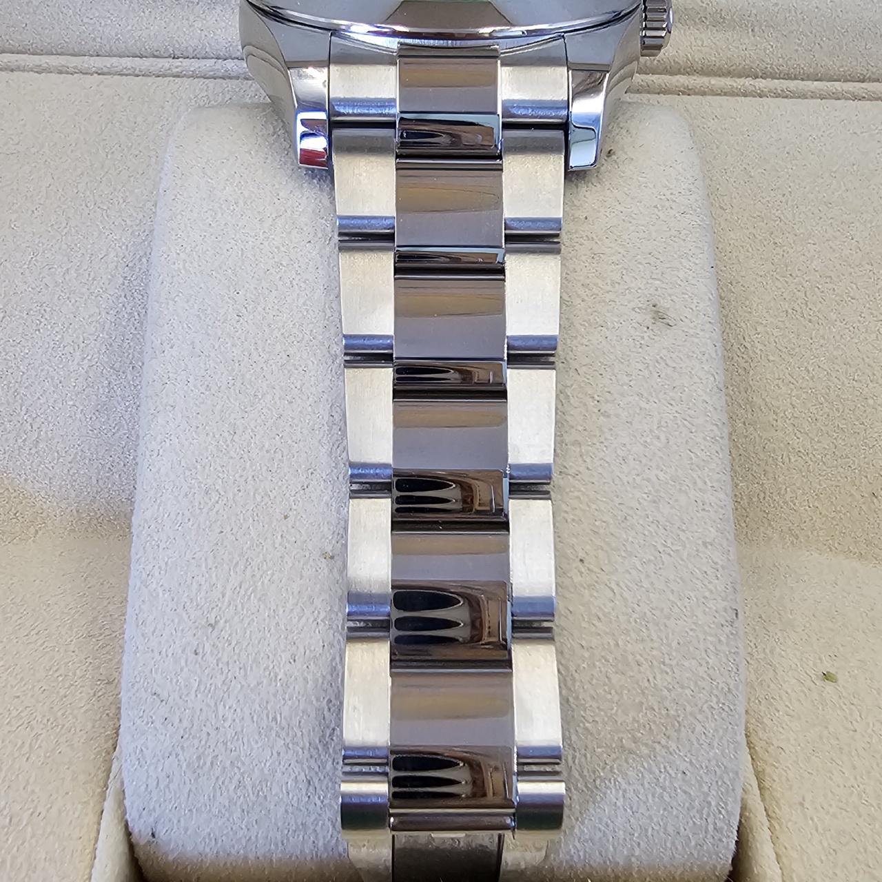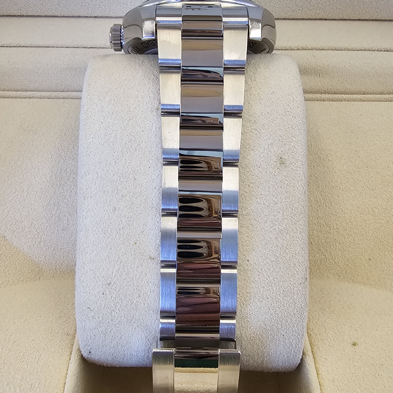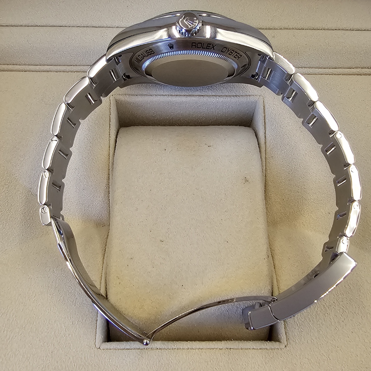 The green sapphire crystal on this edition of the anti-magnetic Rolex Milgauss gives the watch a mesmerizing glow. Green is Rolex’s signature color, so it seems only fitting that the crystal on this anniversary model would also be green. No other timepiece in the Rolex catalog boasts a Glace Verte crystal, making this piece a true collector’s item