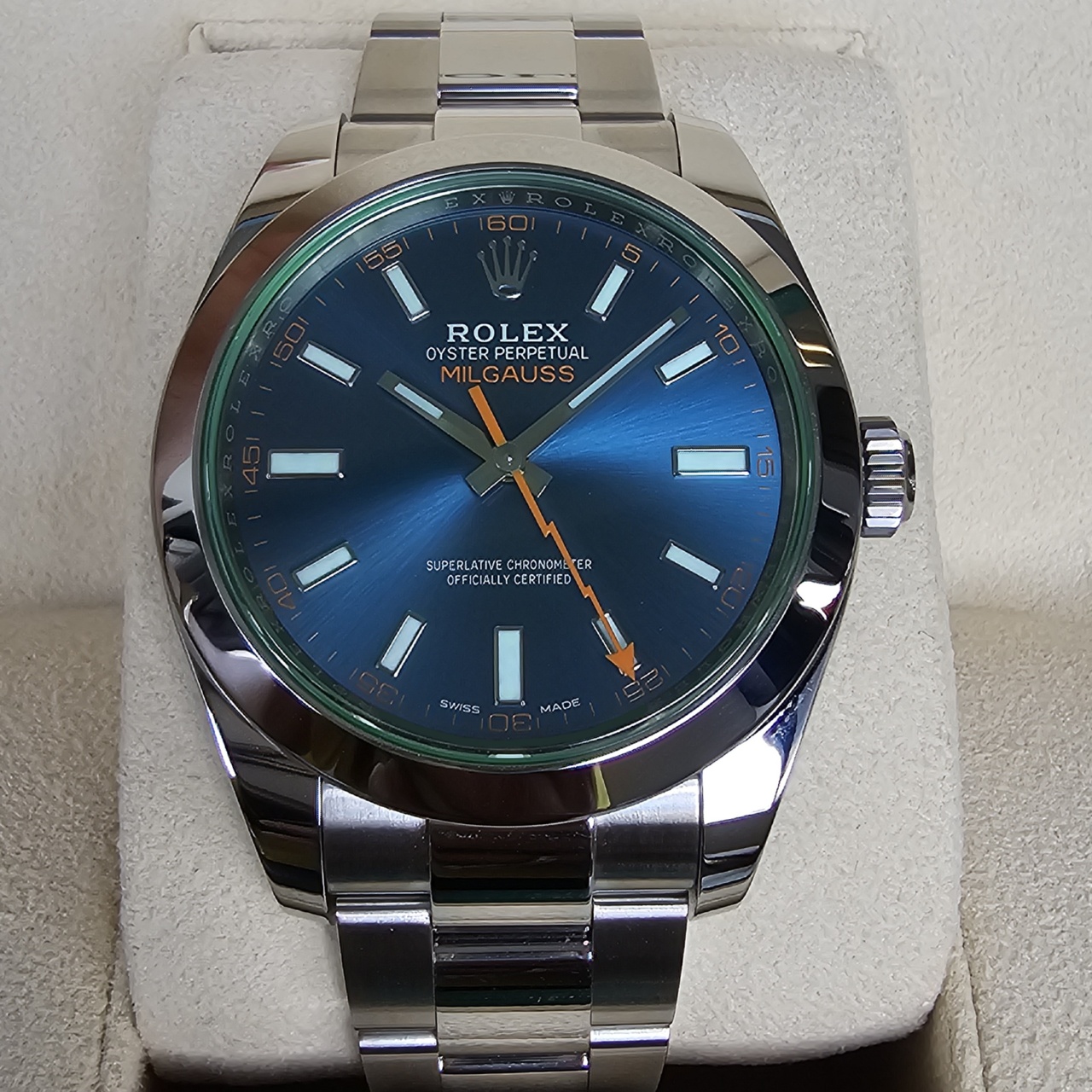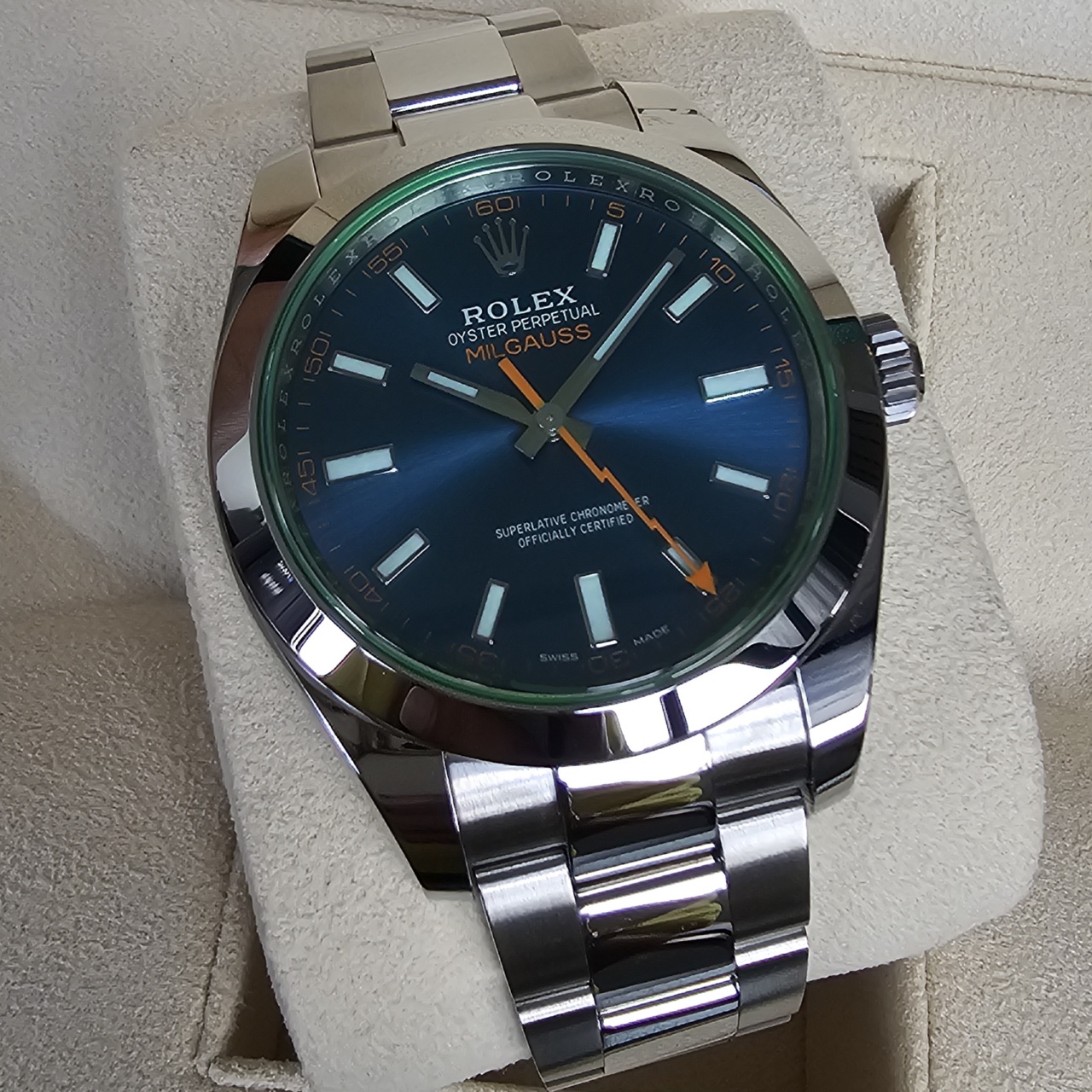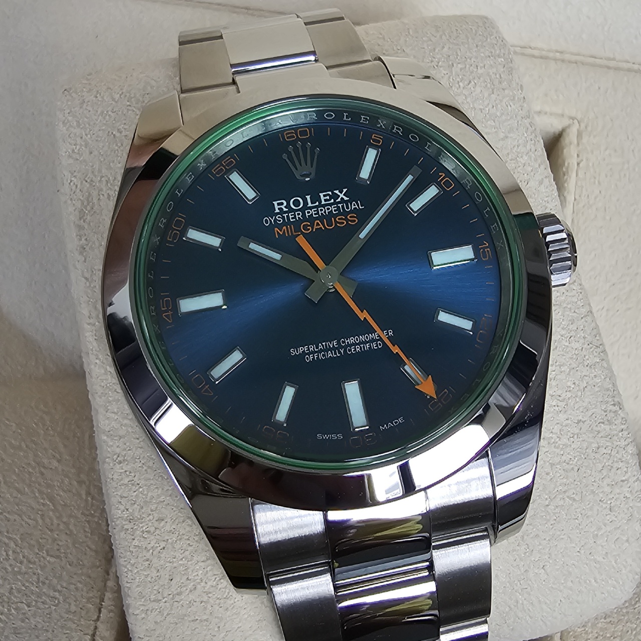 The green sapphire crystal on this edition of the anti-magnetic Rolex Milgauss gives the watch a mesmerizing glow. Green is Rolex’s signature color, so it seems only fitting that the crystal on this anniversary model would also be green. No other timepiece in the Rolex catalog boasts a Glace Verte crystal, making this piece a true collector’s item