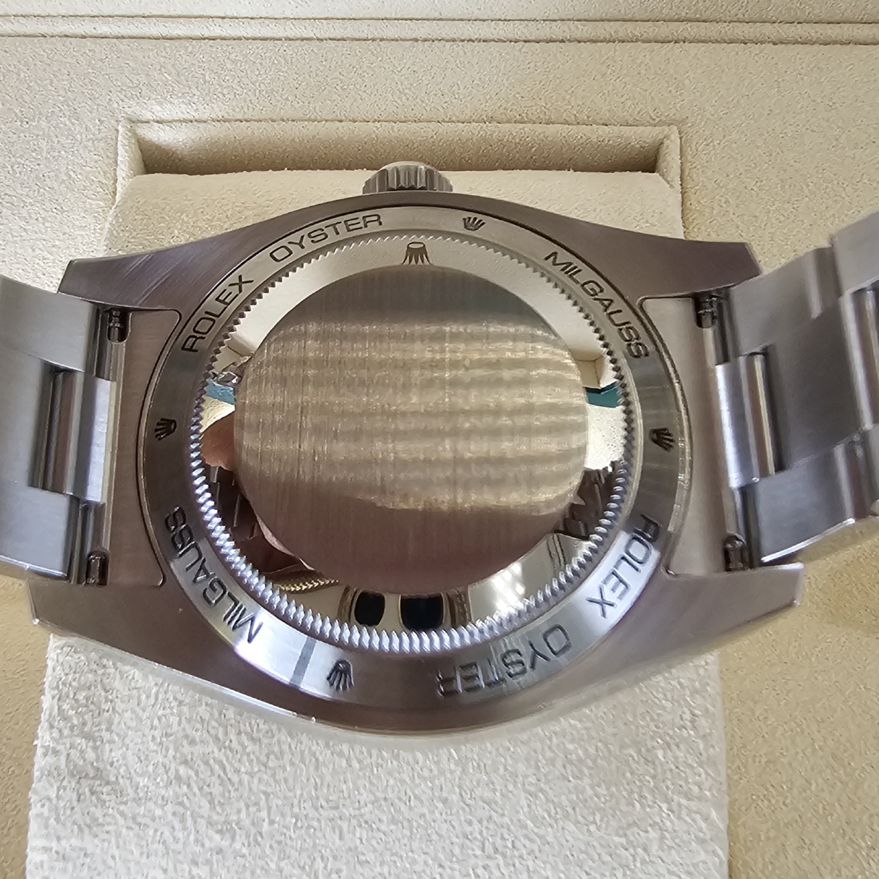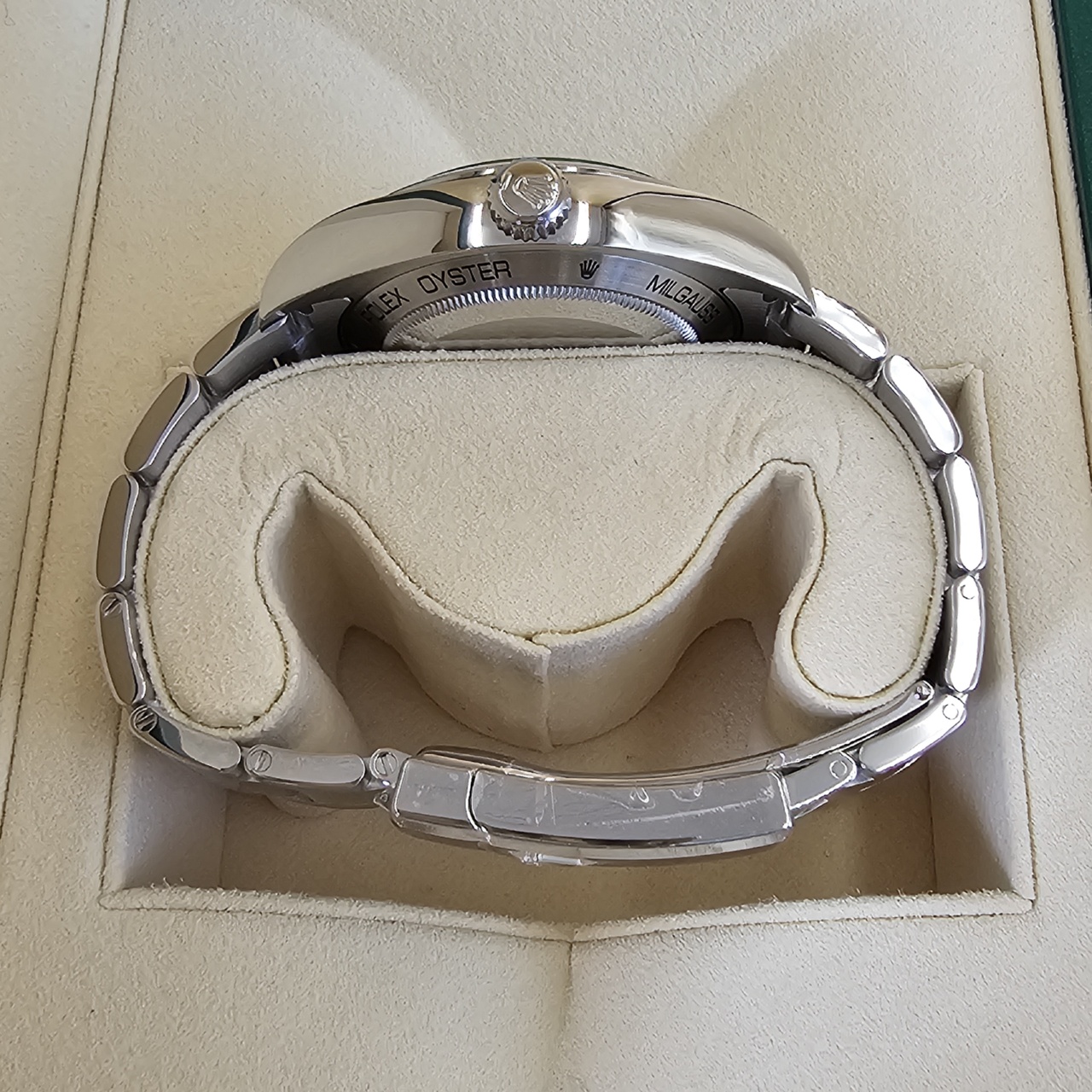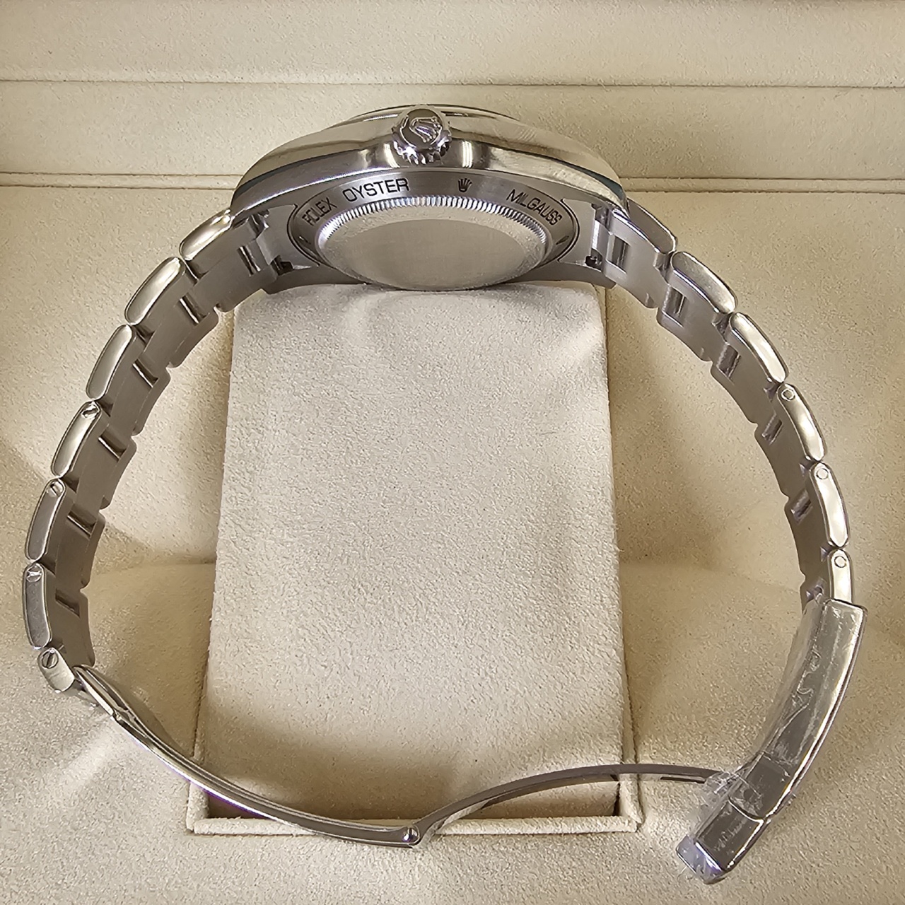The green sapphire crystal on this edition of the anti-magnetic Rolex Milgauss gives the watch a mesmerizing glow. Green is Rolex’s signature color, so it seems only fitting that the crystal on this anniversary model would also be green. No other timepiece in the Rolex catalog boasts a Glace Verte crystal, making this piece a true collector’s item