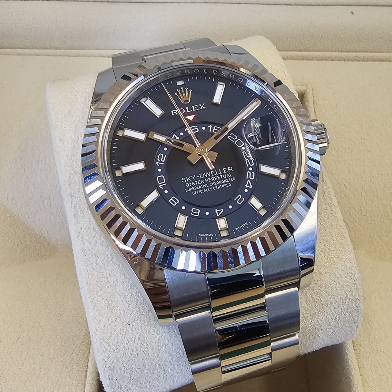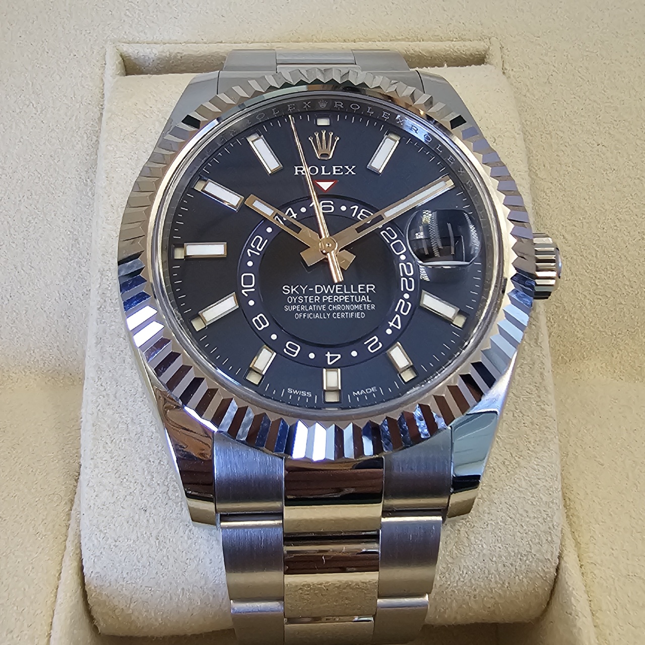 Case Material: 904L stainless steel w/ 18k white gold fluted bidirectional rotating ring command bezel, screw down case back, dual time zone, inner reflector ring engraved with serial number