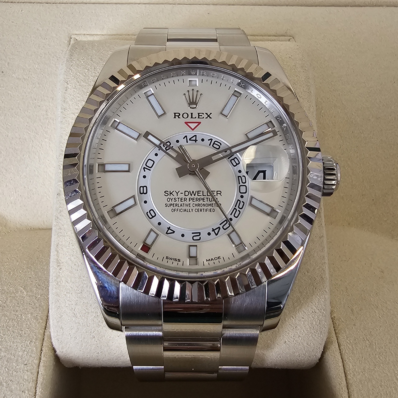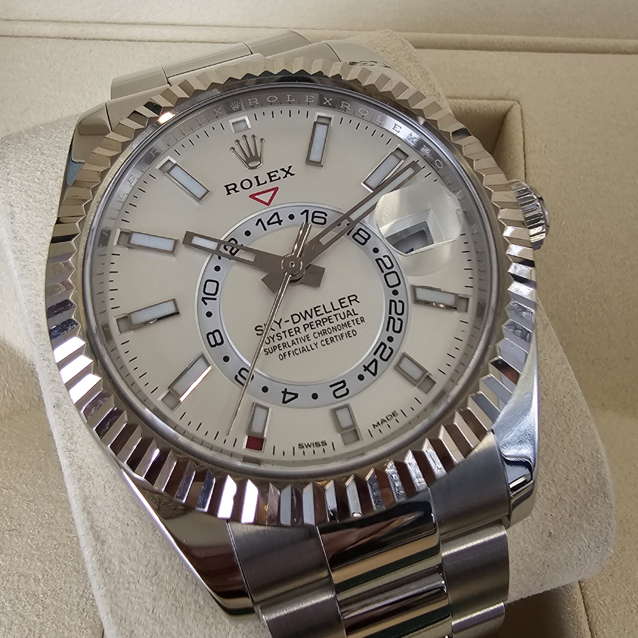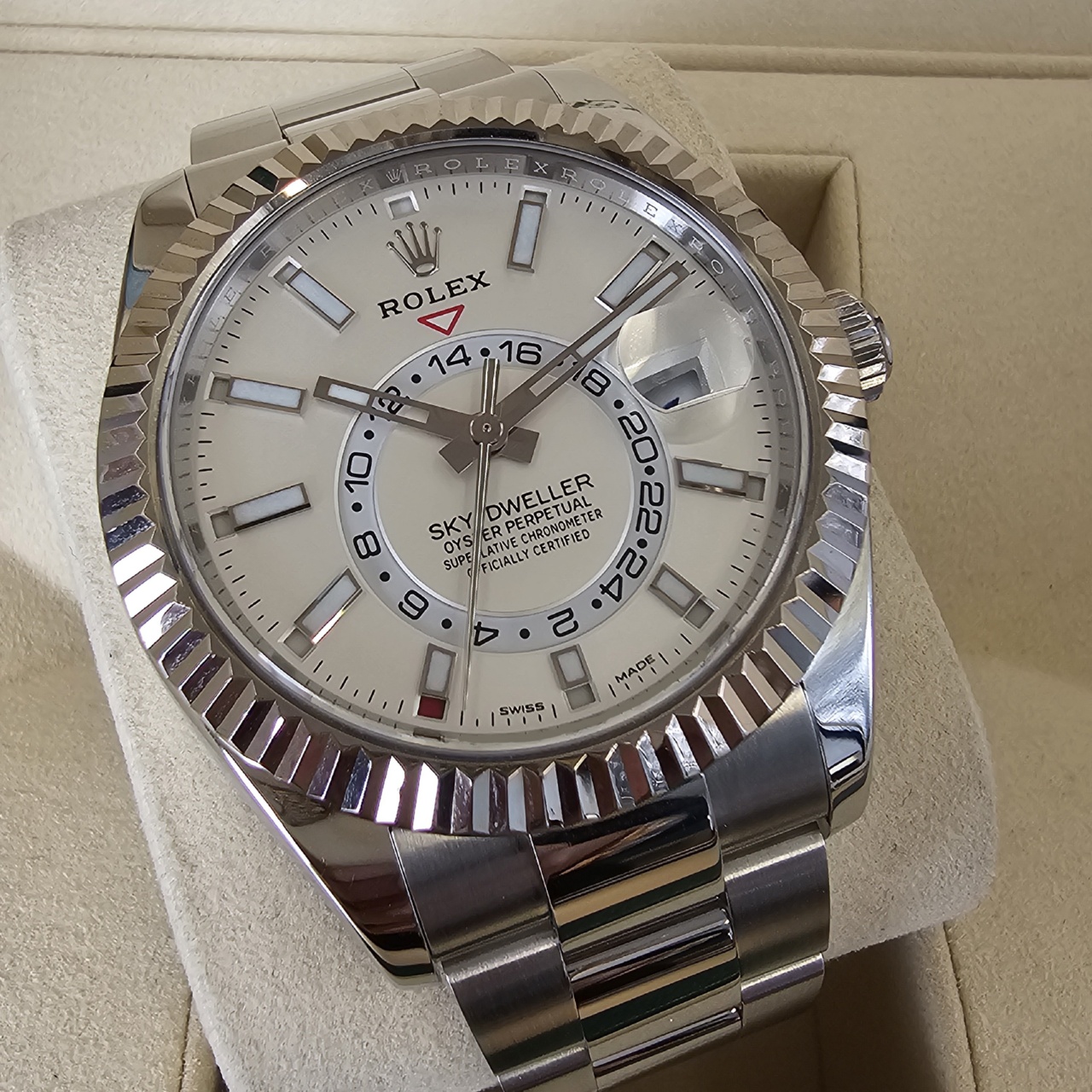 Case Material: 904L stainless steel w/ 18k white gold fluted bidirectional rotating ring command bezel, screw down case back, dual time zone, inner reflector ring engraved with serial number