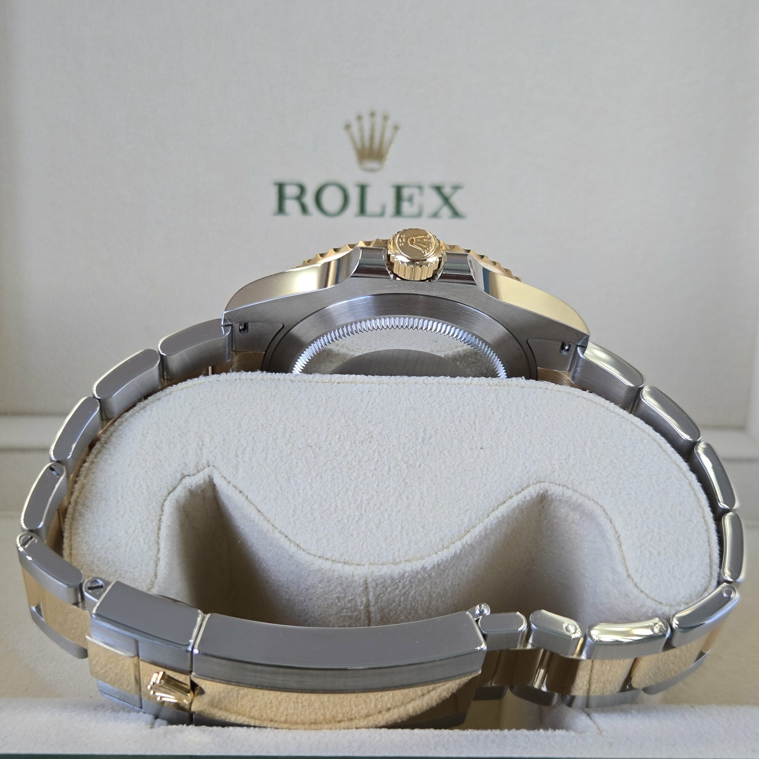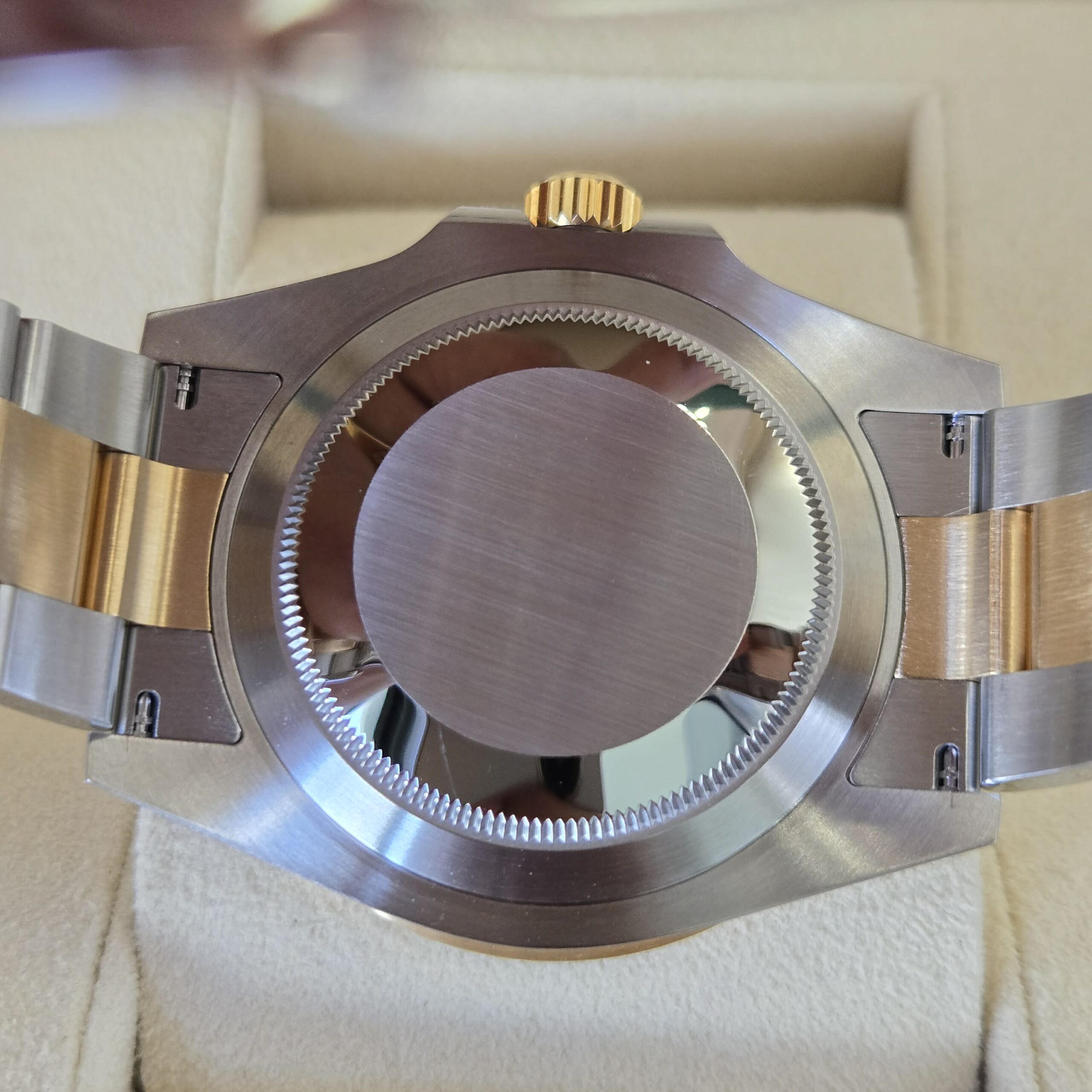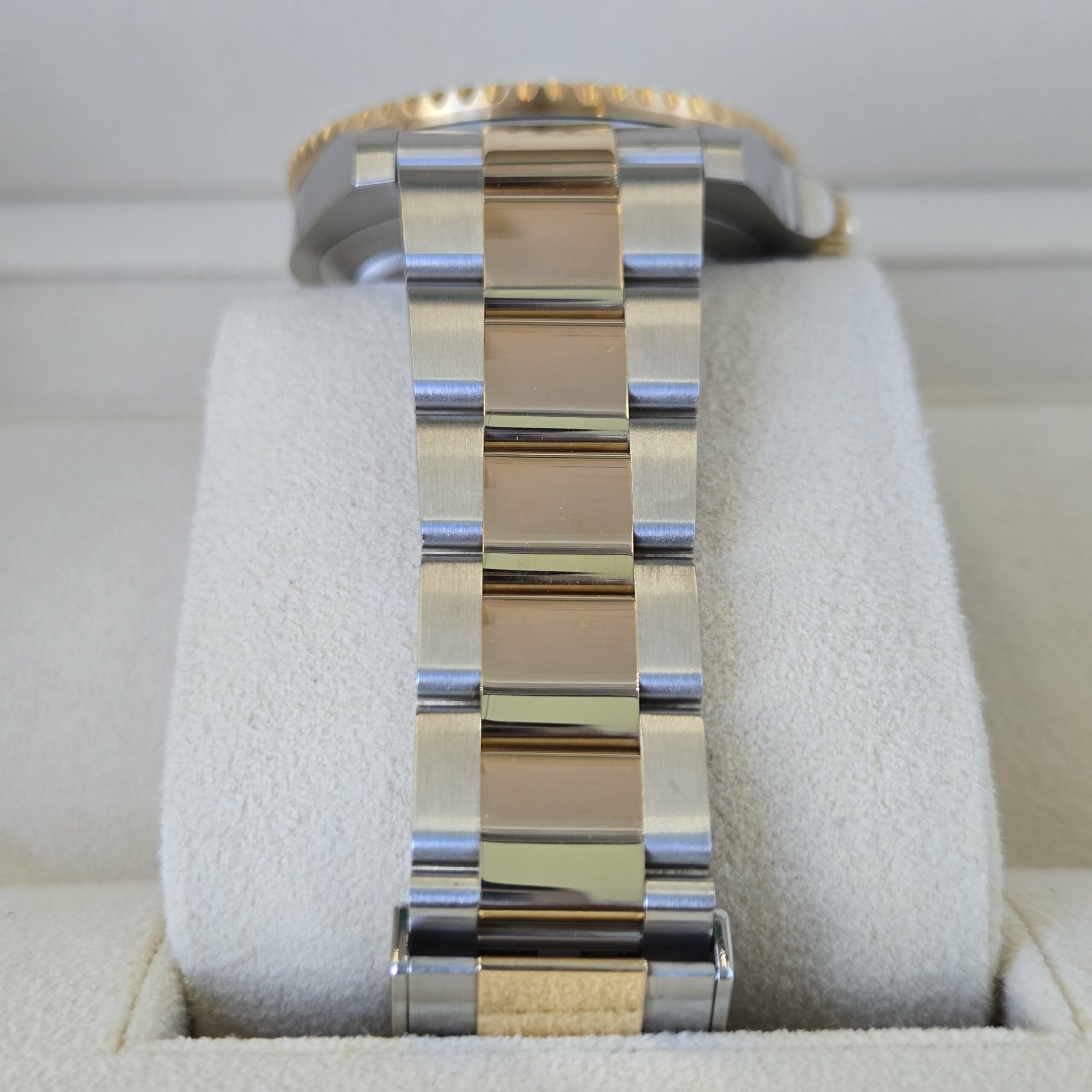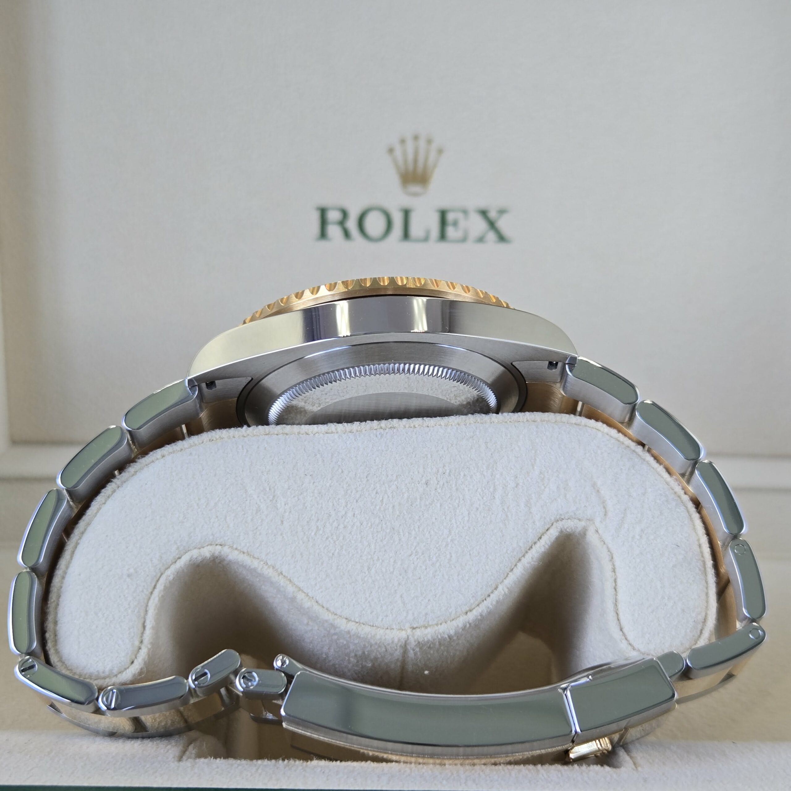 Case : Oystersteel w/ 18k yellow gold unidirectional rotating black ceramic bezel, inner reflector ring engraved with serial number.