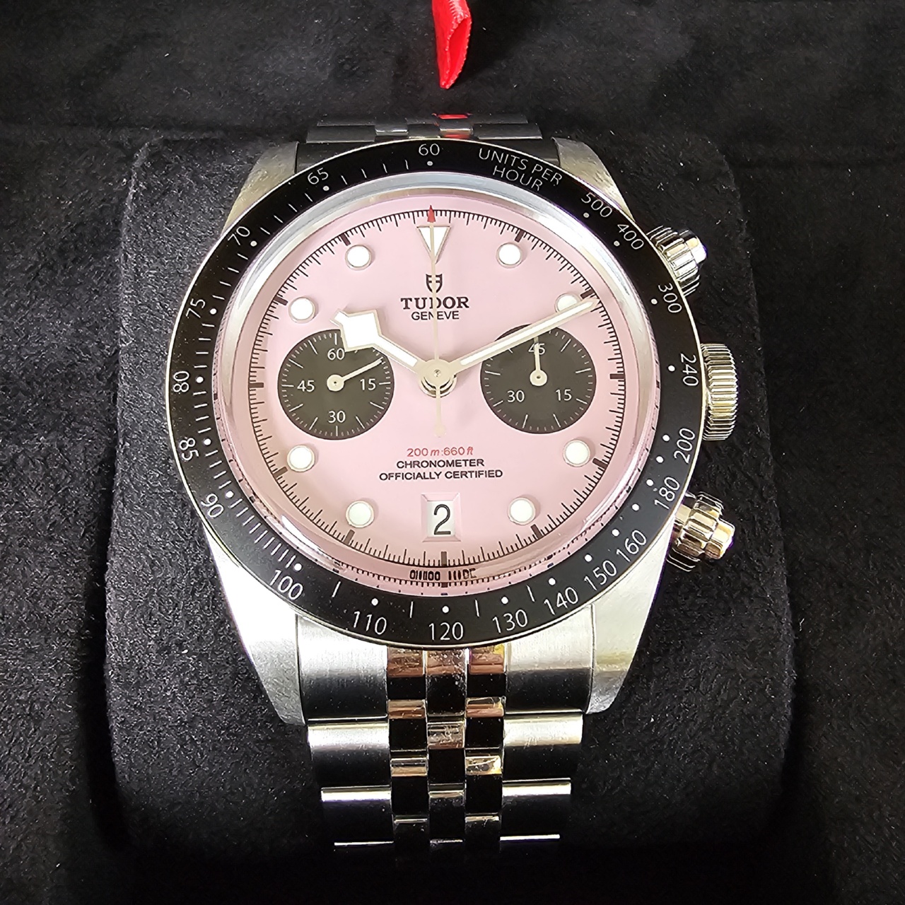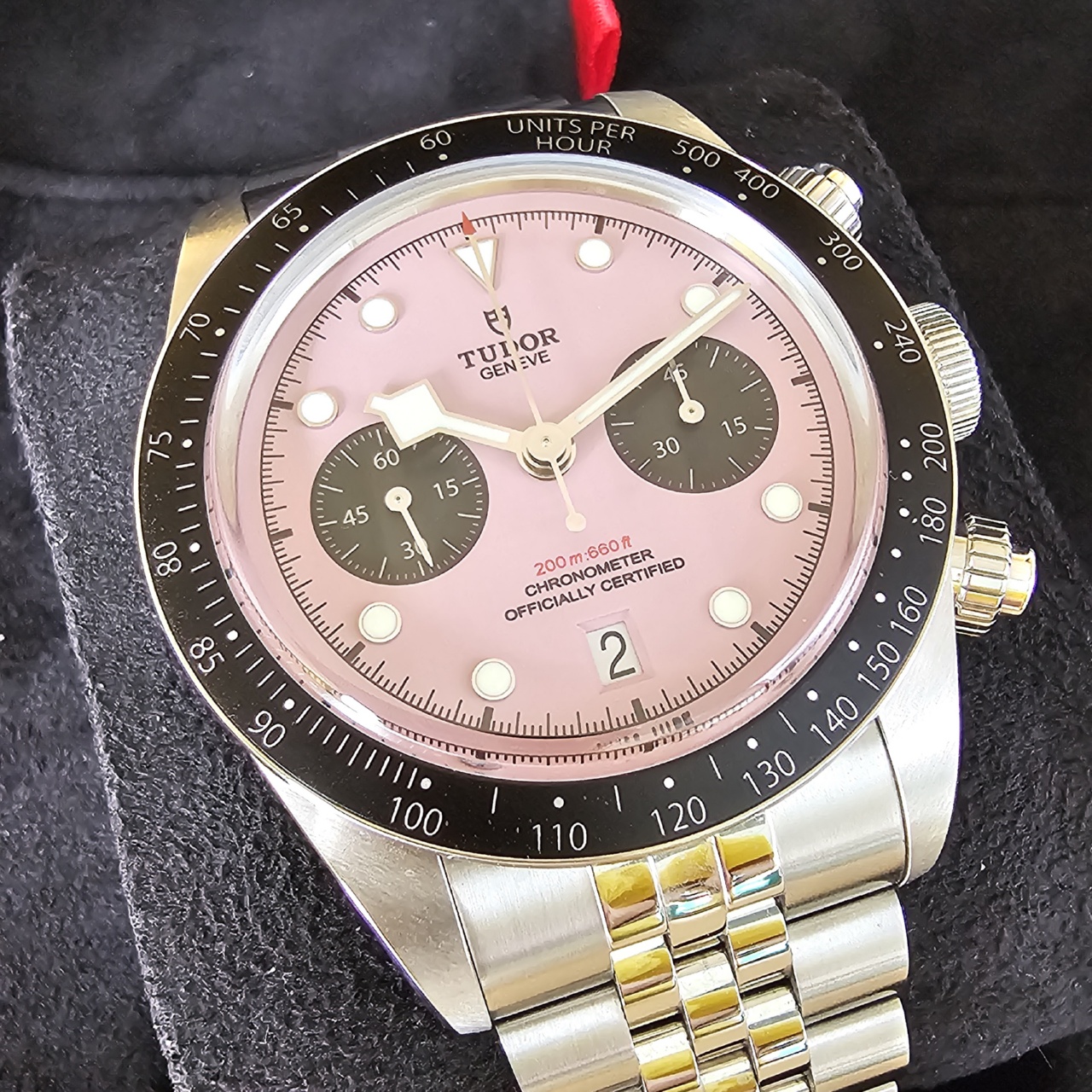 Dial: Pink with black counters, domed. Date at 6 o’clock