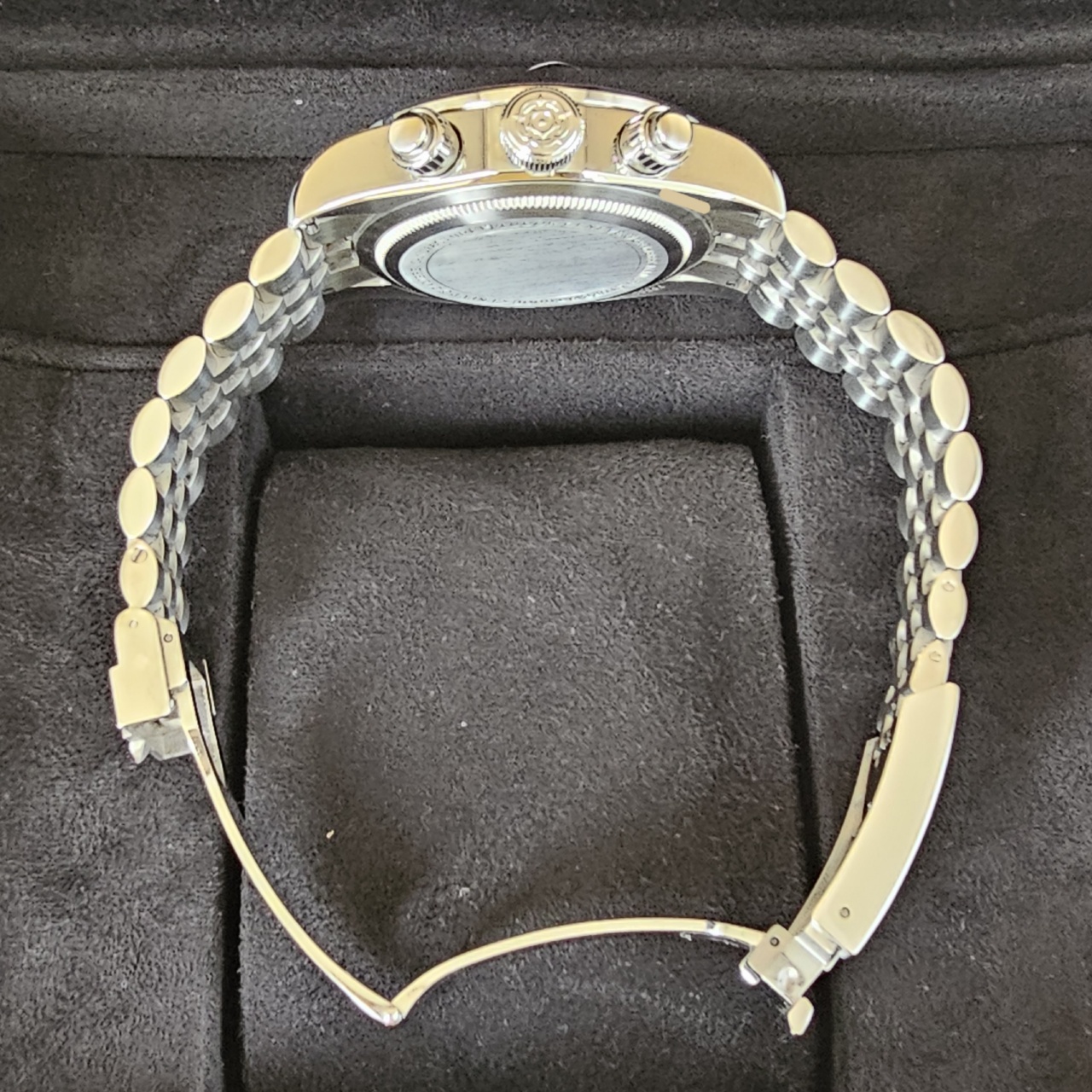 Case: Stainless steel w/ fixed matt black anodized tachymetric scale and silver markings