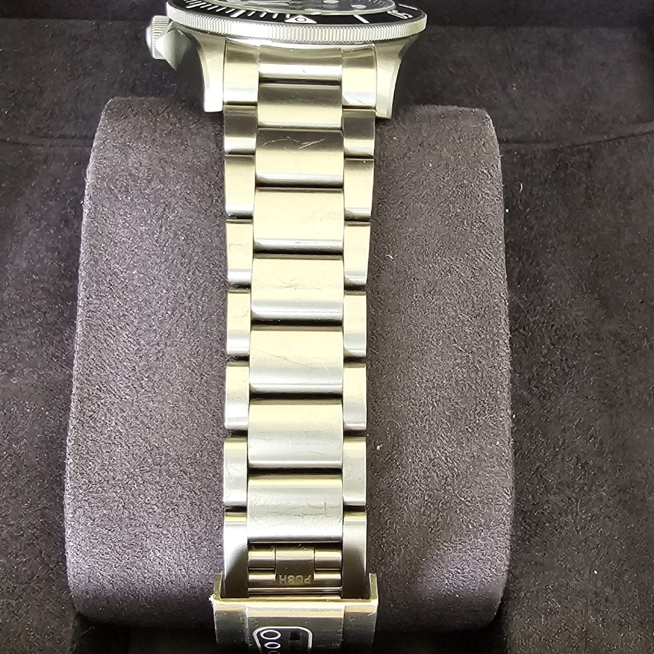 Case Material: Titanium and steel case with satin finish w/ Unidirectional rotatable bezel in titanium, graduated over 60 minutes with ceramic matt black disc and graduations with white luminescent material