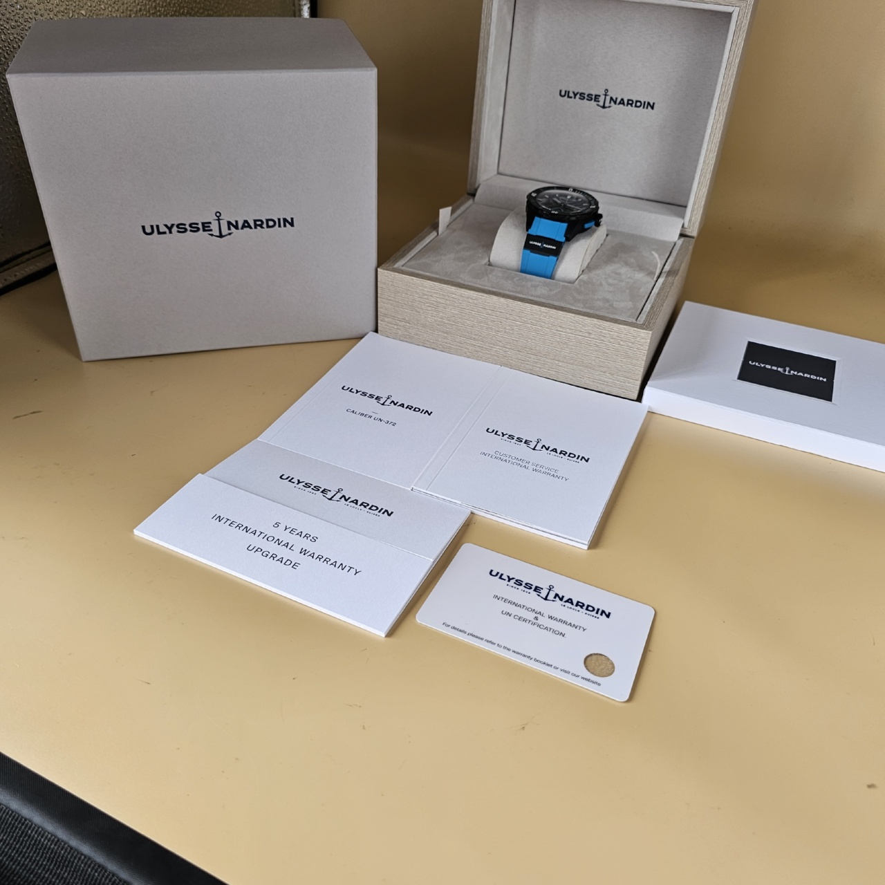 Warranty: This watch comes with One Year Luxury Watch Limited Mechanical Warranty and a balance of Ulysse Nardin International Warranty till 2026, can can be extended for an additional 3-years with activation