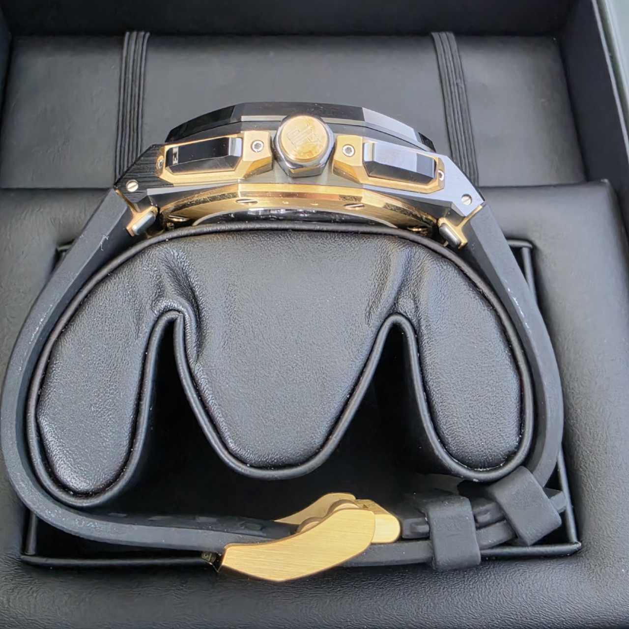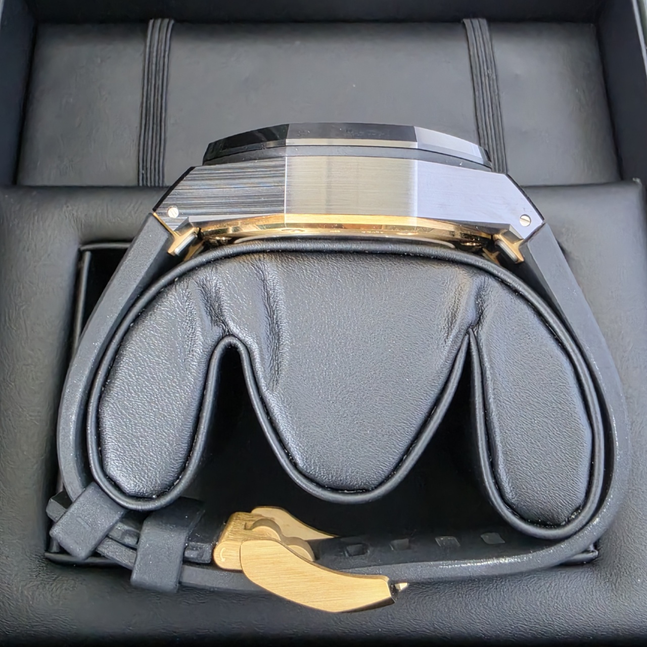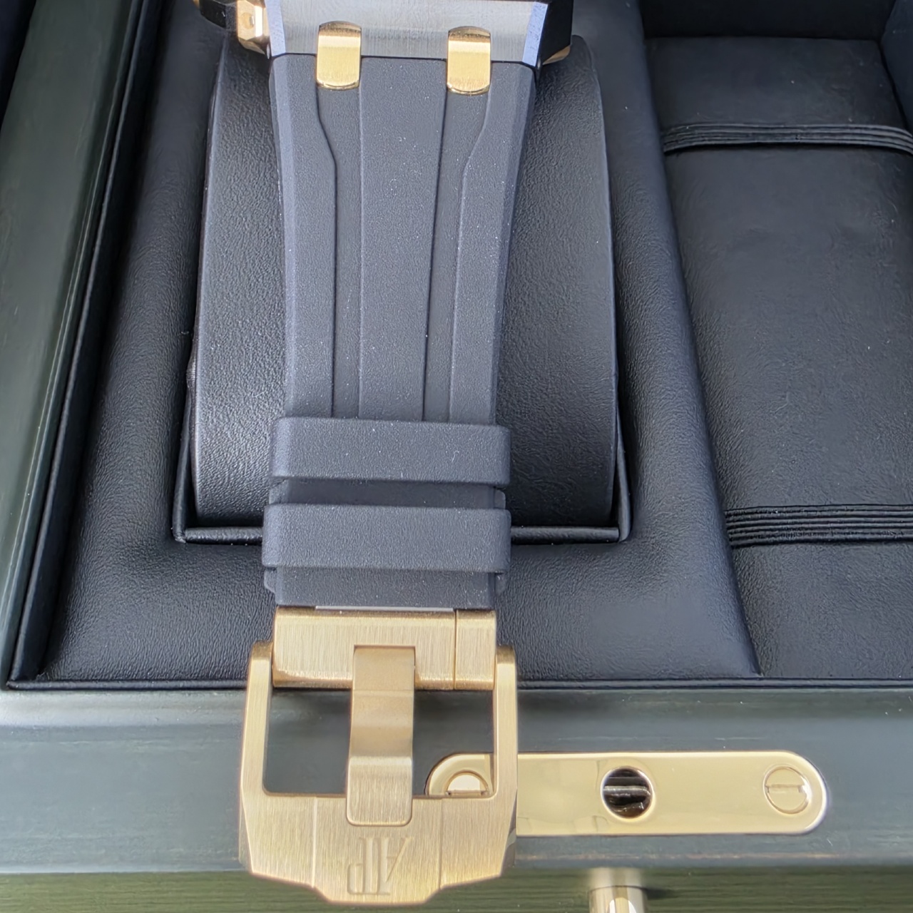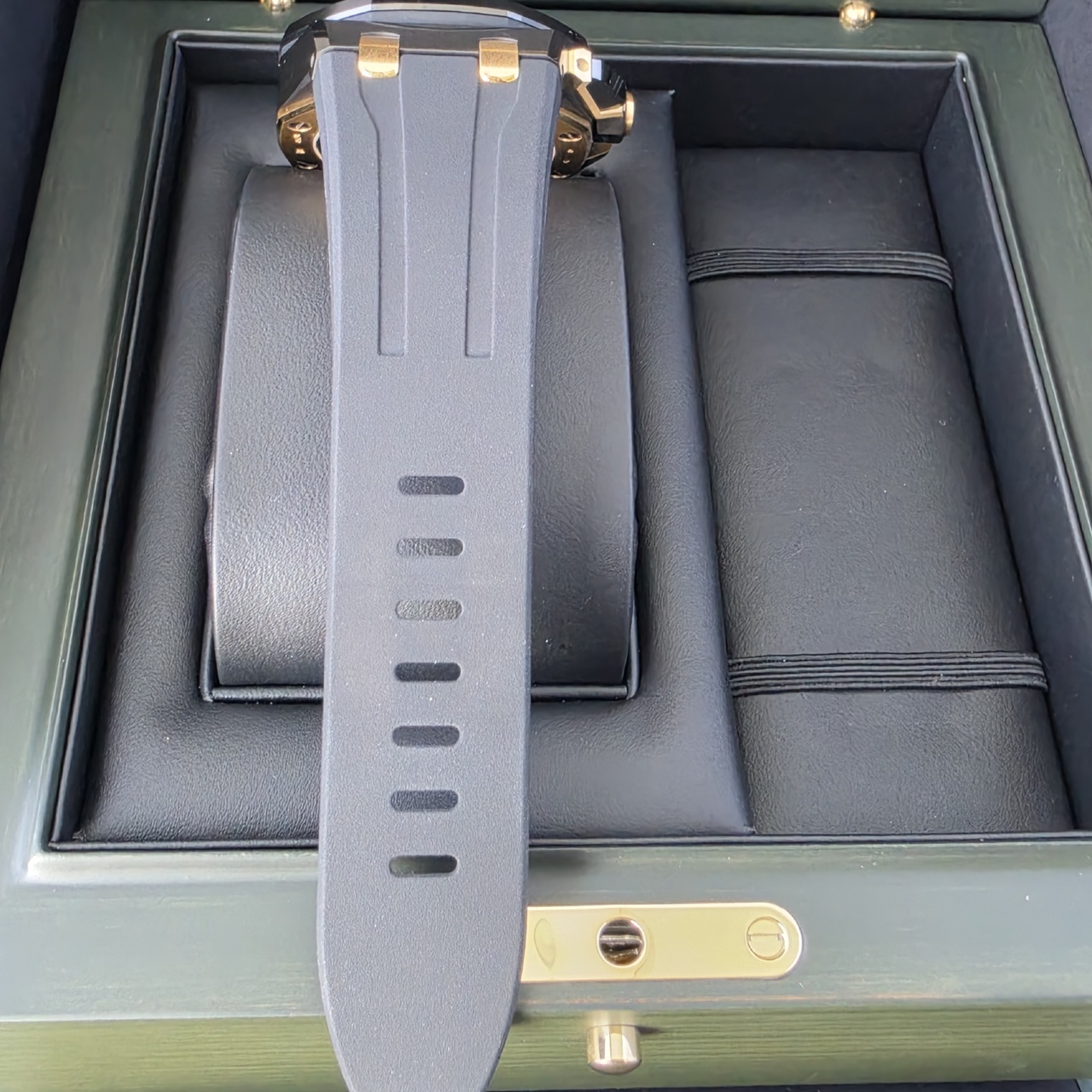 Bracelet: Black Rubber strap with Yellow Gold Tang Buckle