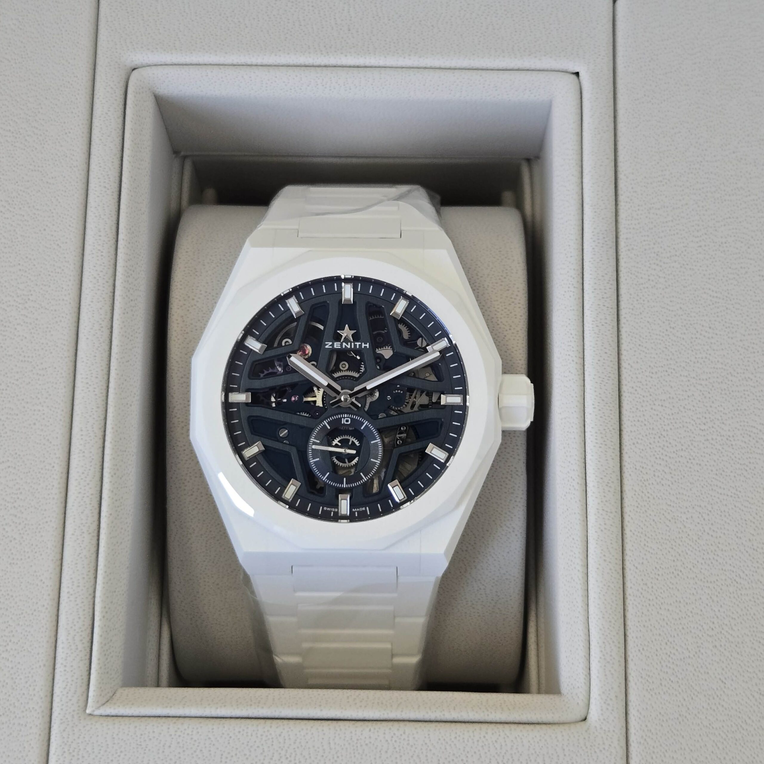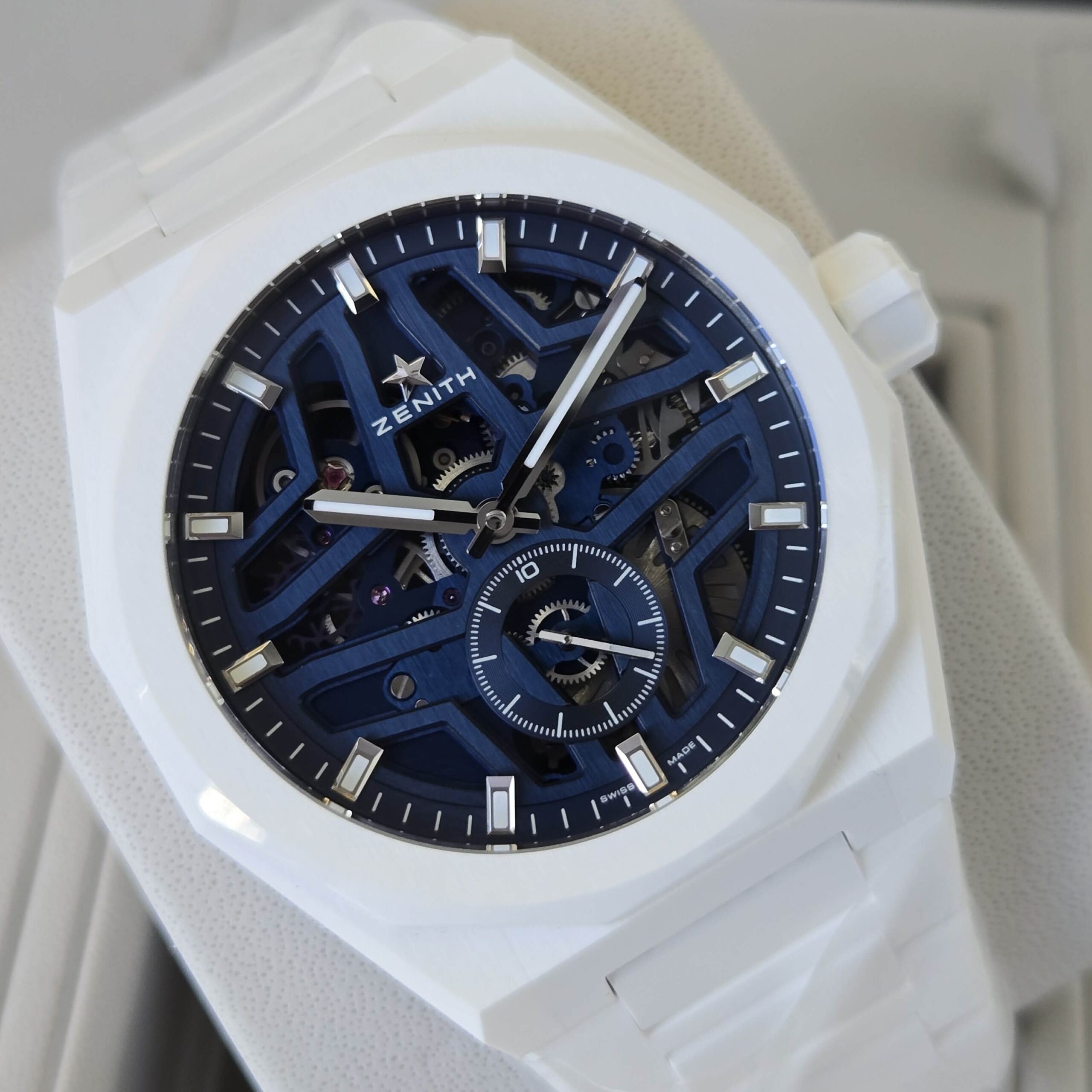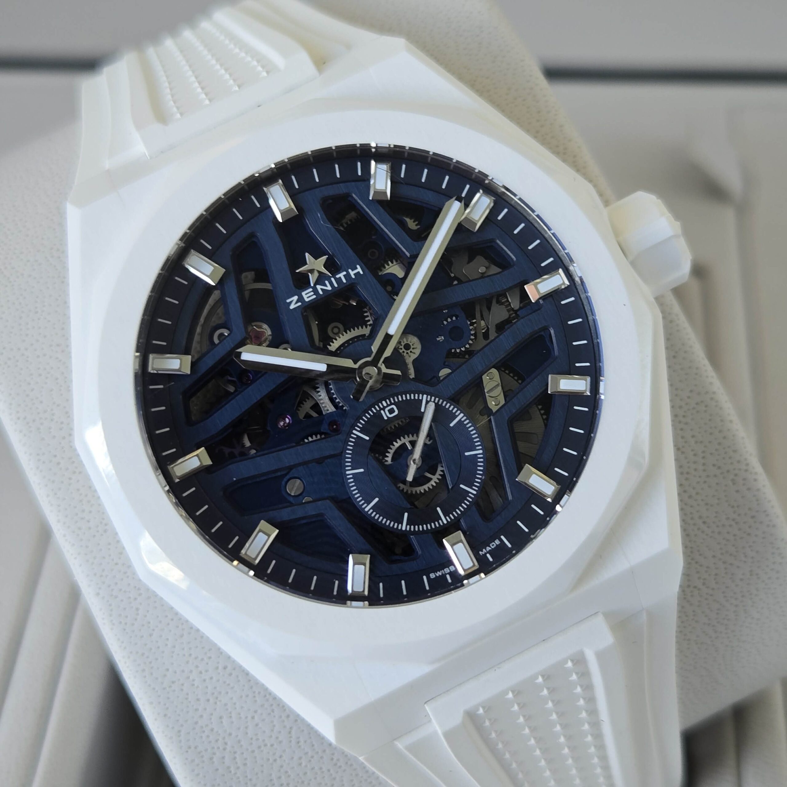 DEFY Skyline Skeleton in a 41mm white ceramic octagonal case with a faceted bezel, featuring a blue open dial revisiting the emblematic ZENITH four-pointed star. Powered by the El Primero 3620 SK high-frequency automatic manufacture skeleton movement with the very first 1/10th of a second indicator. Interchangeable ceramic bracelet, with a white patterned rubber strap. A second strap is offered to fully experience the interchangeability of the watch.