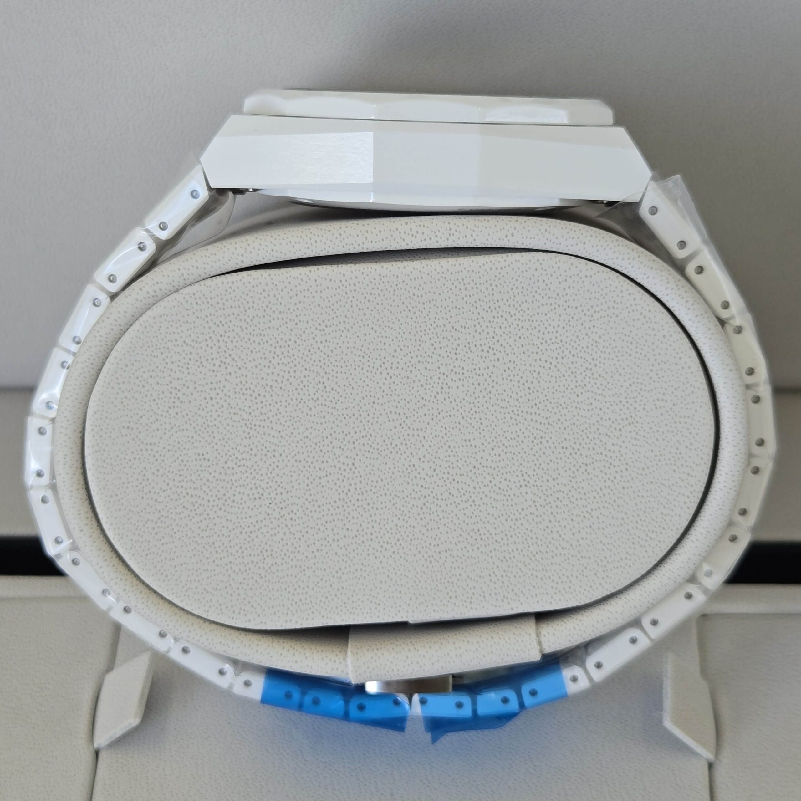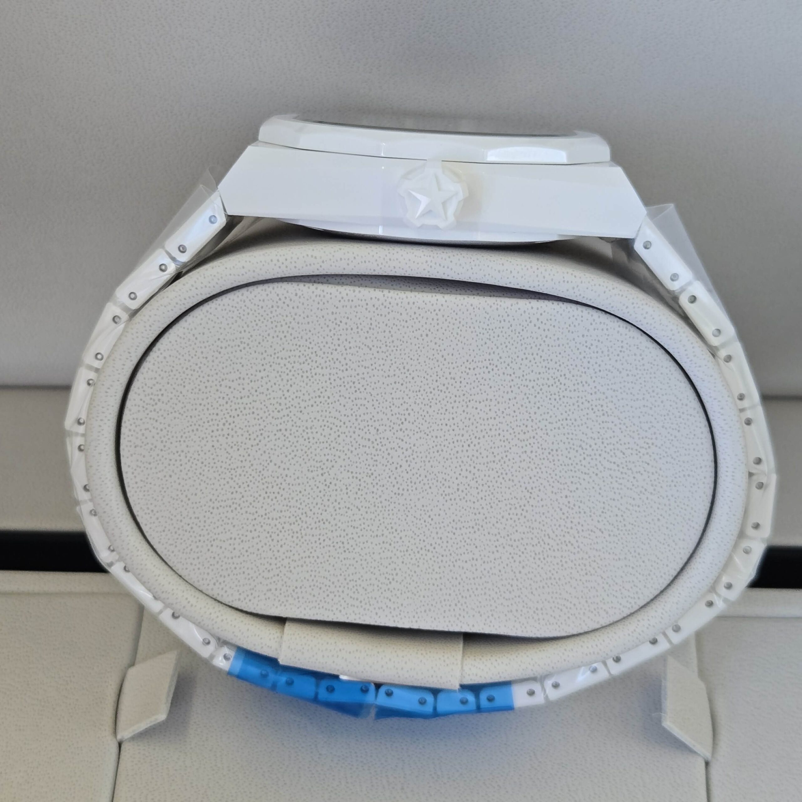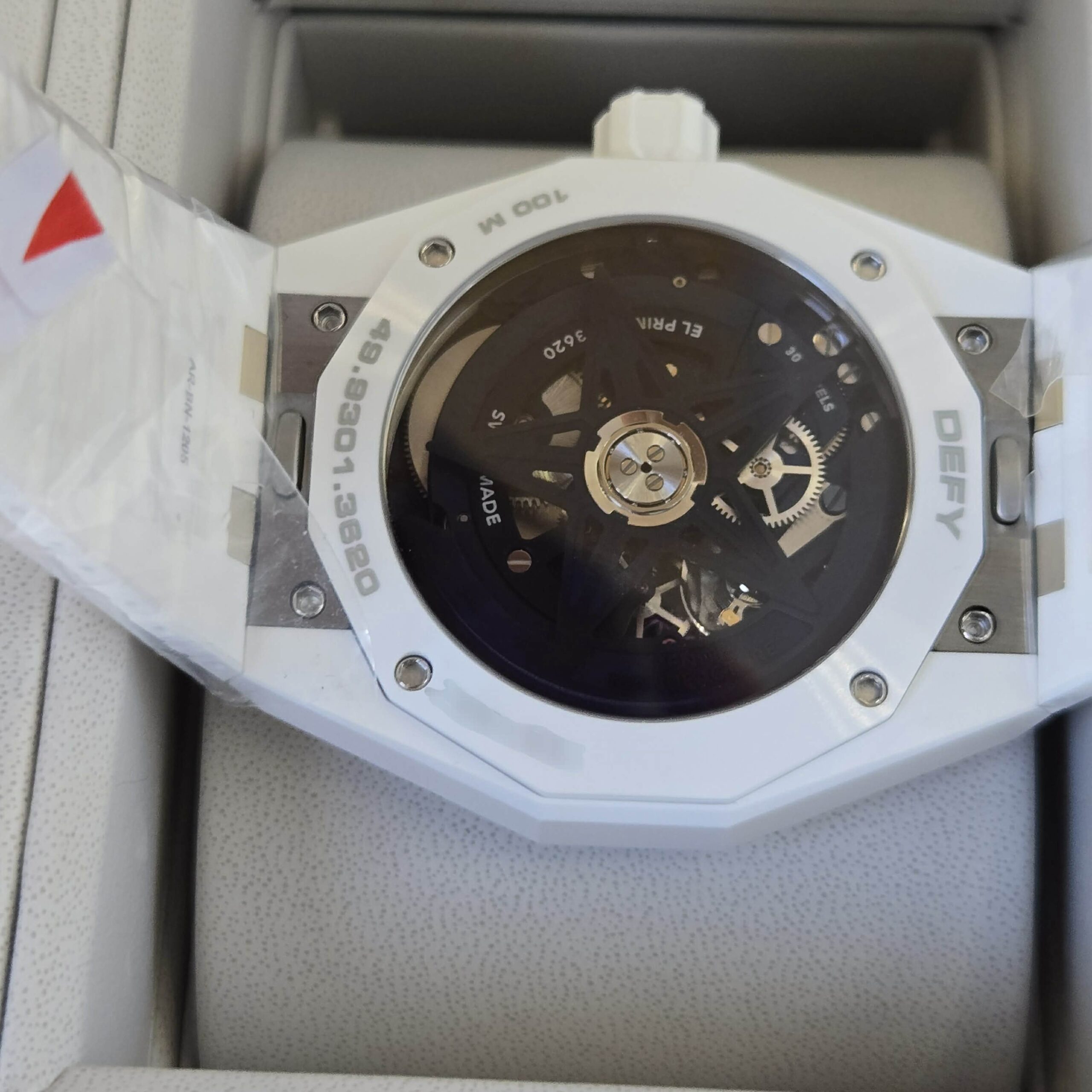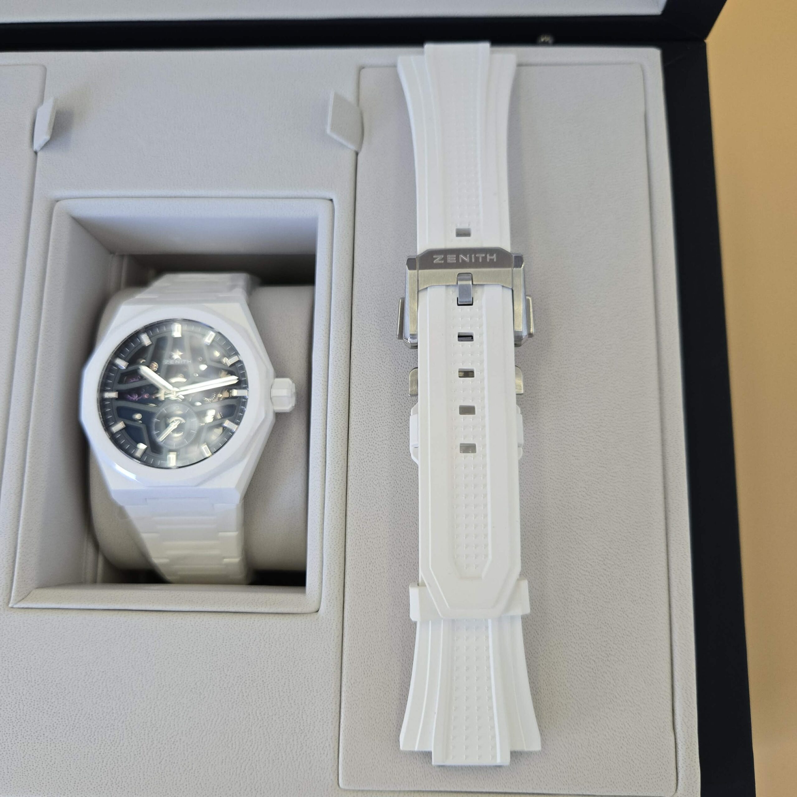DEFY Skyline Skeleton in a 41mm white ceramic octagonal case with a faceted bezel, featuring a blue open dial revisiting the emblematic ZENITH four-pointed star. Powered by the El Primero 3620 SK high-frequency automatic manufacture skeleton movement with the very first 1/10th of a second indicator. Interchangeable ceramic bracelet, with a white patterned rubber strap. A second strap is offered to fully experience the interchangeability of the watch.
